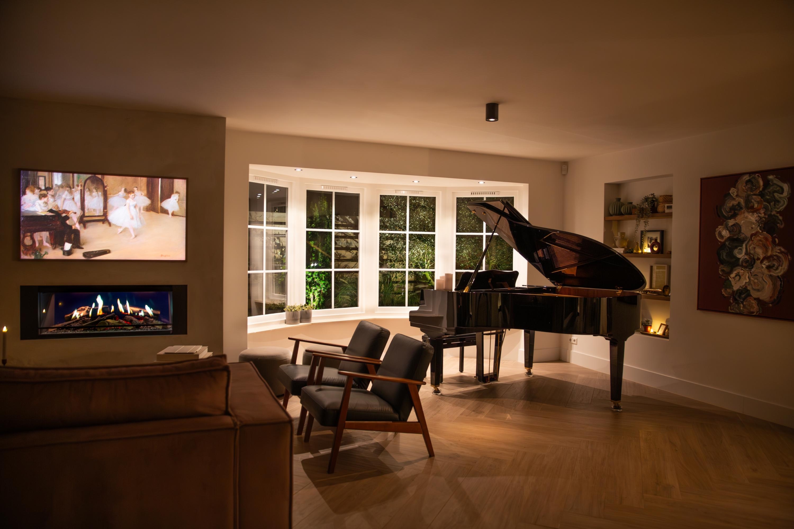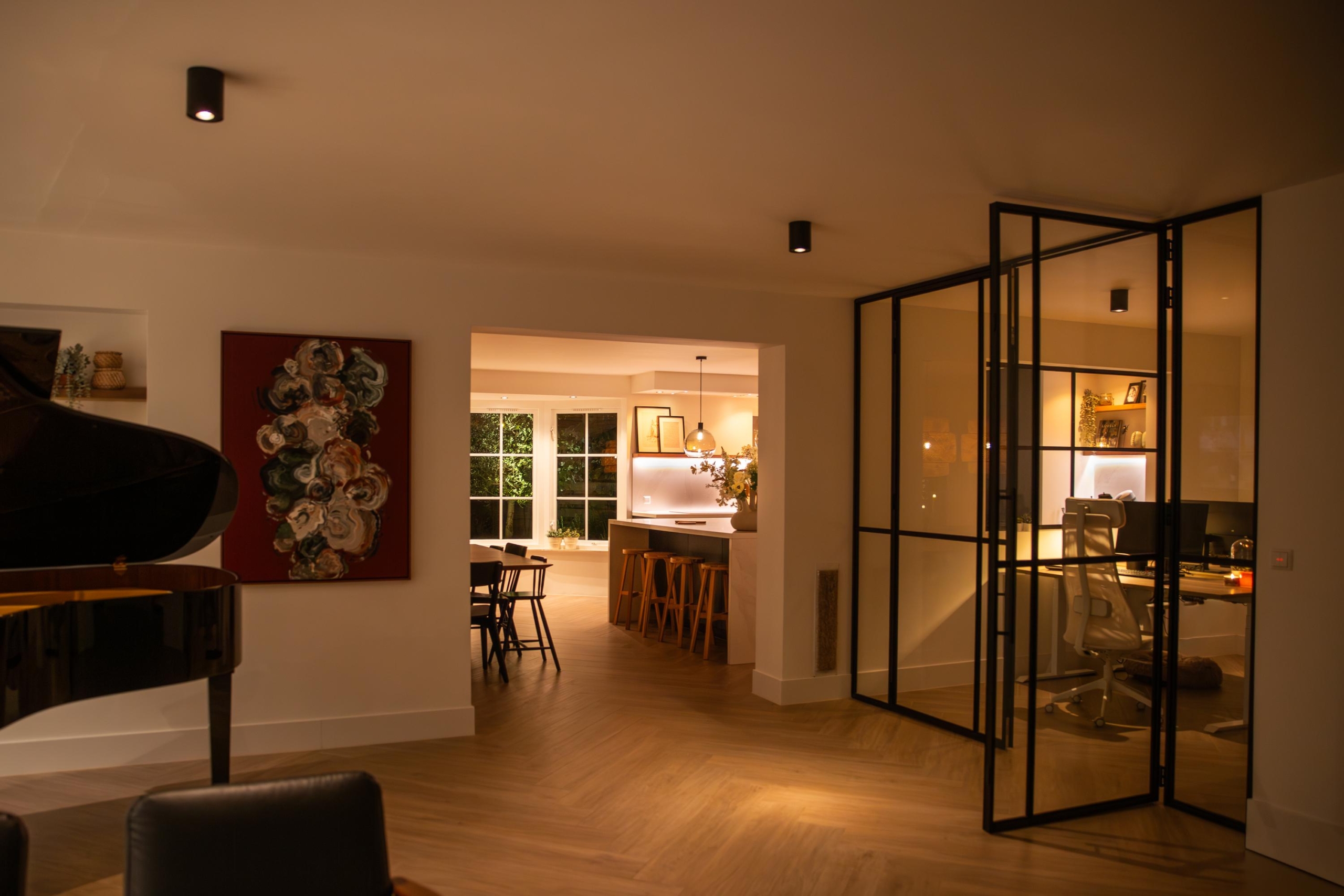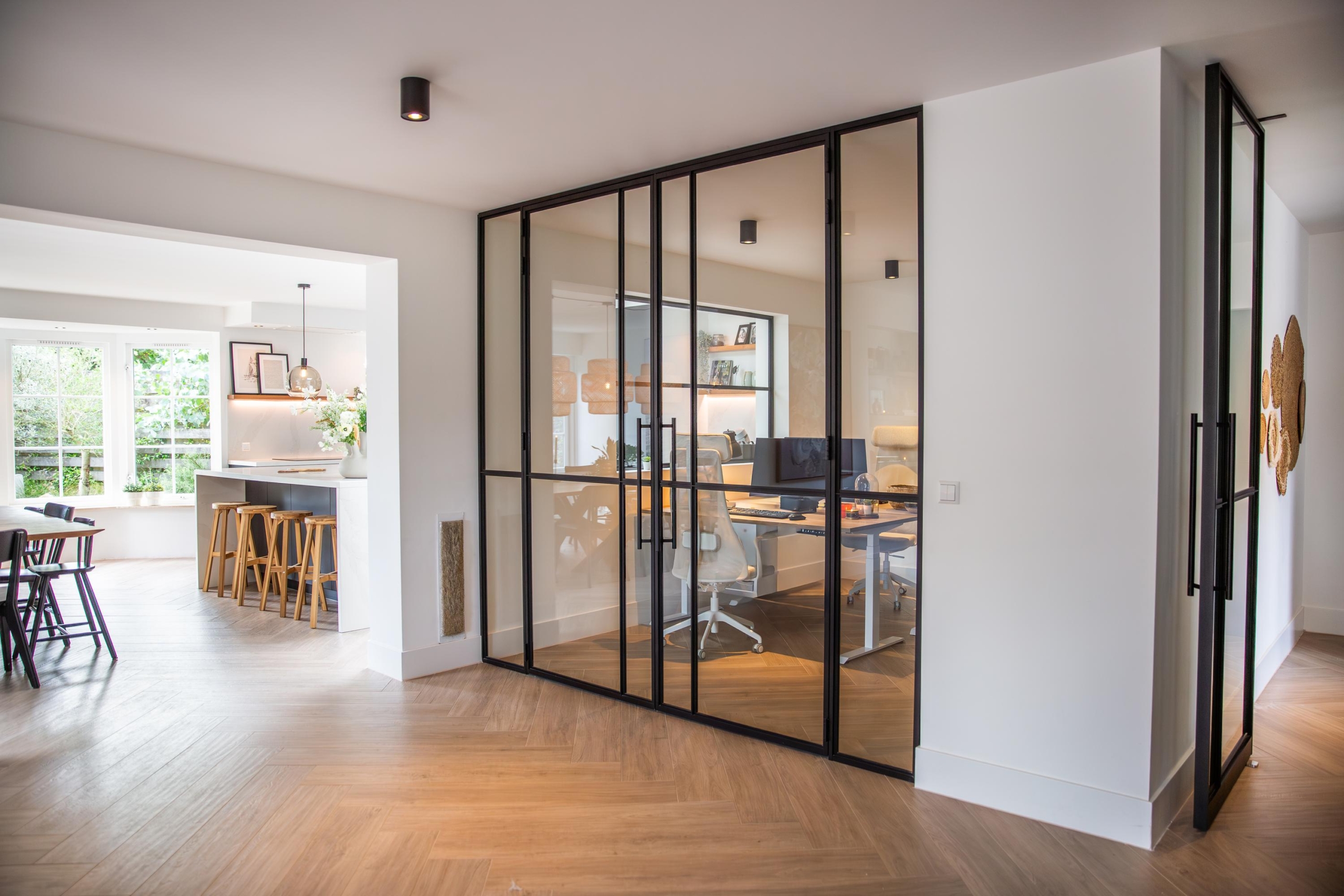 Via de voordeur stap je binnen in de lichte hal. Wat direct opvalt, is de prettige sfeer en de royale ruimte. Vanuit de hal bereik je de meterkast, het toilet, de garderobe en de inpandige garage. De deur naar de living opent naar een royale leefruimte met een brede zithoek rondom de sfeervolle Kalfire E-one haard. Grote raampartijen met Wiener Sprossen laten het daglicht rijkelijk binnenstromen en bieden uitzicht op de prachtig aangelegde tuin. Op warme dagen zorgt het elektrische zonnescherm voor een aangenaam binnenklimaat. Vanuit de living heb je toegang tot het kantoor. In de woonkamer is er één inbouwkast en één in het kantoor. De inbouwkasten zorgen voor een altijd opgeruimde uitstraling. Ideaal voor een nette werkplek of woonkamer. Dankzij de geluiddempende taatsdeuren kun je deze ruimte flexibel gebruiken als rustige werk-, hobby-, speel- of muziekruimte.