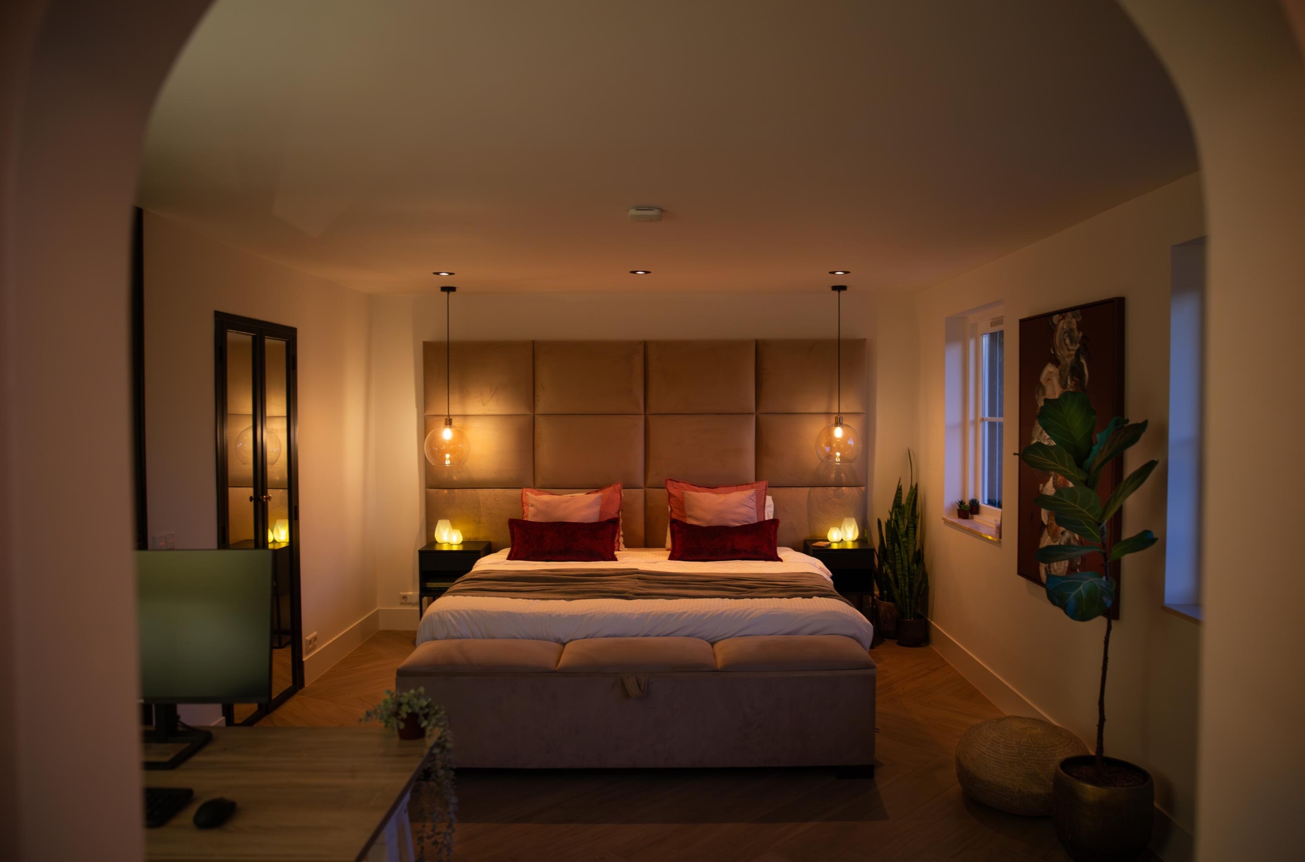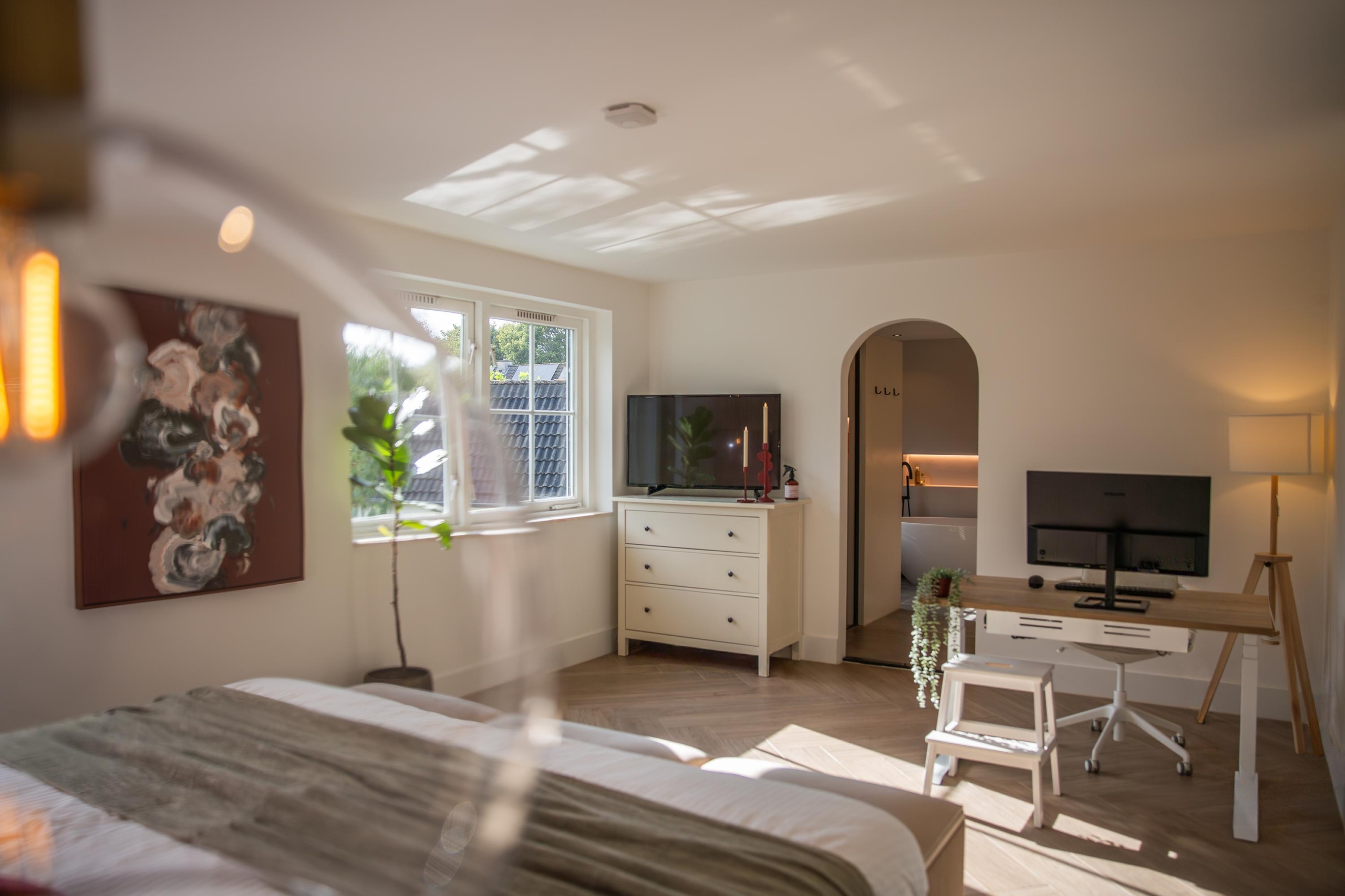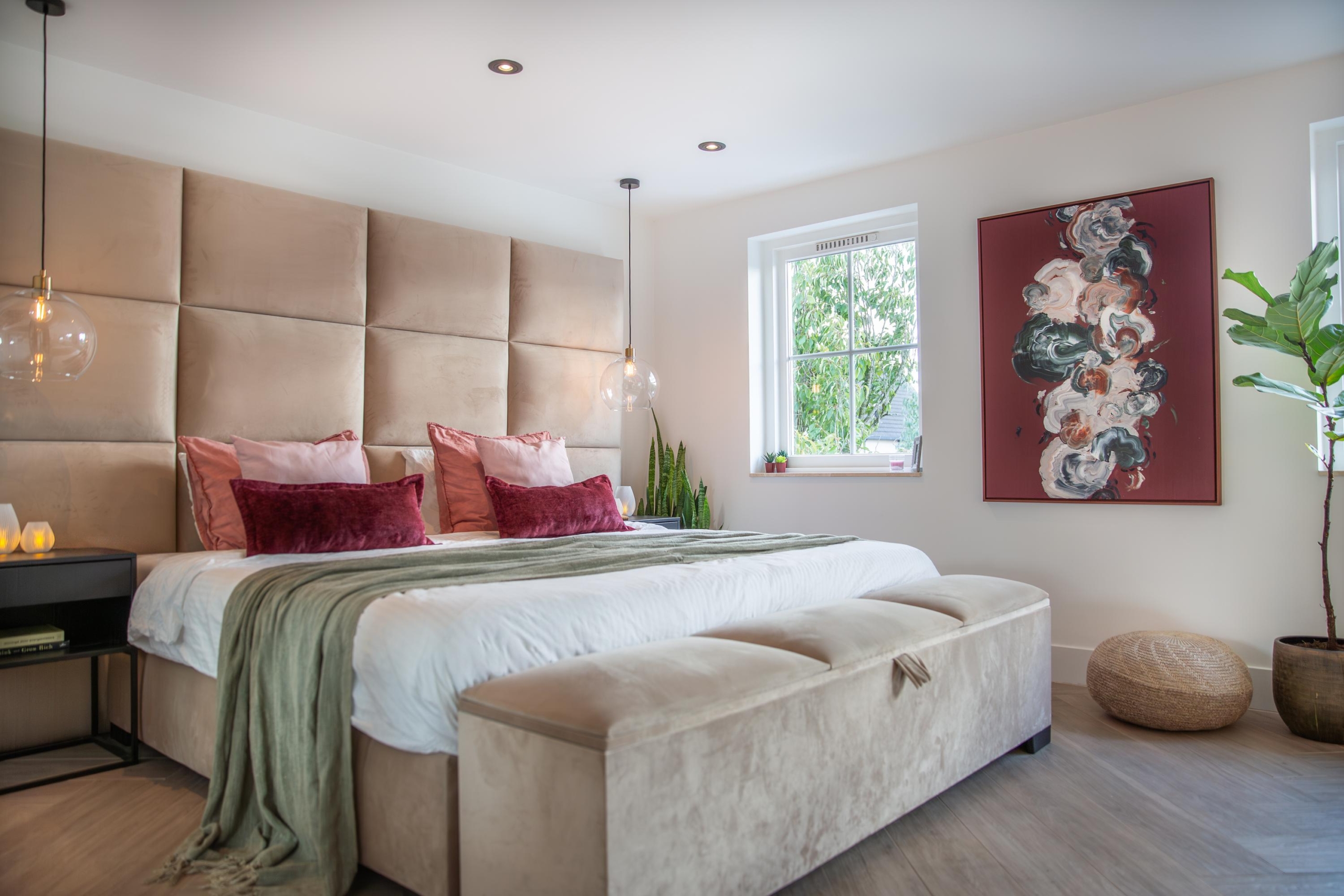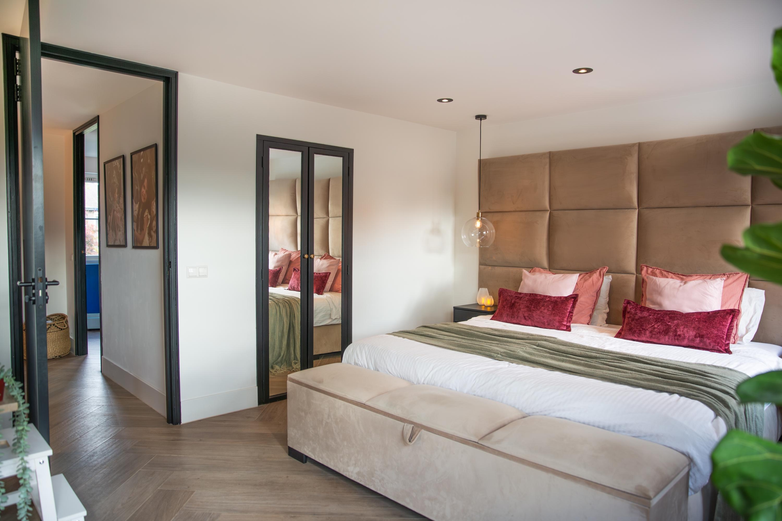 De master bedroom voelt aan als een luxe hotelkamer. Hier is voldoende ruimte voor een kingsize bed van 200 x 200 cm en is voorzien van een walk-in closet. De ensuite badkamer ademt luxe en ontspanning en is voorzien van: een vrijstaand bad, een ruime inloopdouche met verlichte nissen, een stijlvol eiken meubel met ingebouwde opladers en vloerverwarming. Zelfs in de douche!