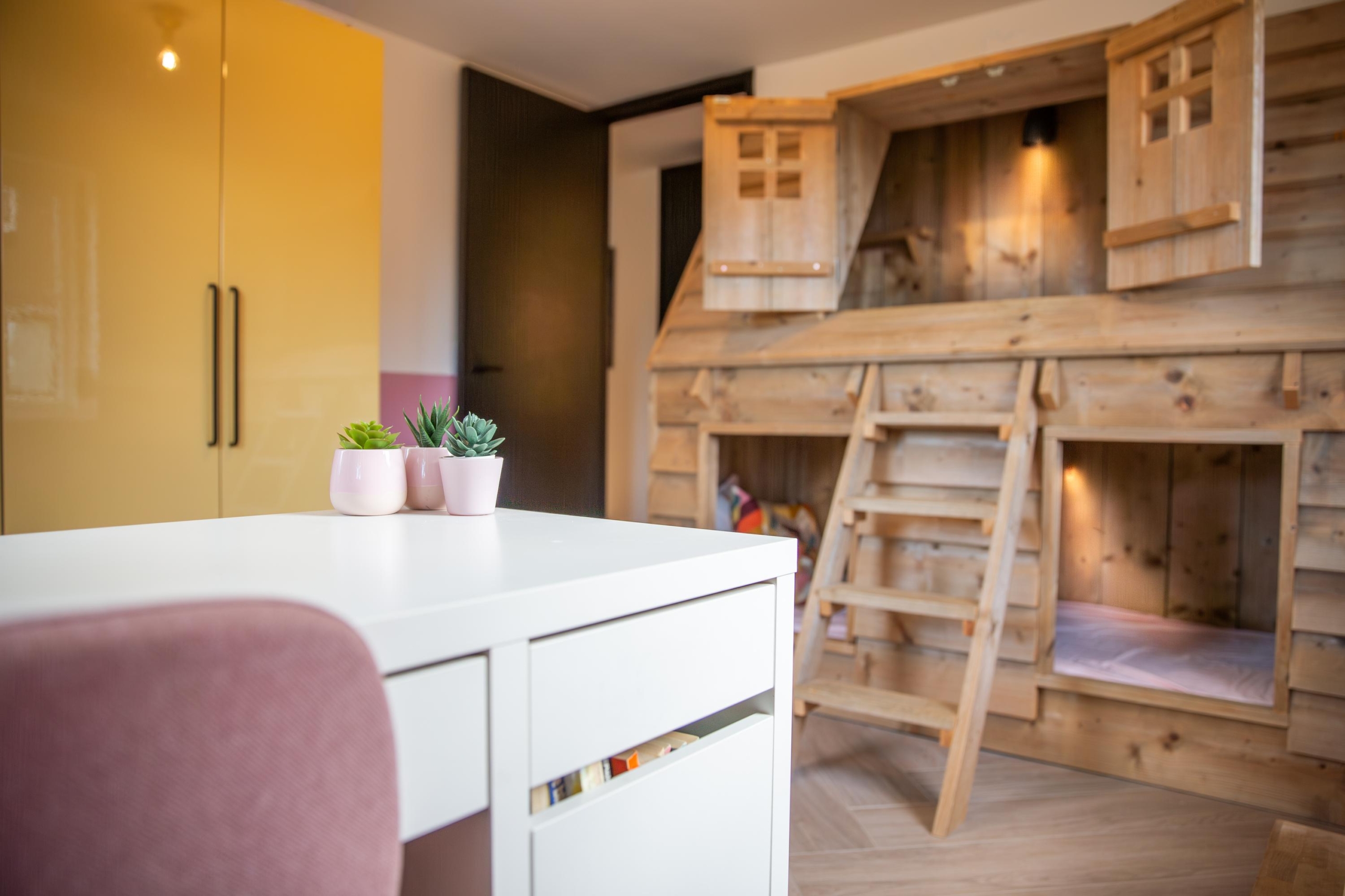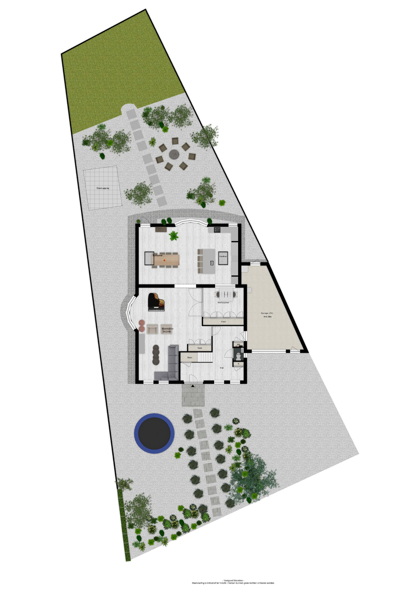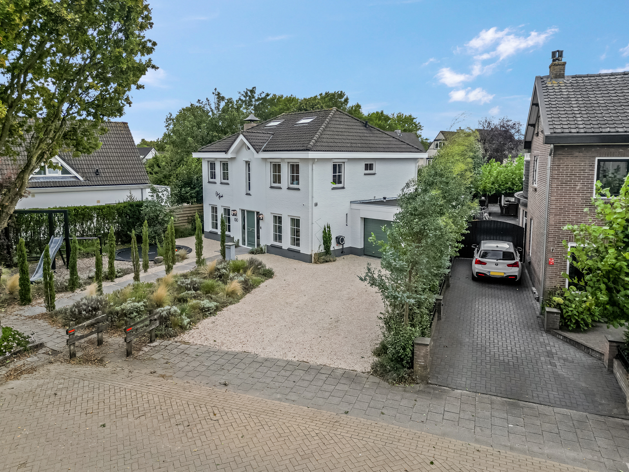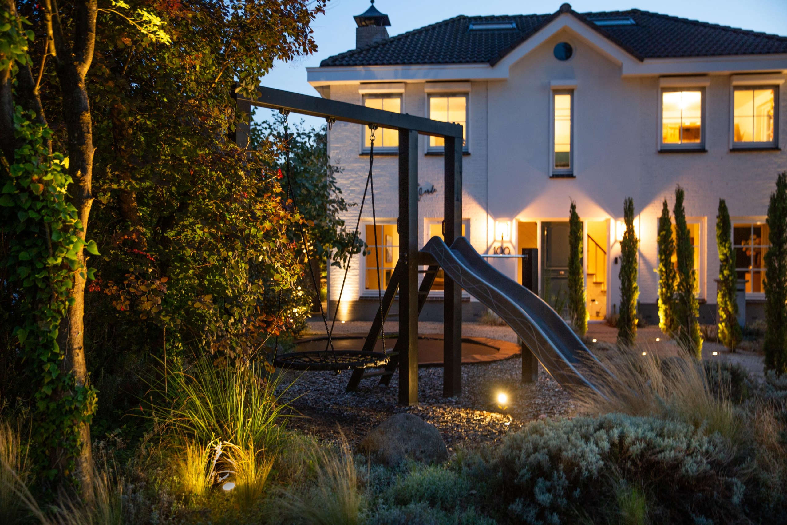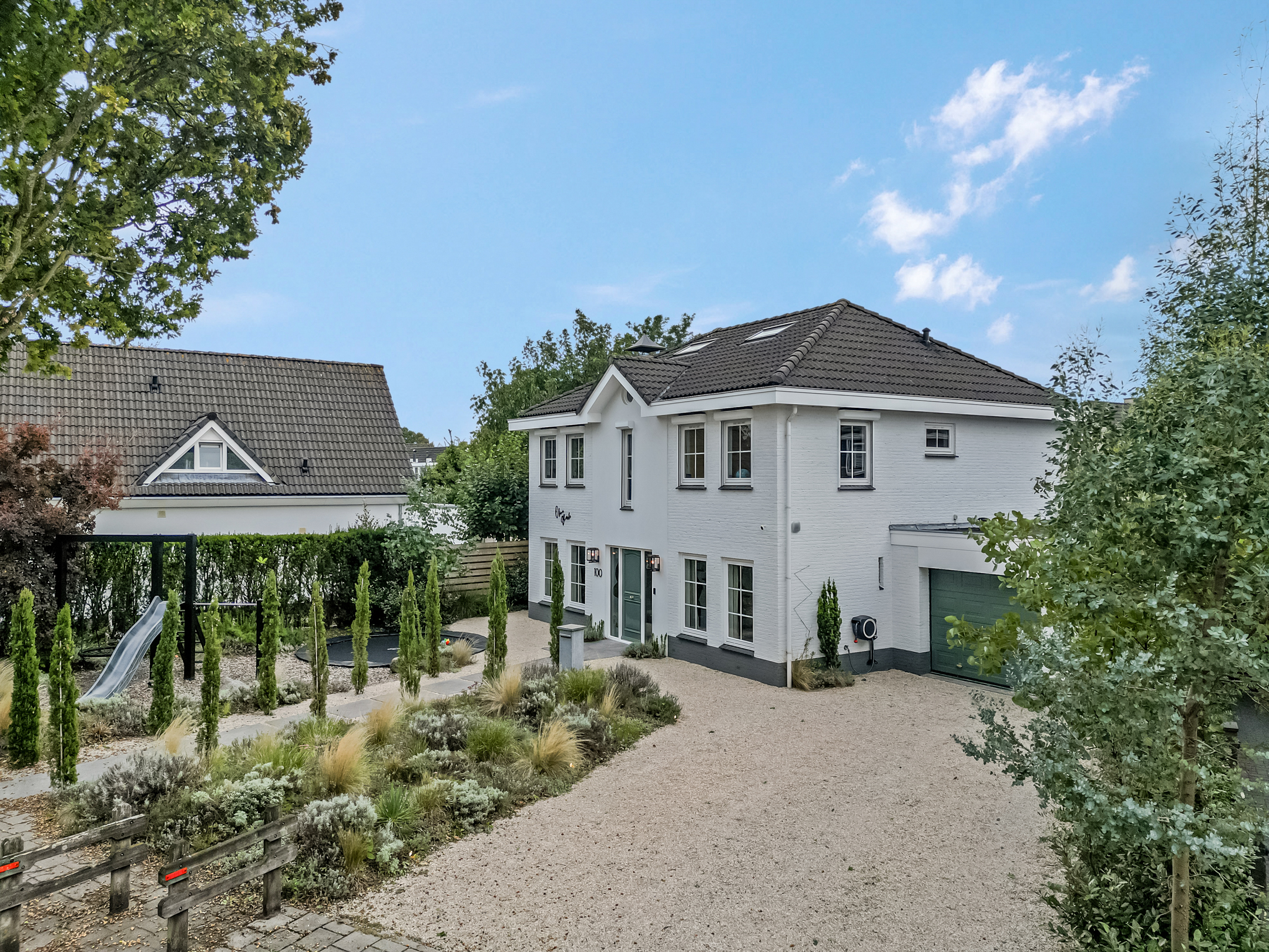 Via de voortuin met ruime oprit en parkeergelegenheid bereik je de woning. Voor de woning is ruimte om meerdere auto’s te parkeren, wat extra praktisch is voor bezoek of een groot gezin. Maar de voortuin biedt meer dan alleen gemak: hier vind je een eigen speeltuin met trampoline, duikelstang, glijbaan en schommel. Een echt speelparadijs voor de kinderen direct voor de deur!