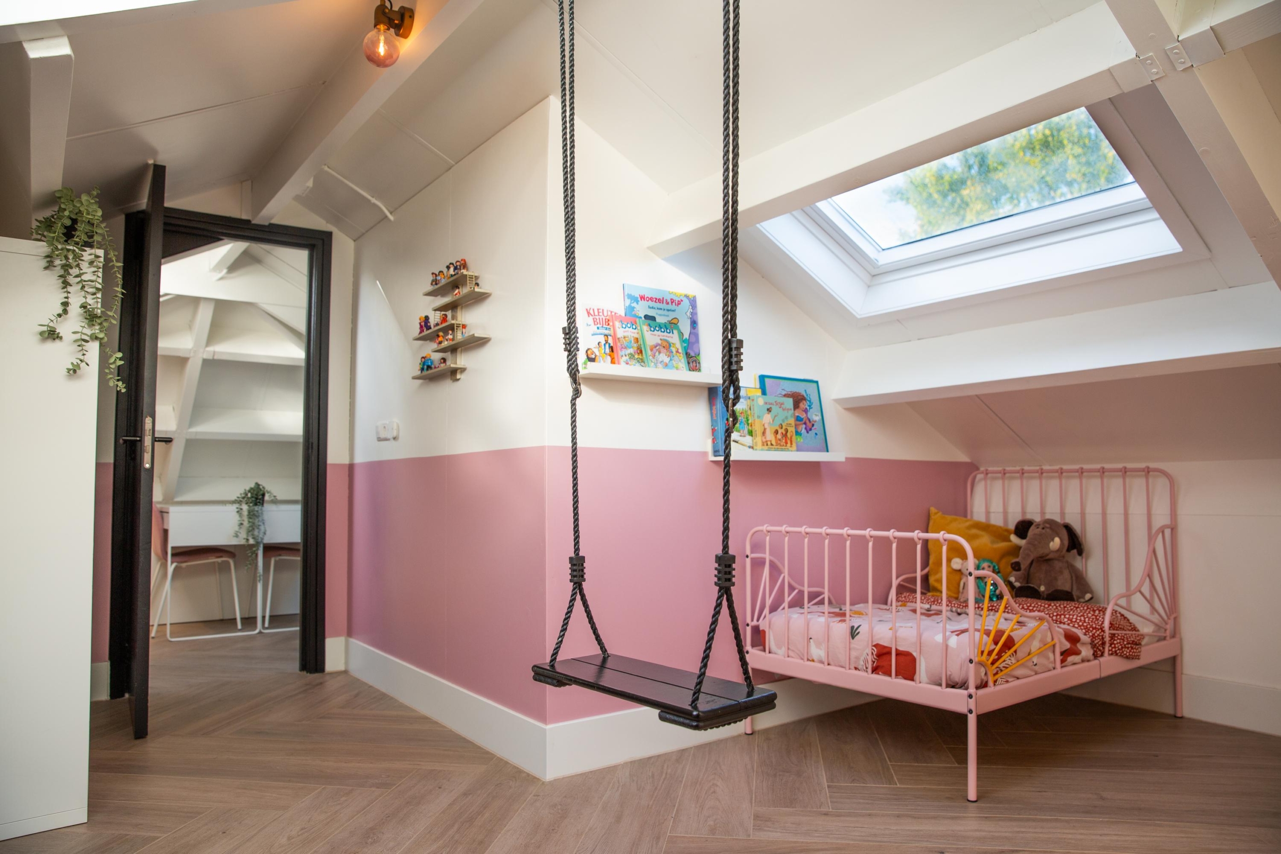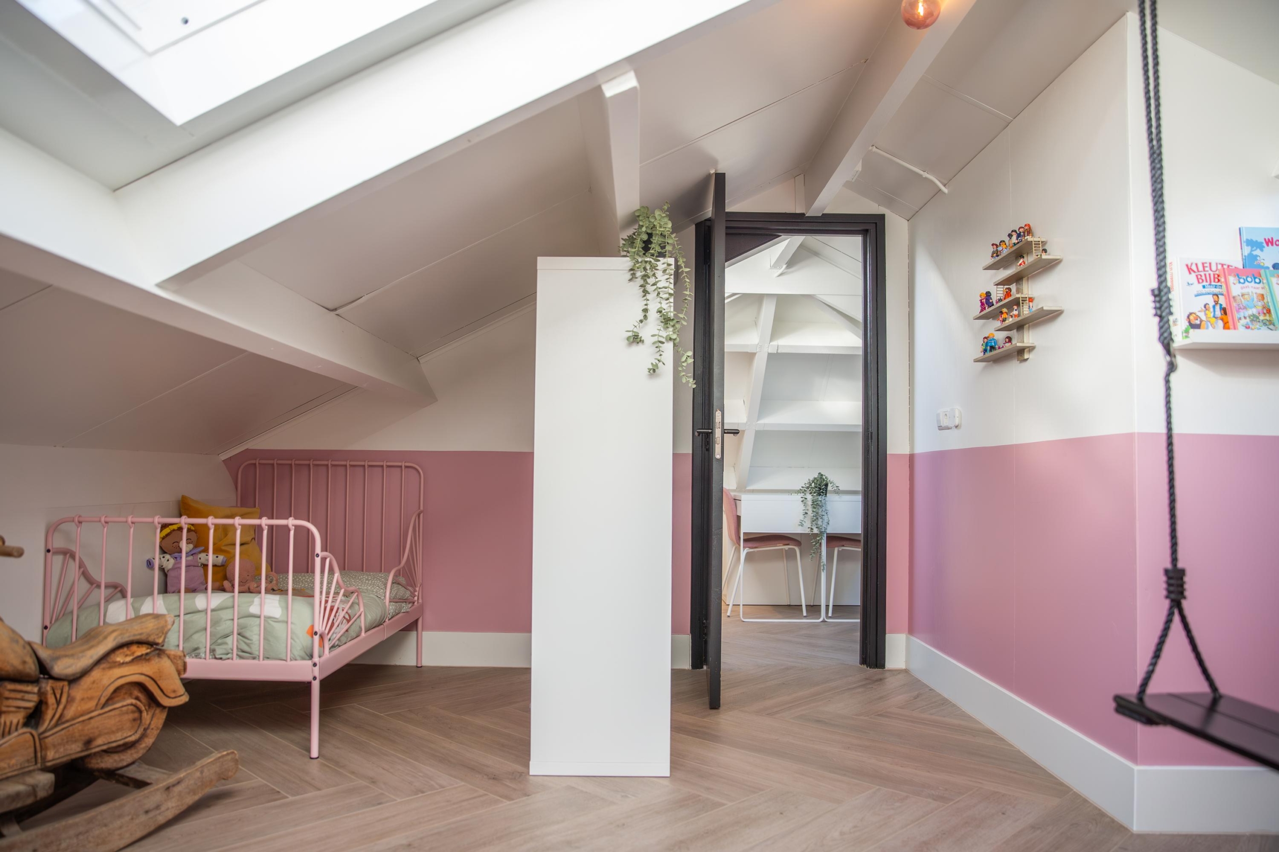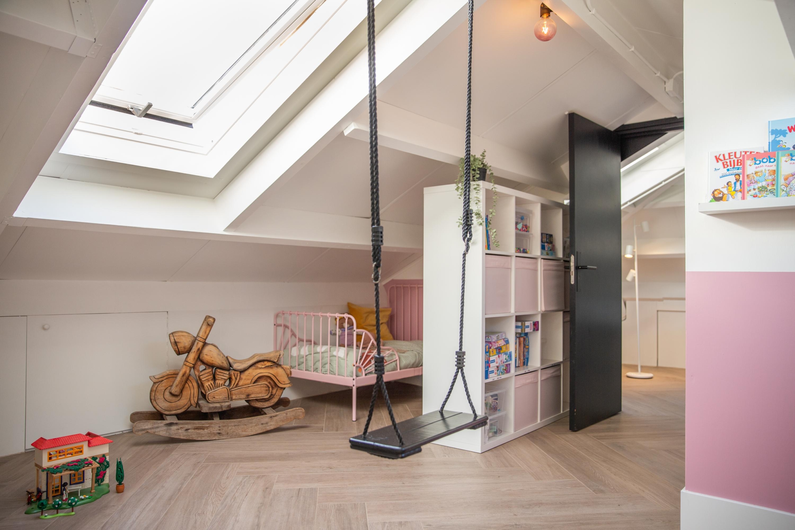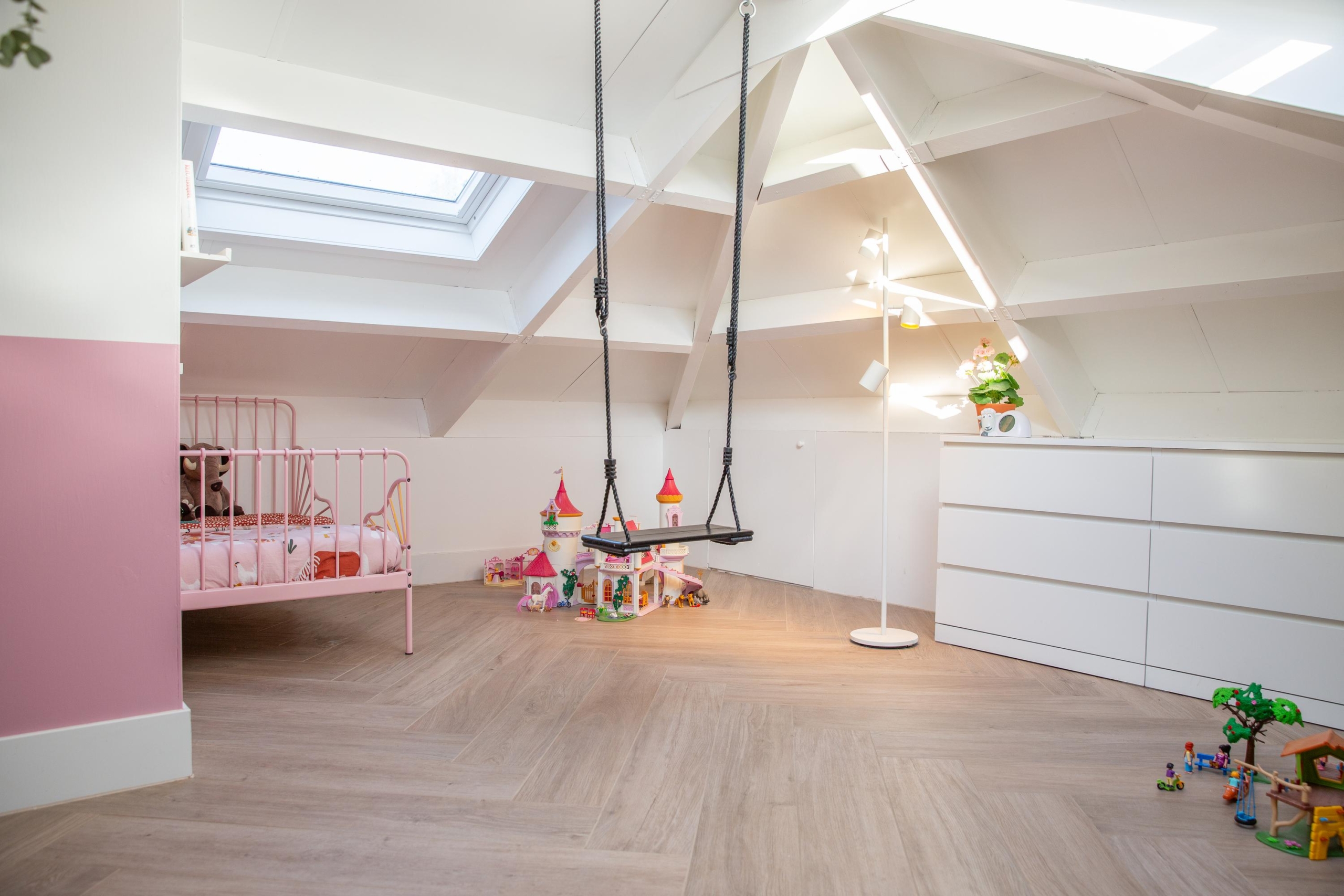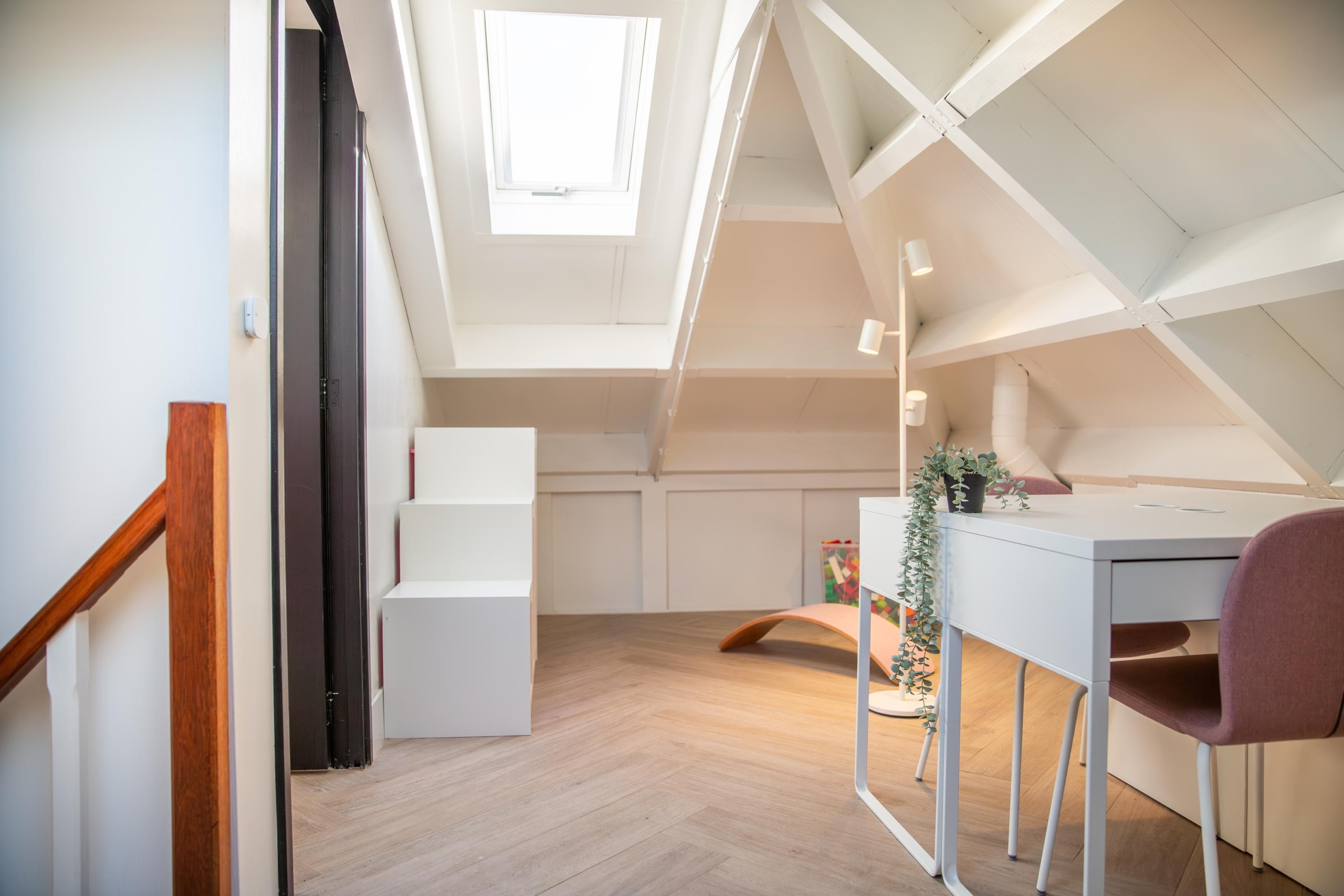 De tweede verdieping verrast met enorm veel licht en ruimte. Nieuwe dakramen zorgen voor een frisse uitstraling en de schotten rondom bieden veel bergruimte. De kamer is uitstekend te gebruiken als extra slaapkamer, werkplek of hobbyruimte. Ook hier geniet je van het comfort van vloerverwarming, die bovendien per kamer afzonderlijk te regelen is.