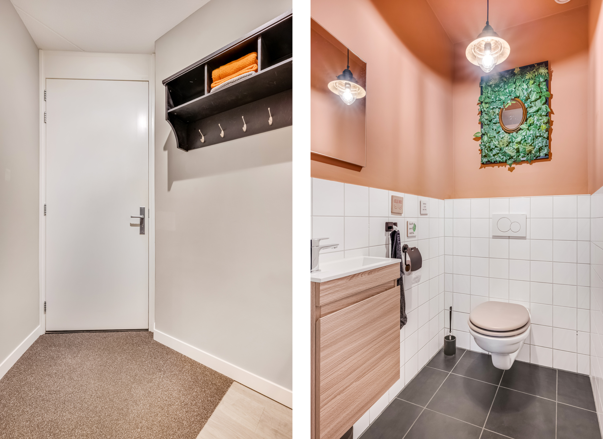 De toiletruimte is deels betegeld in een moderne kleurstelling en voorzien van een hangend toilet en fonteintje.