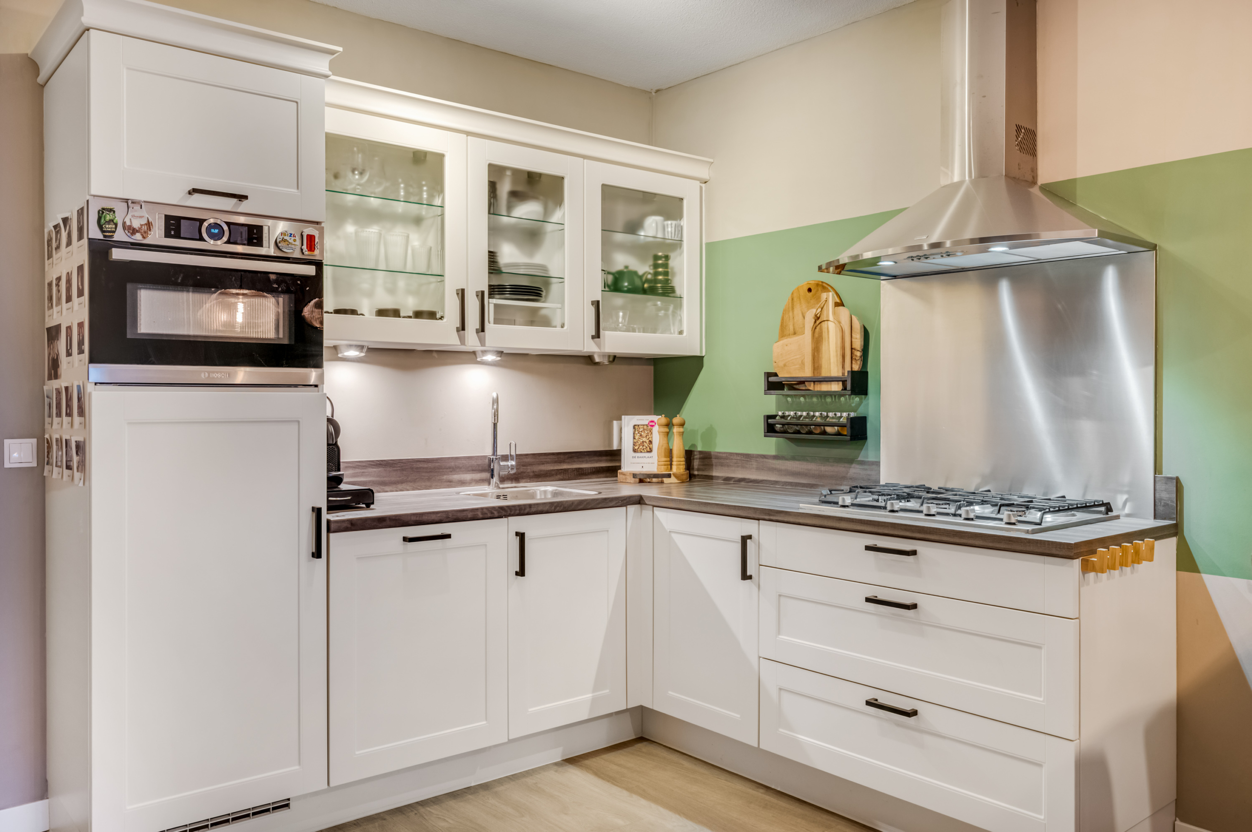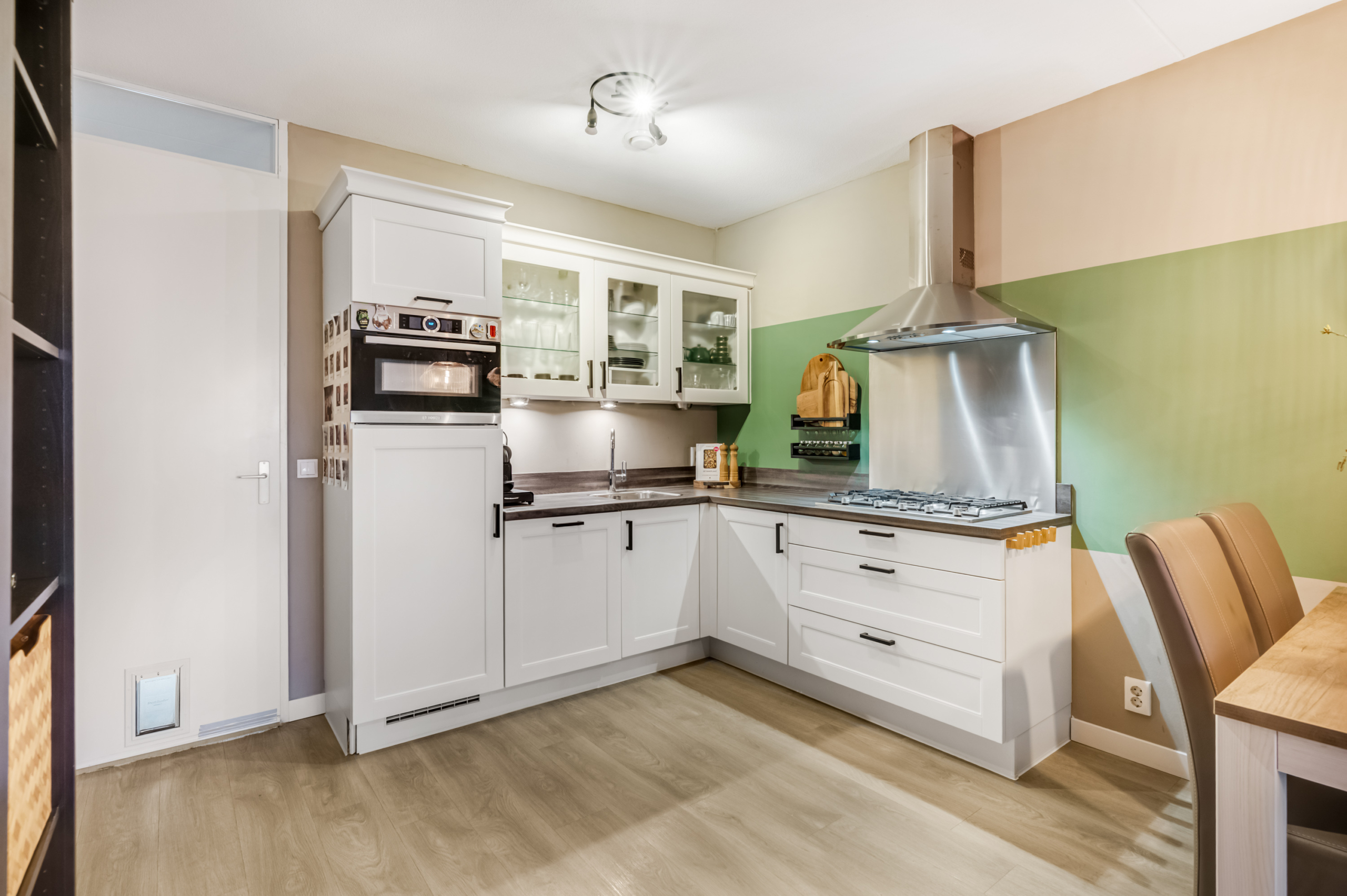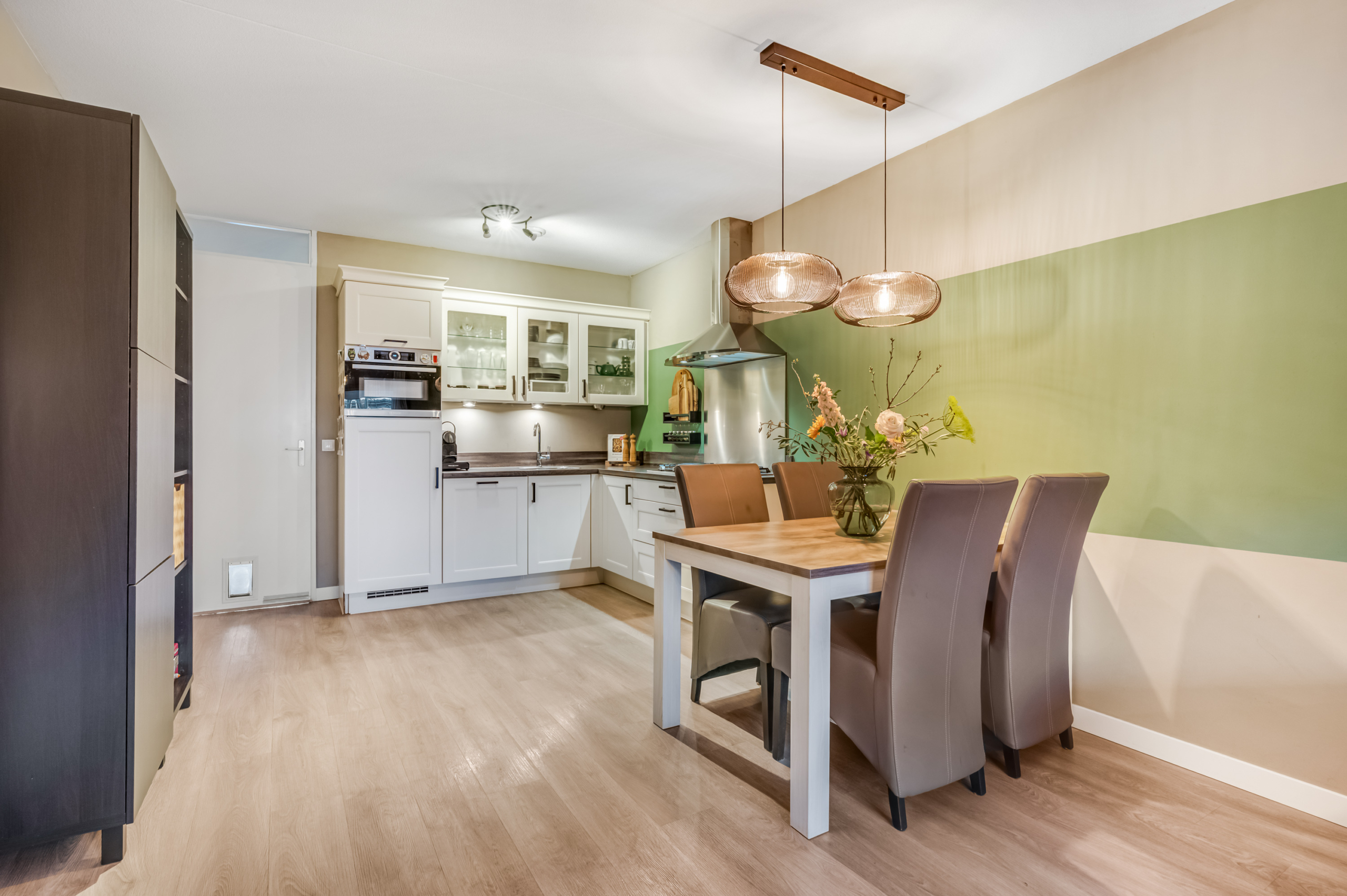 De open keuken bevindt zich aan de achterzijde van de woonkamer en is opgesteld in een hoekopstelling. De keuken is uitgevoerd met witte boven- en onderkasten, een bijpassend werkblad en beschikt over een 5-pits gaskookplaat met wokpit, RVS afzuigkap, combi-magnetron, koelkast en vaatwasmachine.