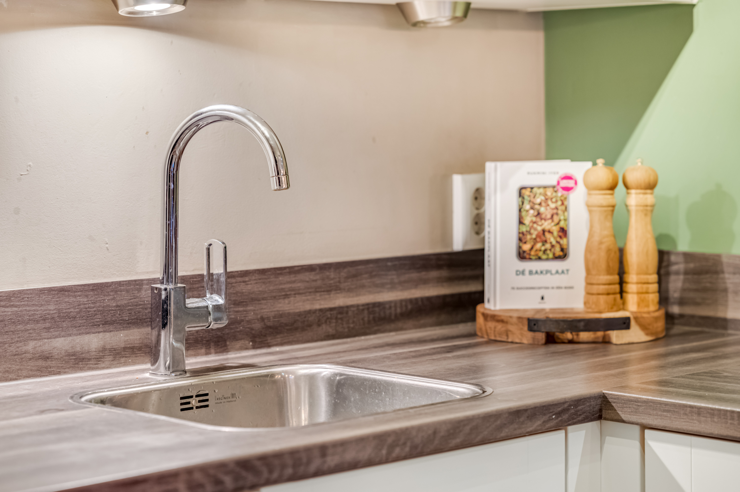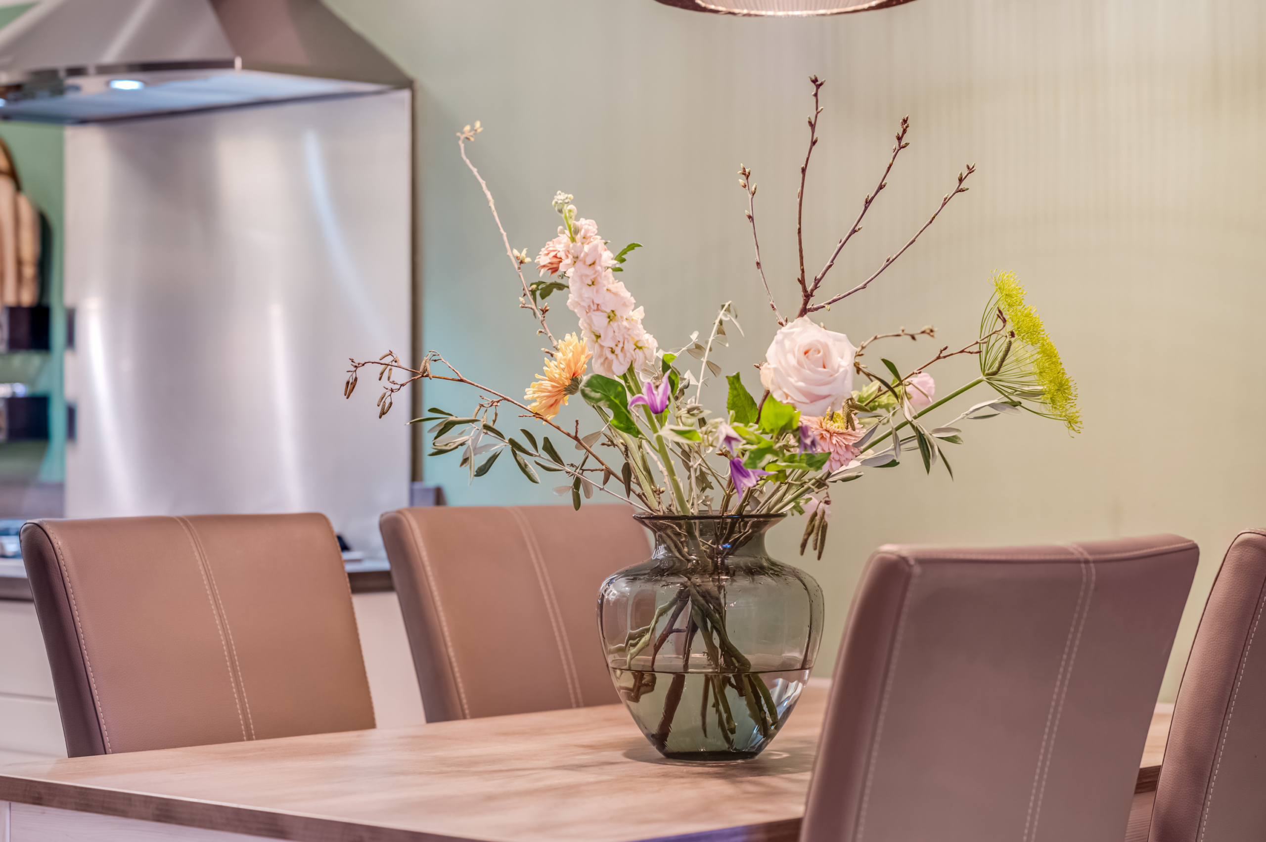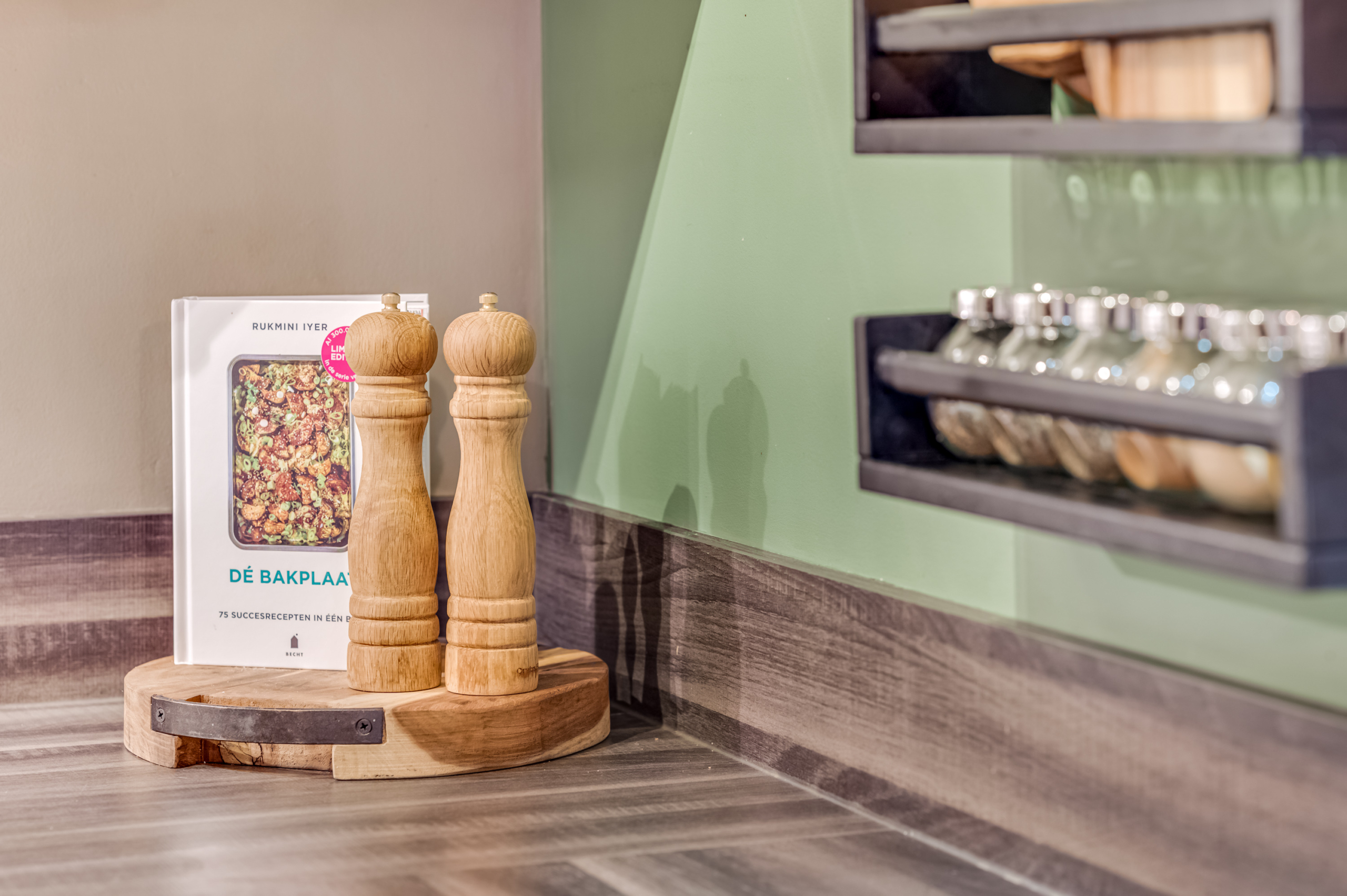 De open keuken bevindt zich aan de achterzijde van de woonkamer en is opgesteld in een hoekopstelling. De keuken is uitgevoerd met witte boven- en onderkasten, een bijpassend werkblad en beschikt over een 5-pits gaskookplaat met wokpit, RVS afzuigkap, combi-magnetron, koelkast en vaatwasmachine.