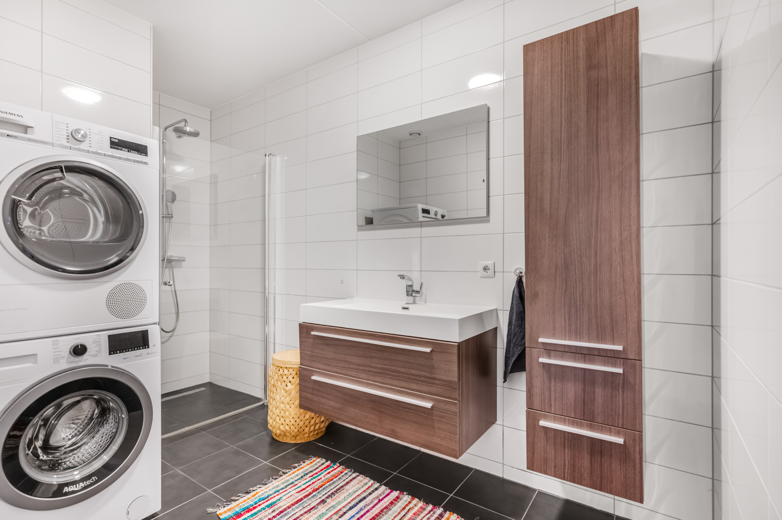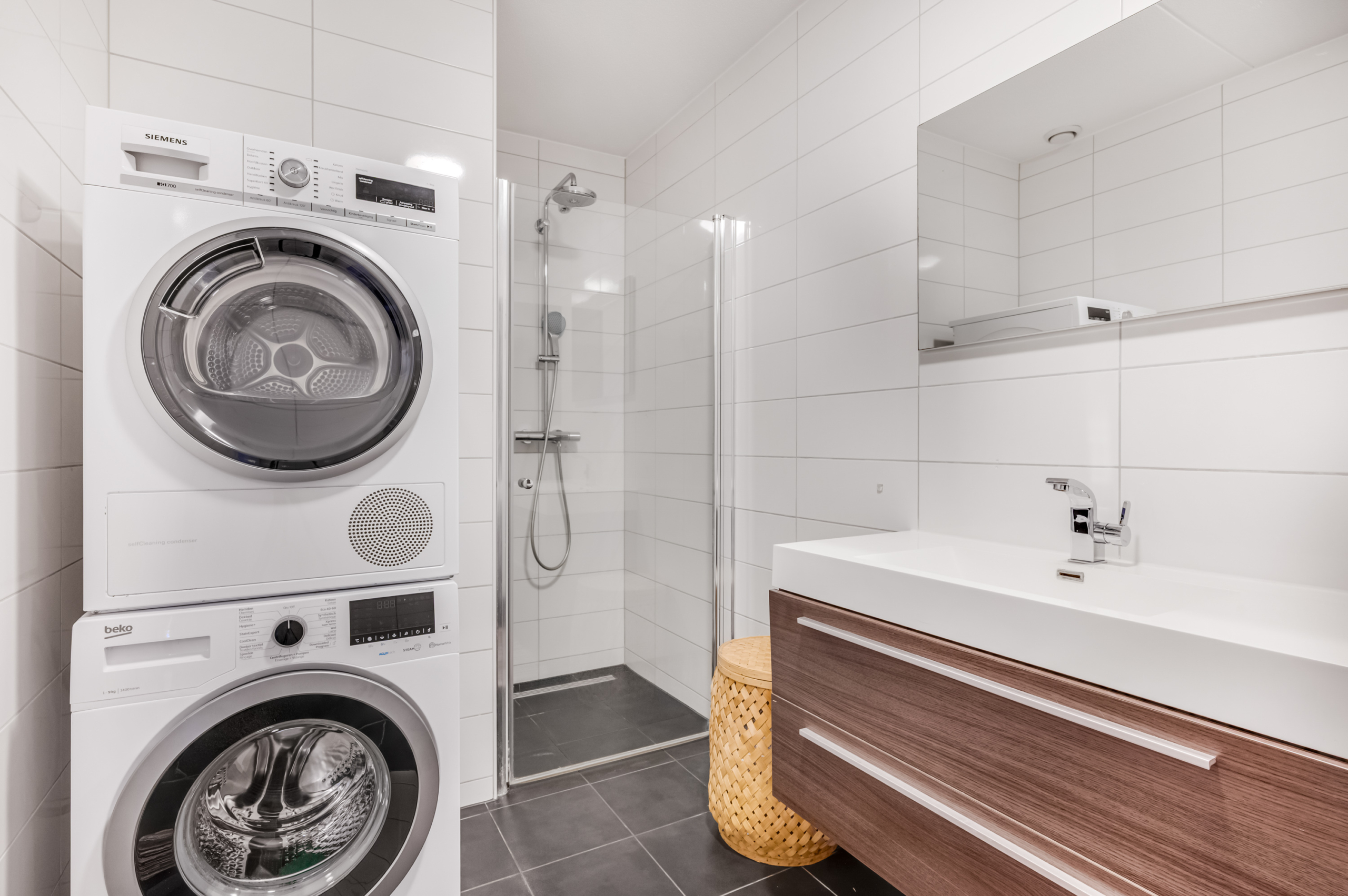 De moderne badkamer is volledig betegeld in een rustige, eigentijdse kleurstelling en voorzien van een ruime inloopdouche, een breed wastafelmeubel met opberglades en een extra opbergkast. Ook bevinden zich hier de aansluitingen voor de wasapparatuur.