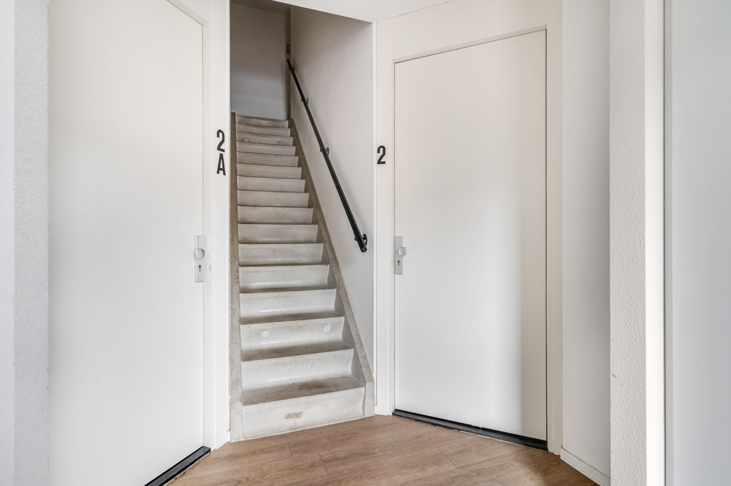 Via de centrale entree van het complex bereik je de meterkast en de voordeur van het appartement. Je komt binnen in de ruime hal welke toegang geeft tot de toiletruimte en de woonkamer.