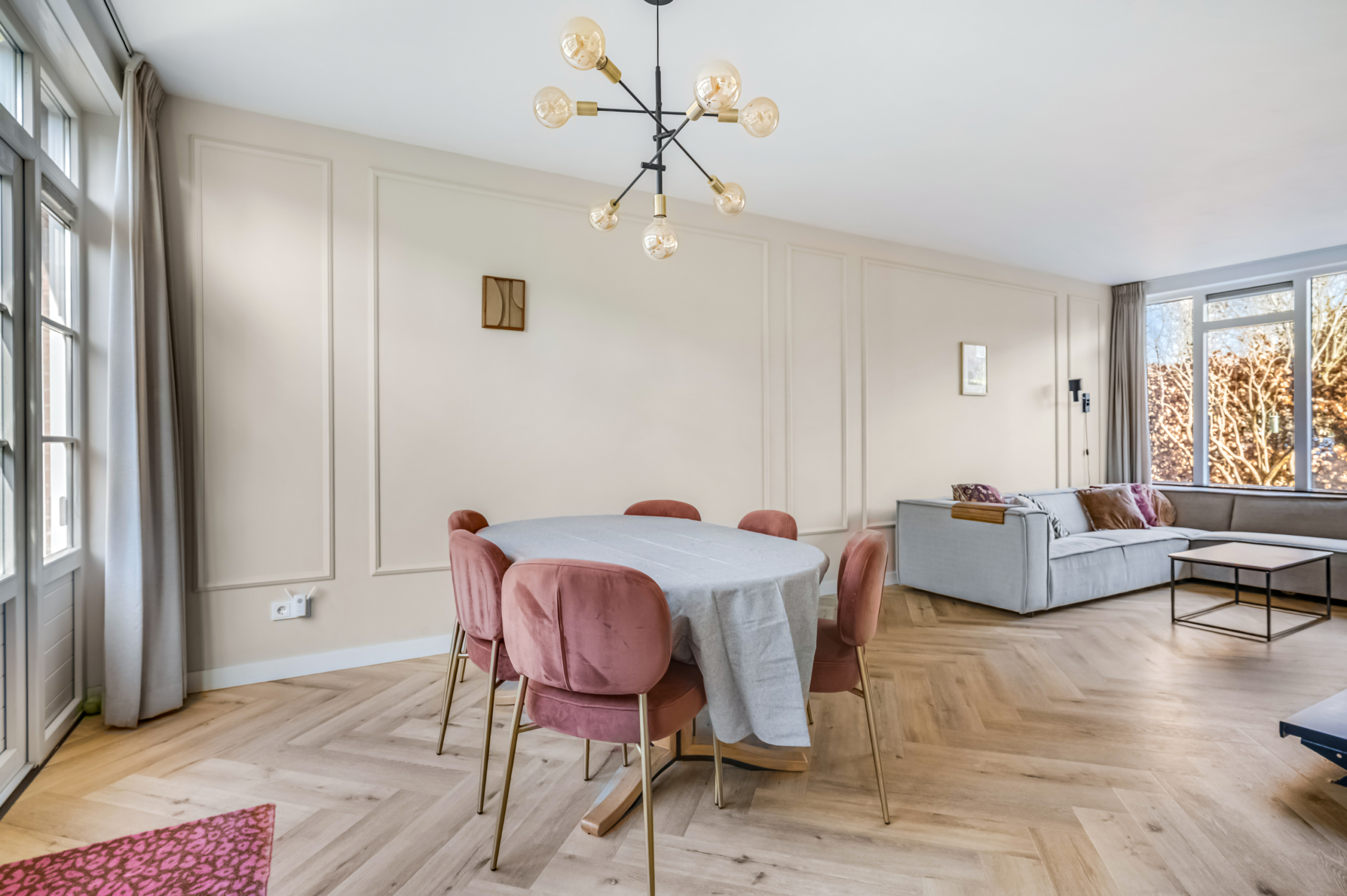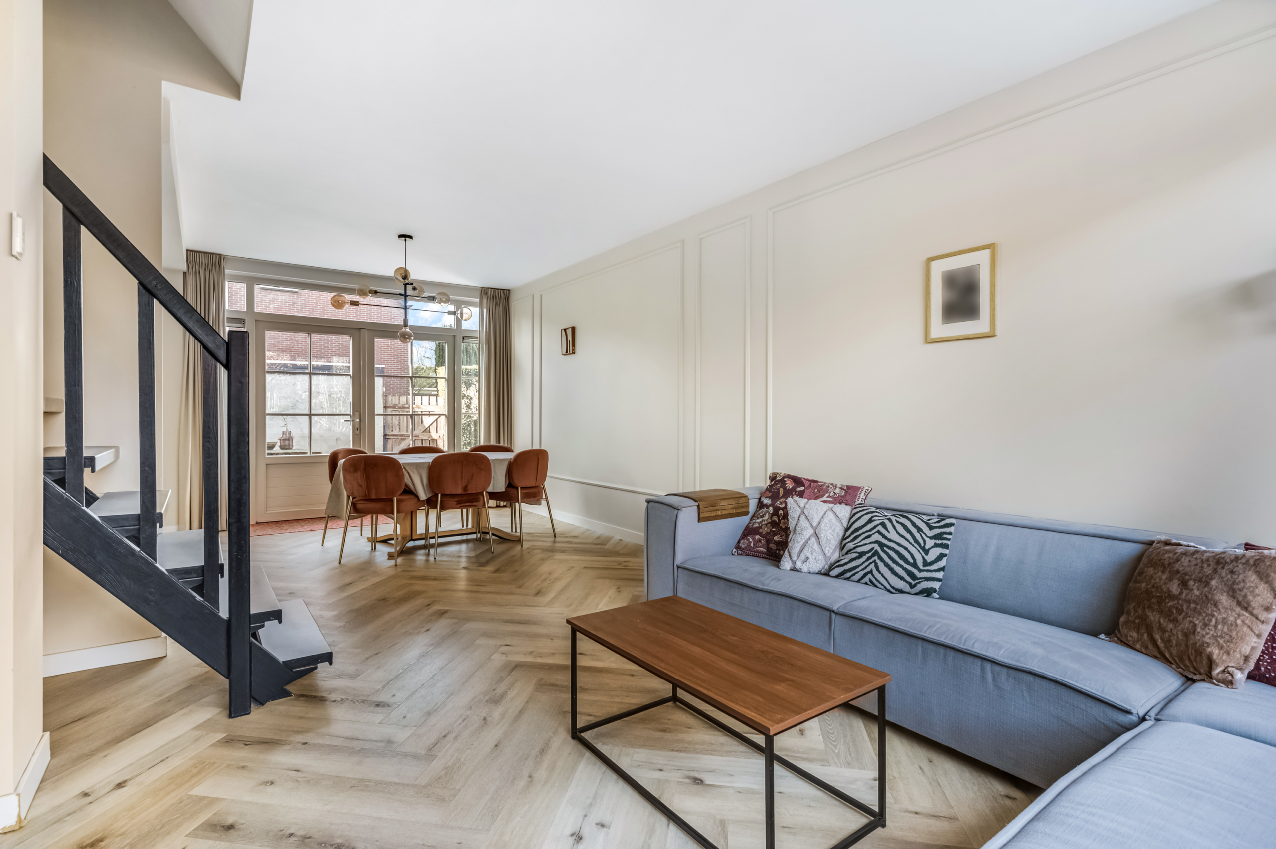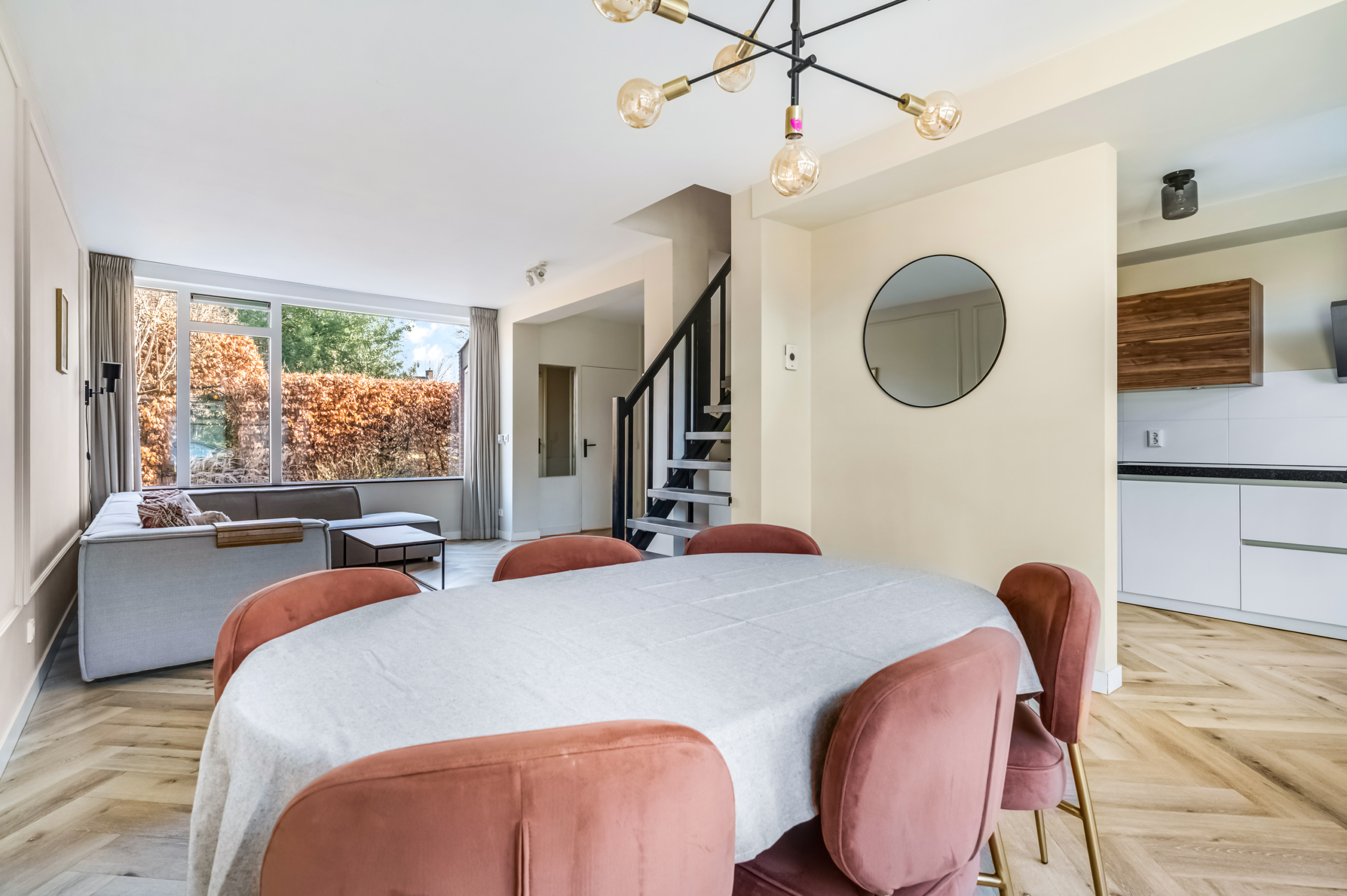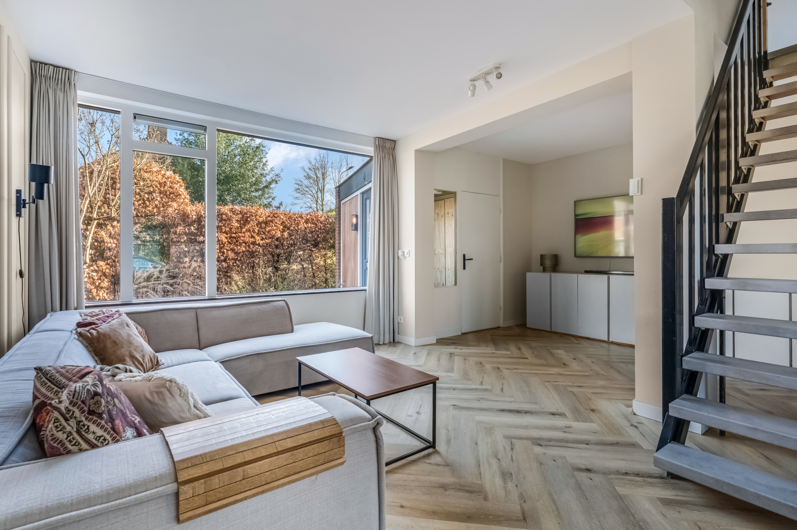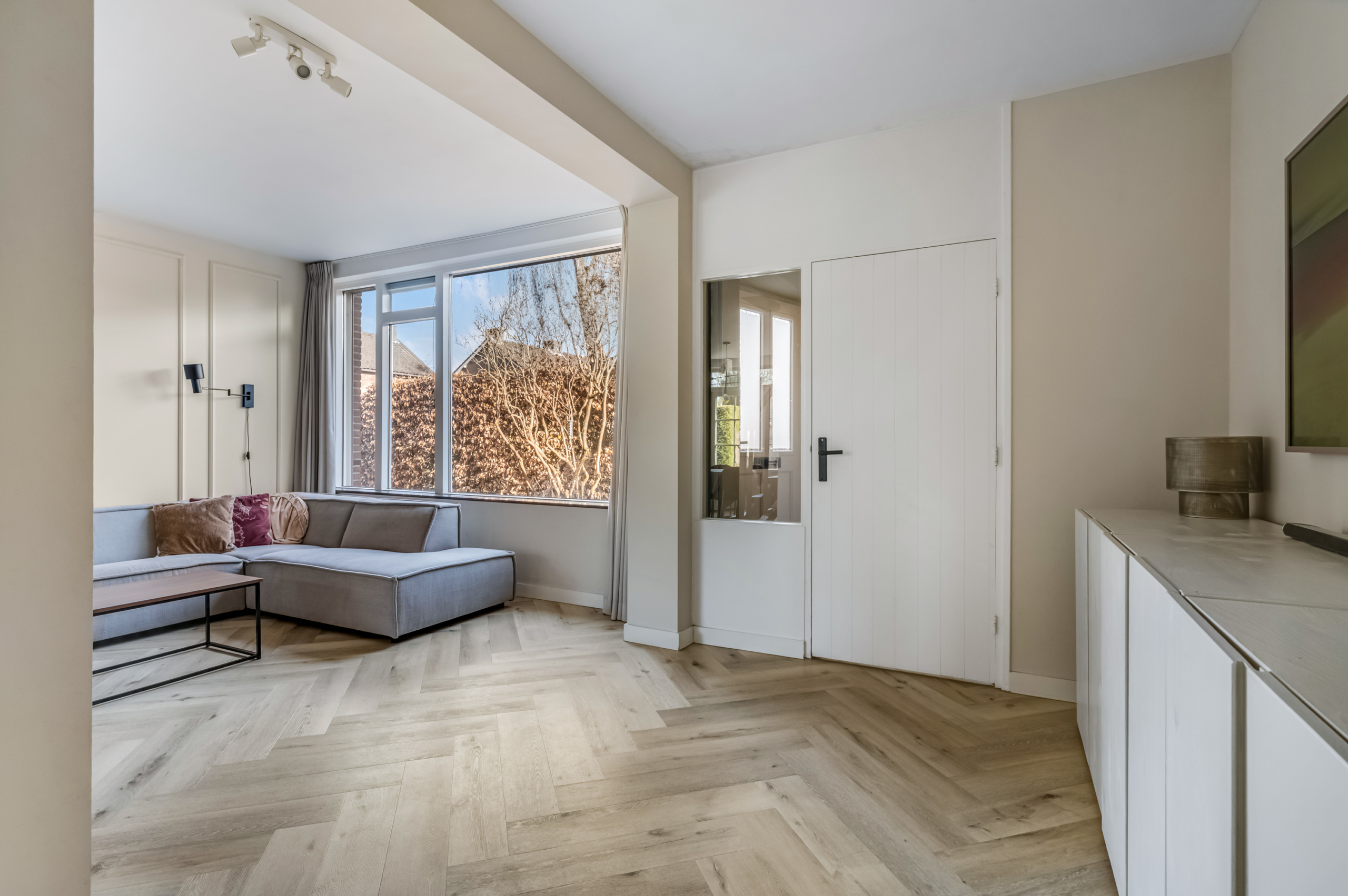 De woonkamer is opvallend licht dankzij de grote raampartijen, wat direct zorgt voor een ruimtelijk en aangenaam gevoel. De moderne afwerking geeft het geheel een frisse, eigentijdse uitstraling.