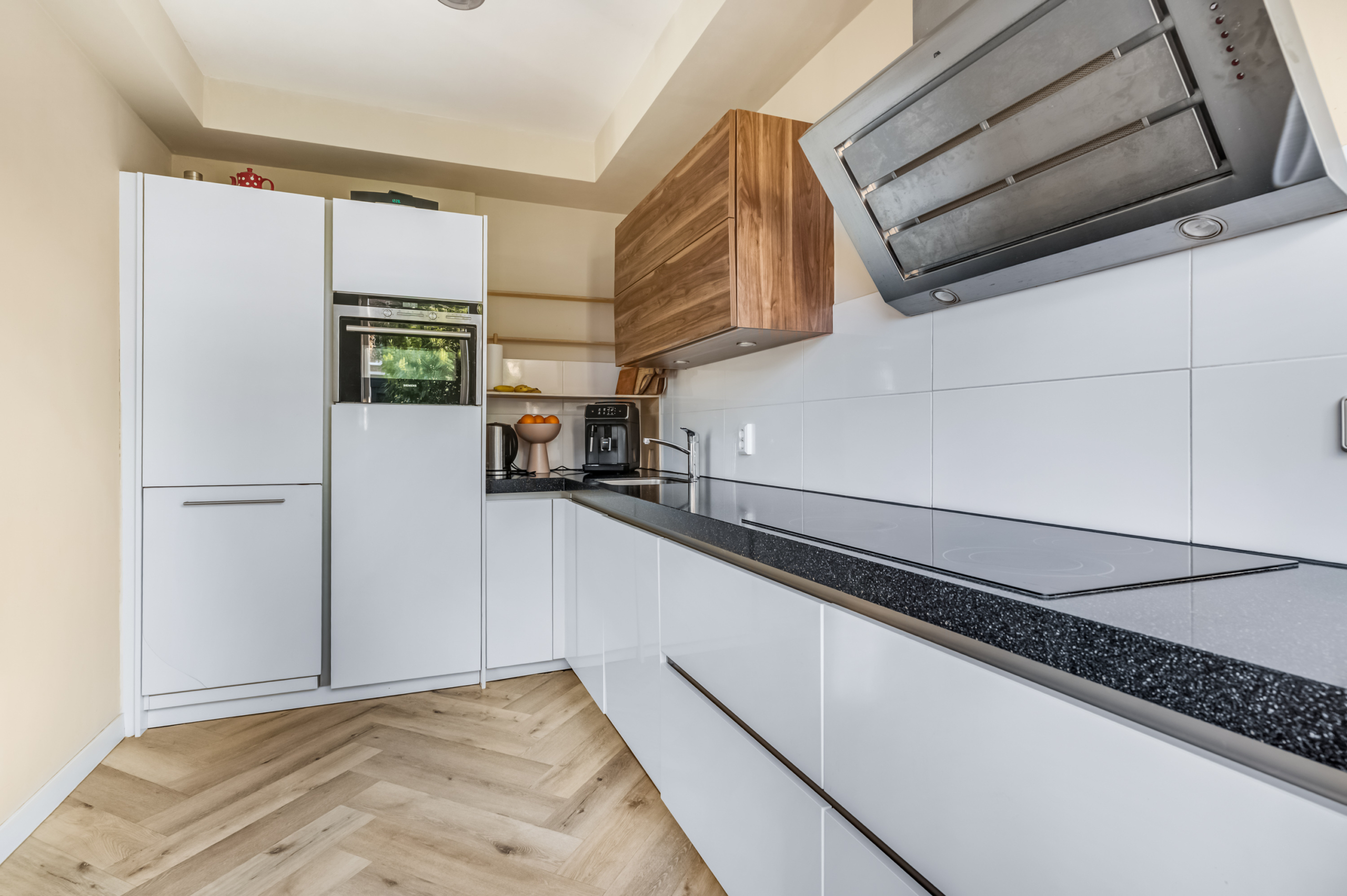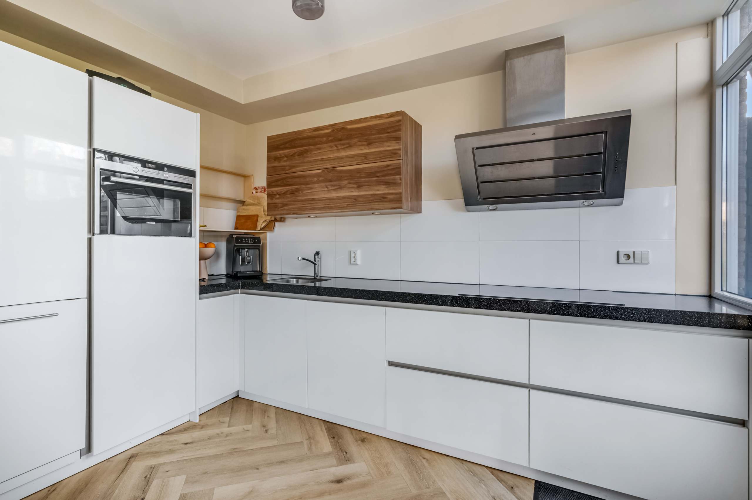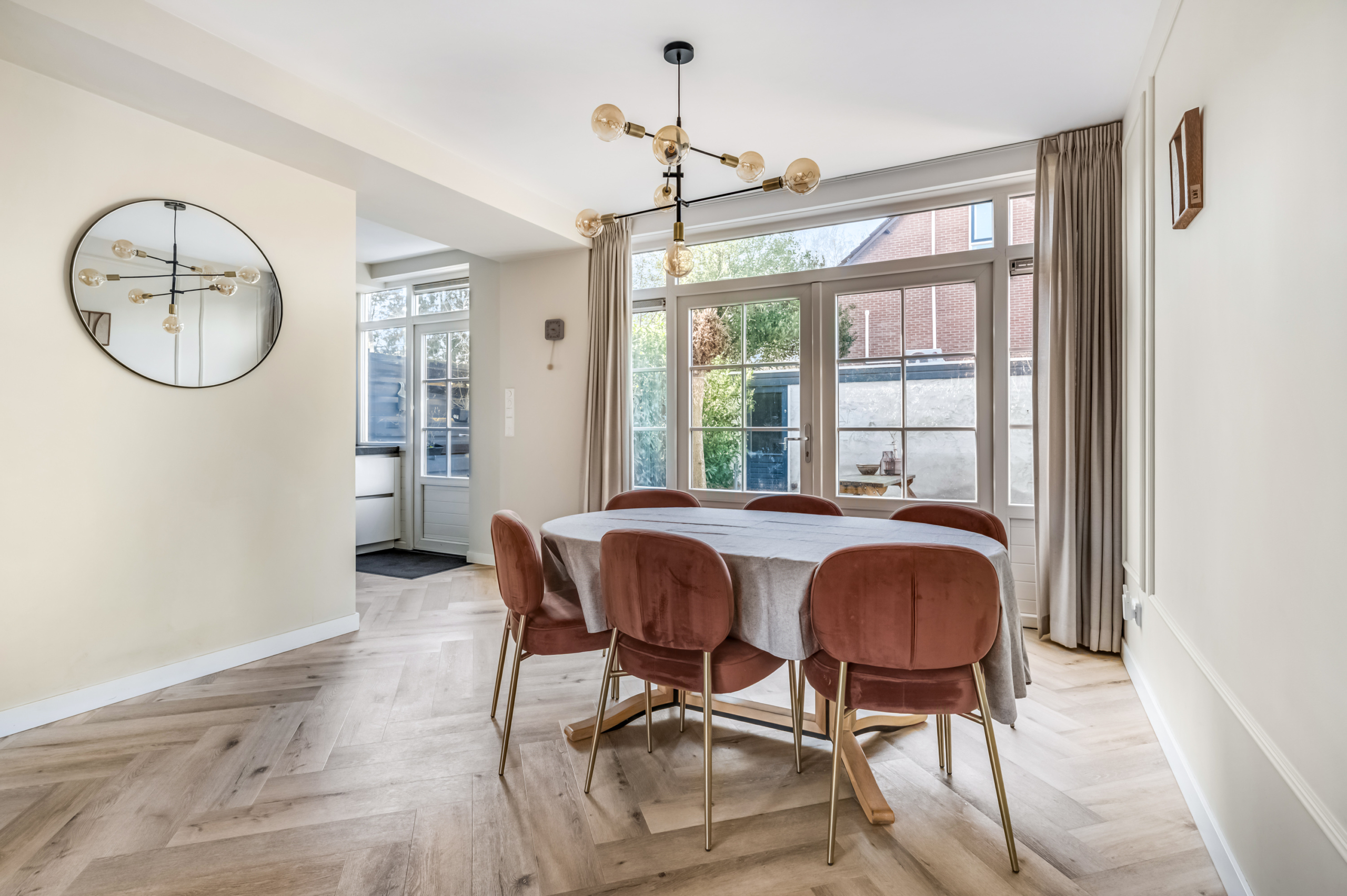 Aan de achterzijde bevindt zich de eethoek met uitzicht op de tuin, een heerlijke plek voor lange diners en gezellige momenten met familie en vrienden. De open keuken is modern ingericht en van alle gemakken voorzien, met volop werk- en bergruimte. Via de woonkamer loop je zo de tuin in, waardoor binnen en buiten op natuurlijke wijze in elkaar overlopen.