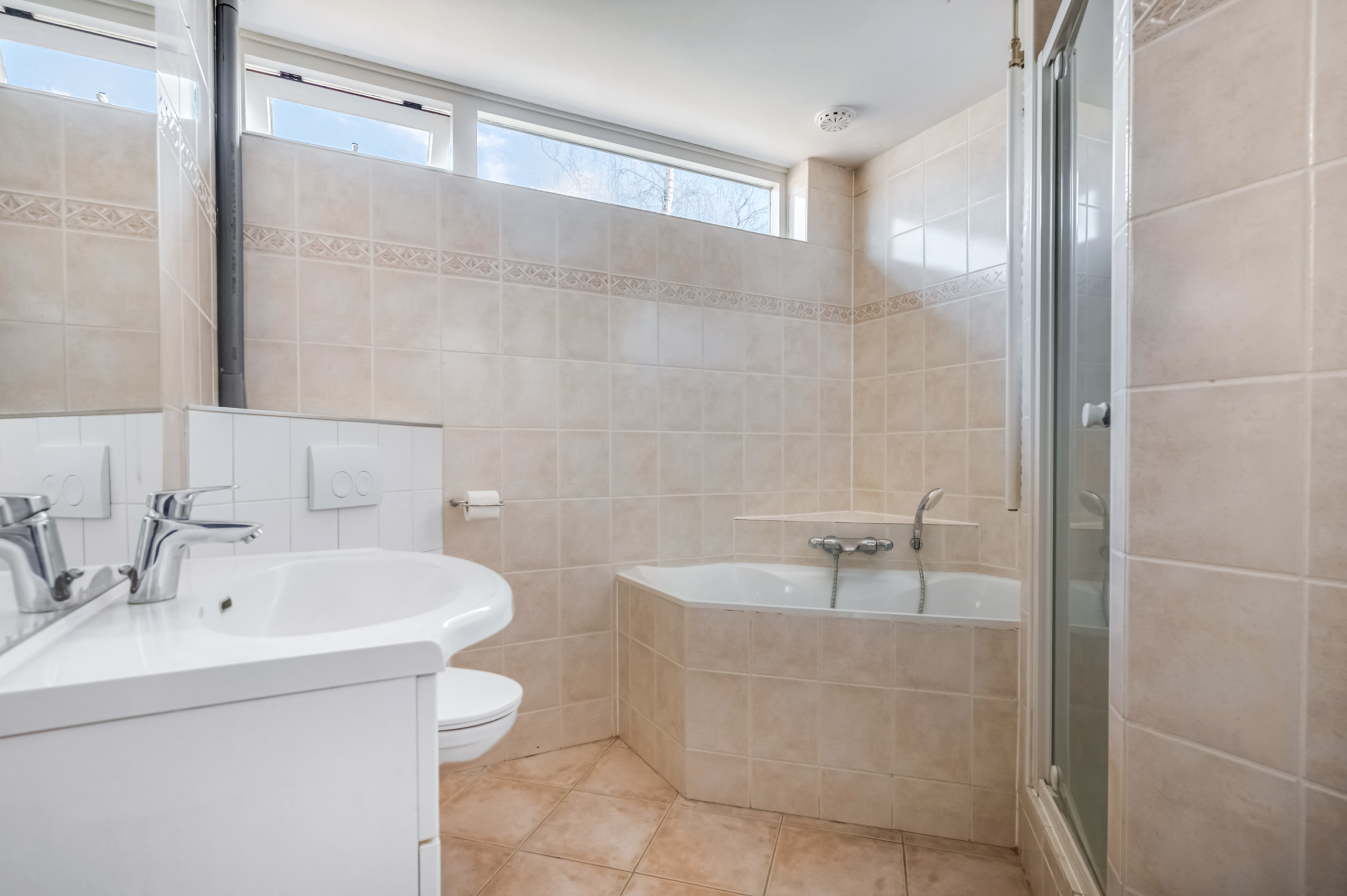 - Badkamer voorzieningen Ligbad, toilet, dubbele wastafel, inloopdouche