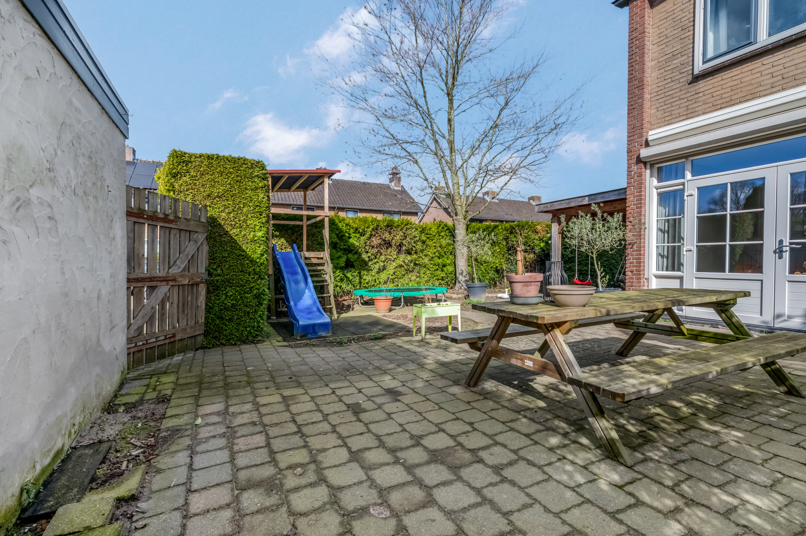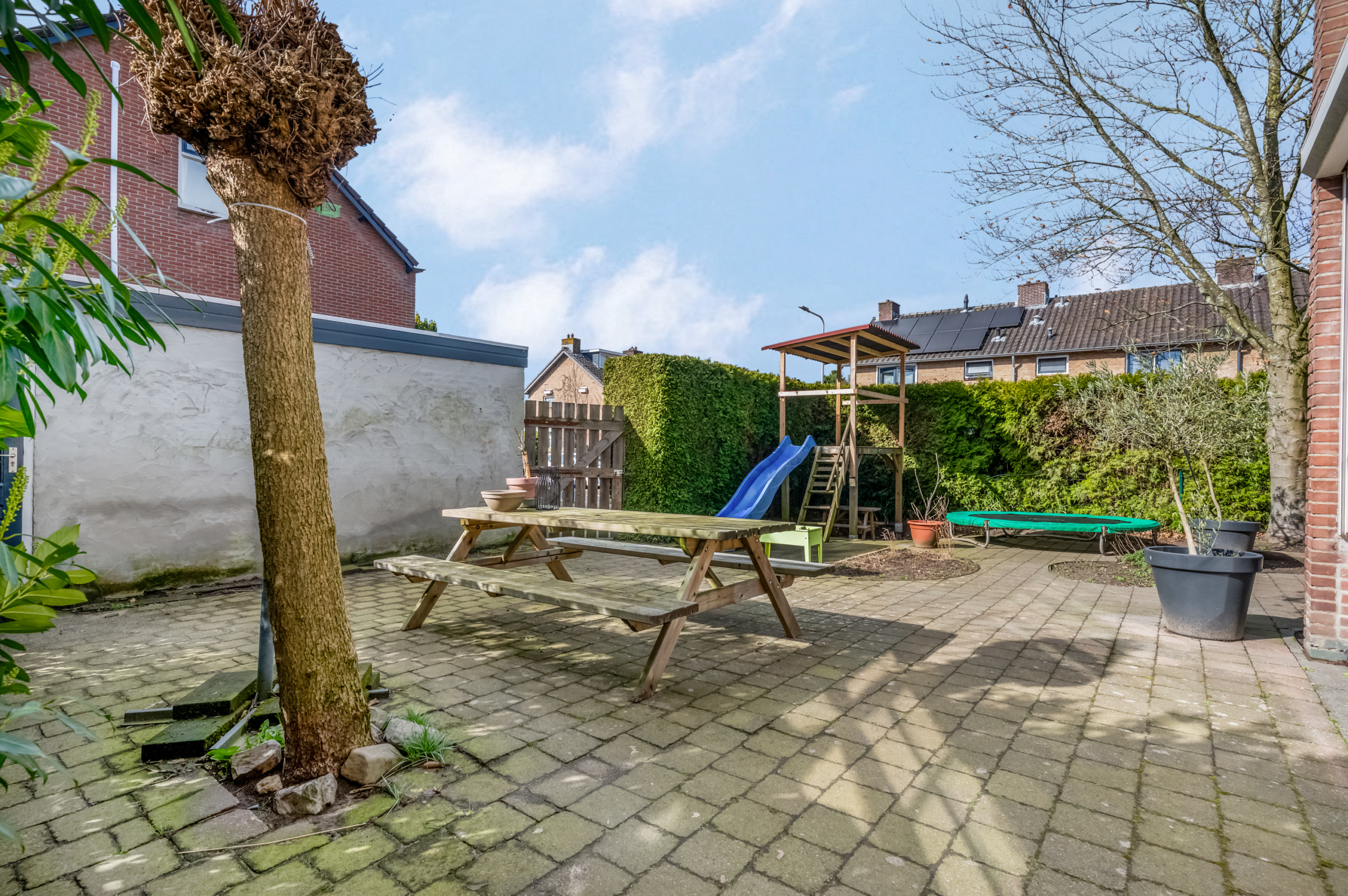 De royale achtertuin ligt op het zuidwesten, waardoor je hier de hele dag door kunt genieten van de zon. De tuin is verzorgd aangelegd en biedt volop ruimte voor meerdere zitplekken, groen en ontspanning.