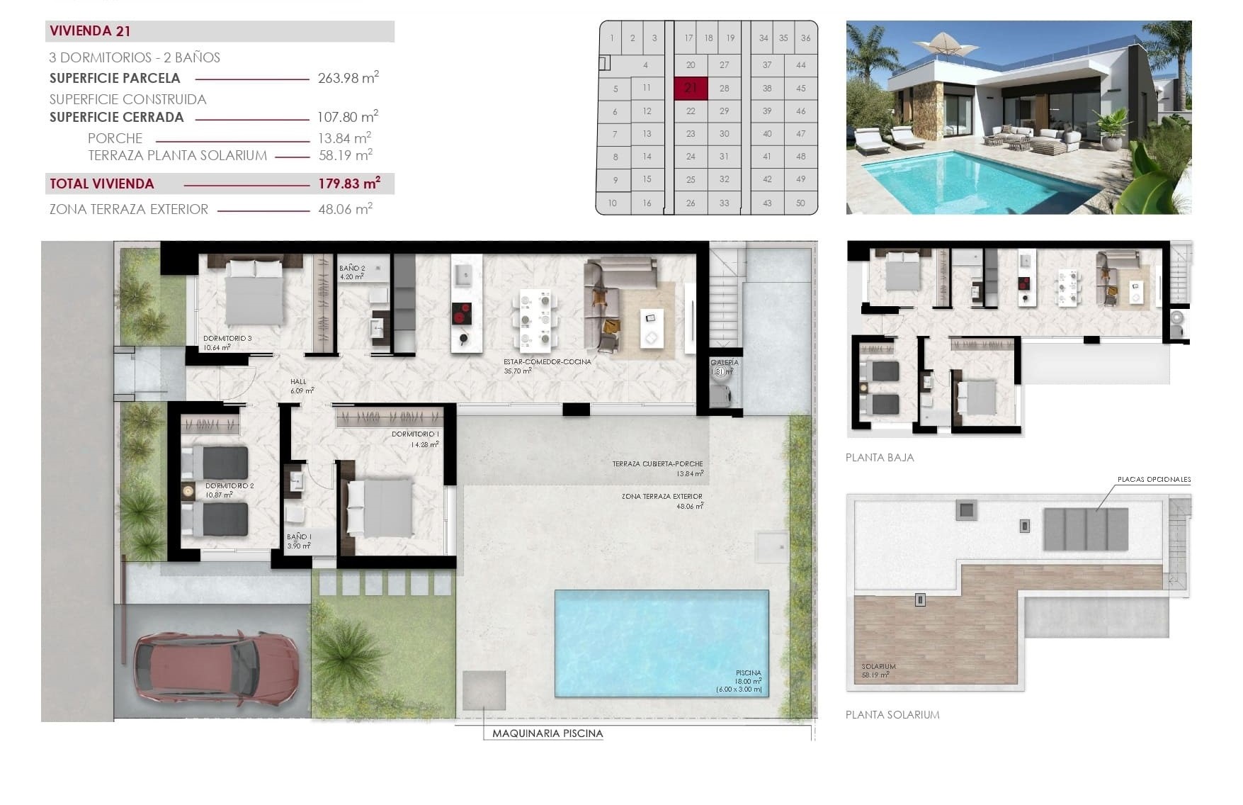 De villa beschikt over een privézwembad, een groot dakterras van 58 m² en een overkapping van 13 m², ideaal om te zonnen of ’s avonds te genieten van het Spaanse klimaat. De tuin nodigt uit tot buitenleven, met een loungeplek naast het zwembad waar je in alle rust kunt ontspannen.