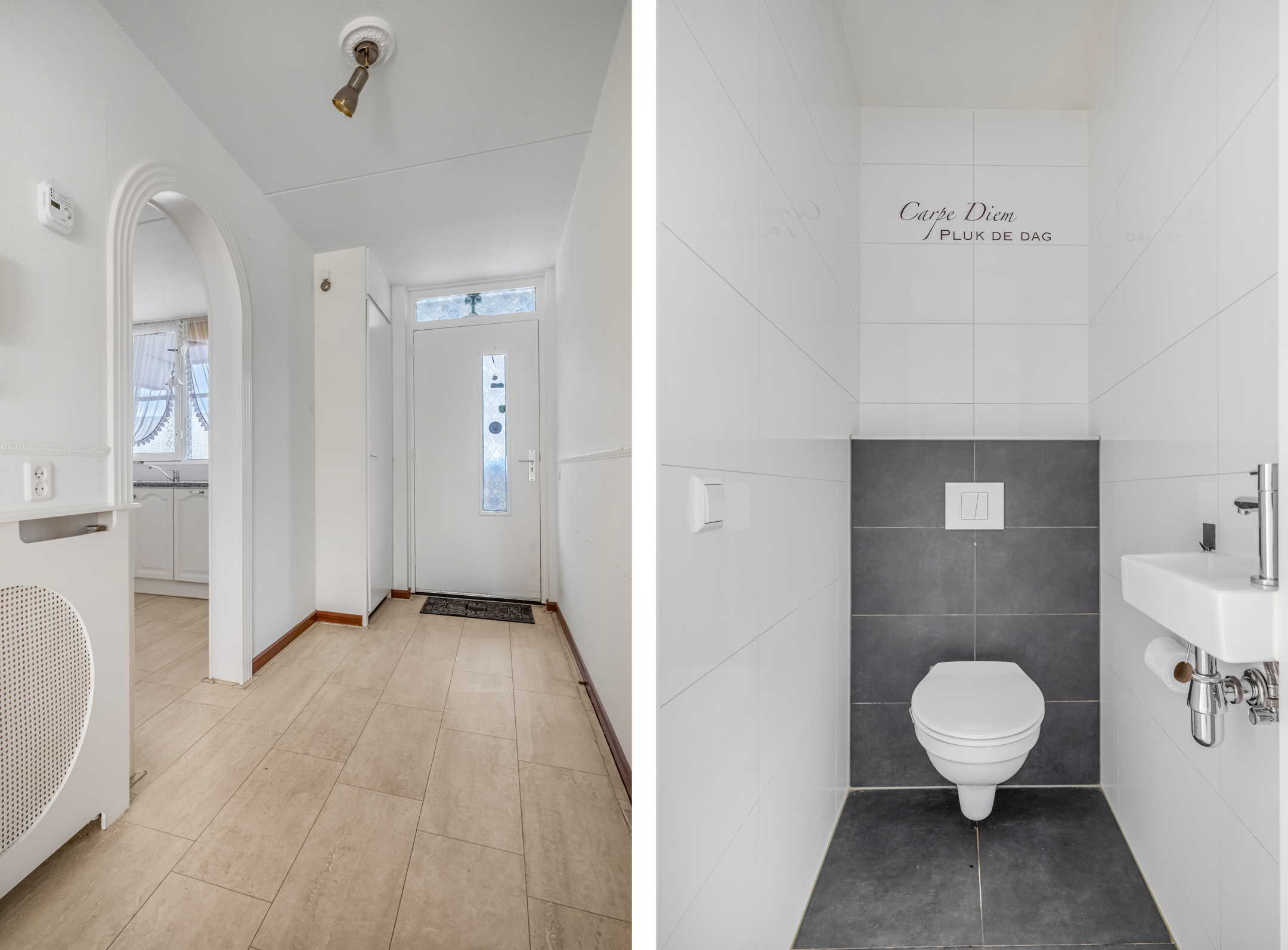 Aan de rechterzijde van de hal ligt de keuken. De keuken is geplaatst in L-opstelling en voorzien van inbouwapparatuur zoals inductiekookplaat, combi-magnetron, vaatwasser en ruime koelkast en vriezer. Aansluitend bevindt zich een praktische en ruime berging, ideaal voor het opbergen van voorraad, schoonmaakspullen of keukengerei dat niet dagelijks wordt gebruikt. In deze ruimte bevinden zich tevens de CV-opstelling, de unit voor mechanische ventilatie en de aansluitingen voor zowel een wasmachine als een droger. Hierdoor is de berging niet alleen functioneel als opslag, maar ook praktisch ingericht voor de wasvoorzieningen.
