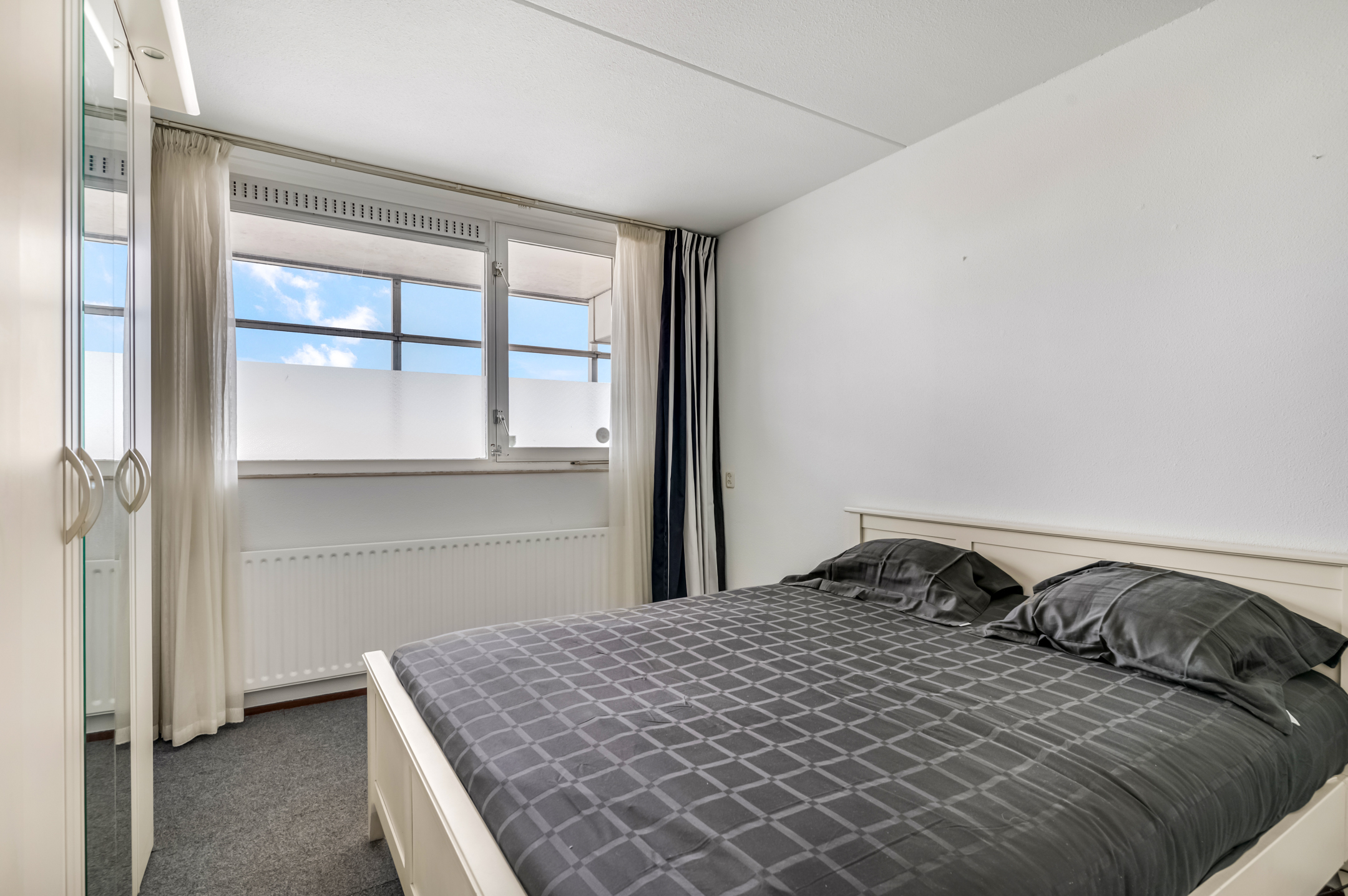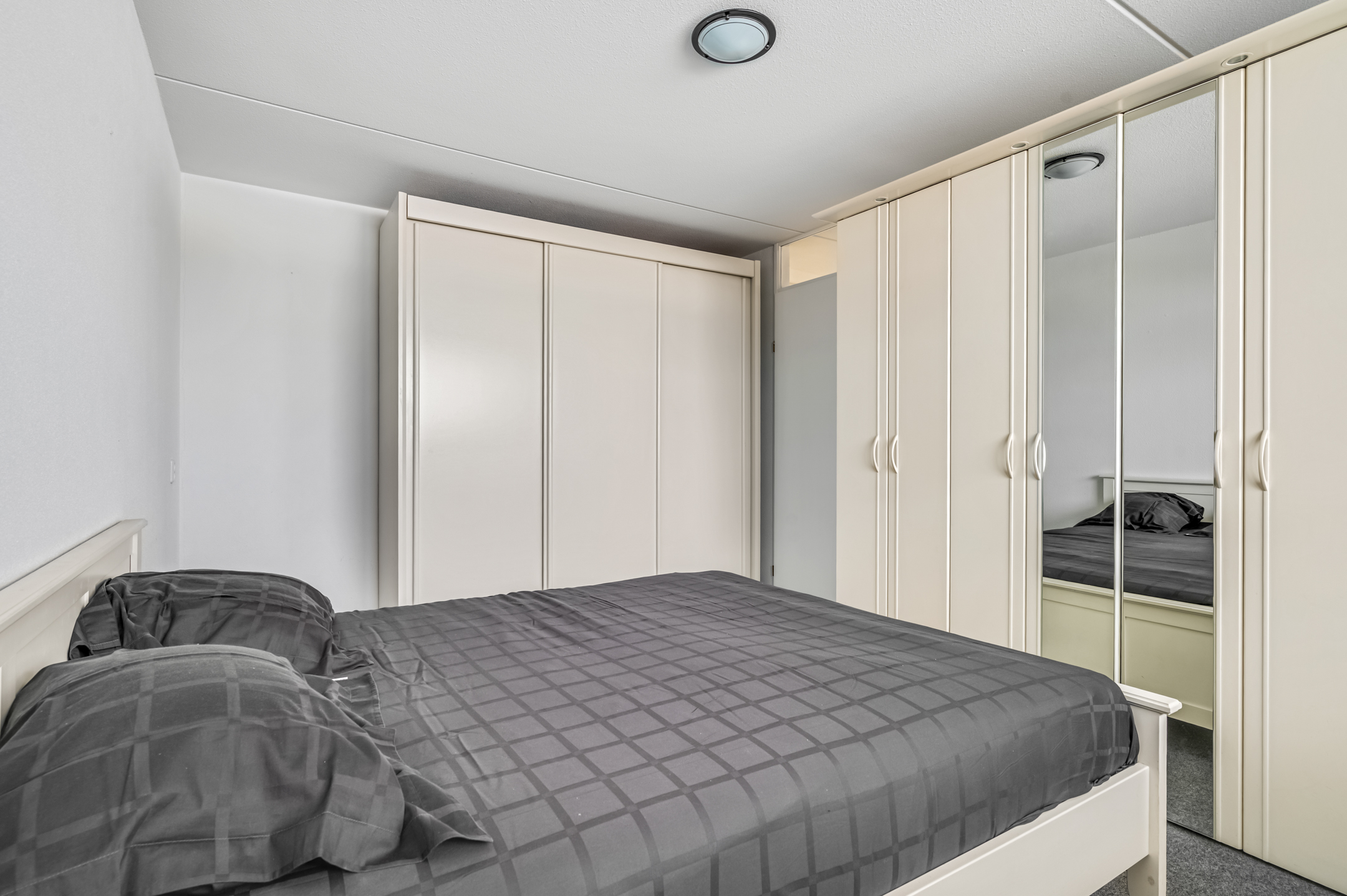 Aan de linkerkant van de hal bevindt zich de ruime hoofdslaapkamer, gelegen aan de galerijzijde van het complex. Deze kamer is ruim van formaat en biedt voldoende plaats voor een tweepersoonsbed en een grote kledingkast.