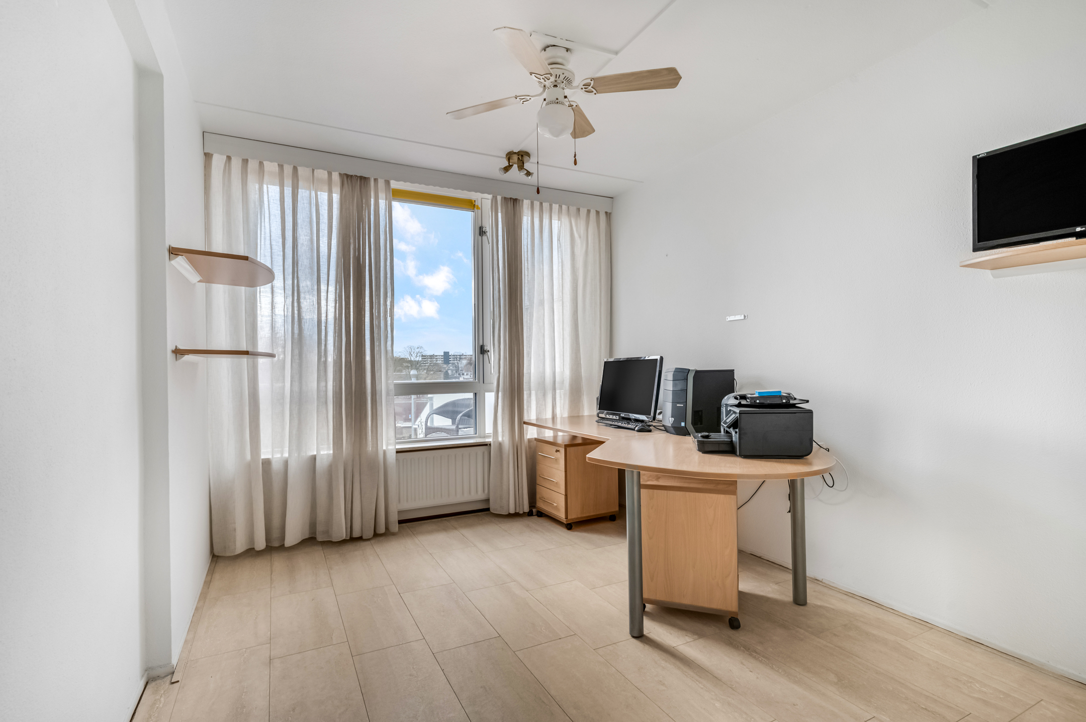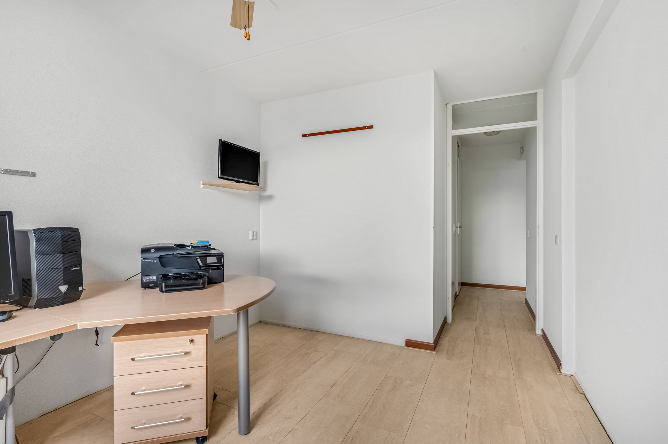 Aan de achterzijde van het appartement ligt een ruime kamer, momenteel in gebruik als kantoorruimte, maar eveneens royaal en daarmee eenvoudig in te richten als extra slaapkamer. Naast deze kamer bevindt zich de badkamer. Die is netjes betegeld en voorzien van een douche en vaste wastafel. Daarnaast bevindt zich in de hal een separaat toilet met fonteintje.