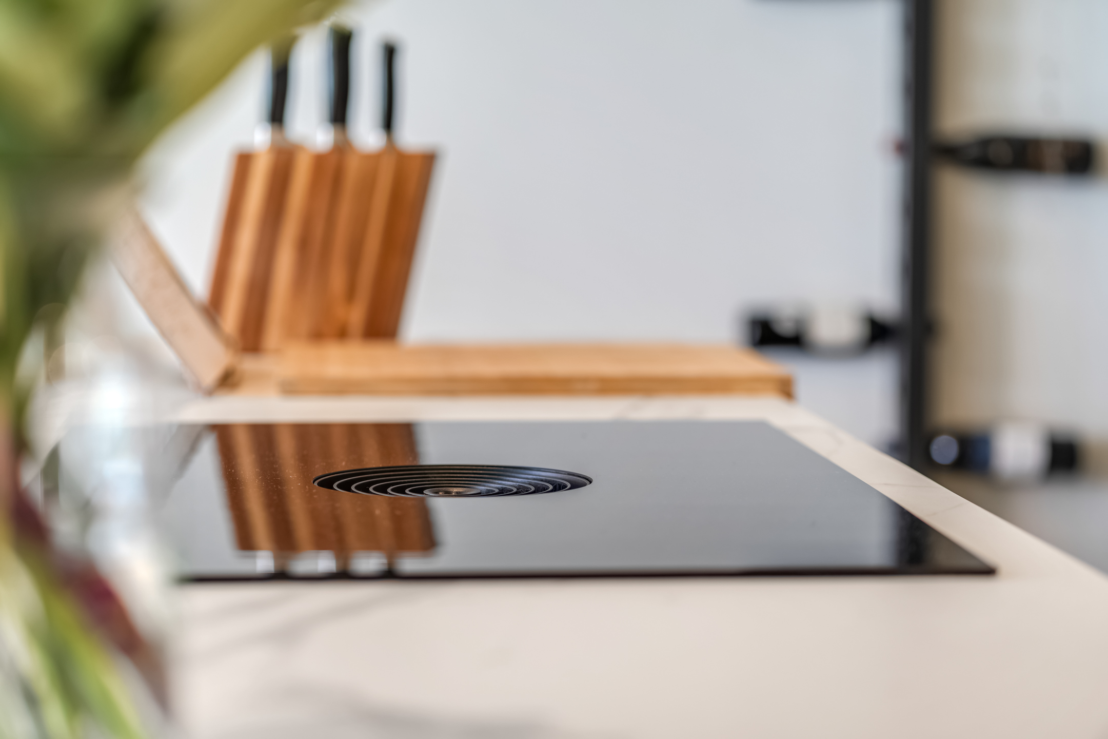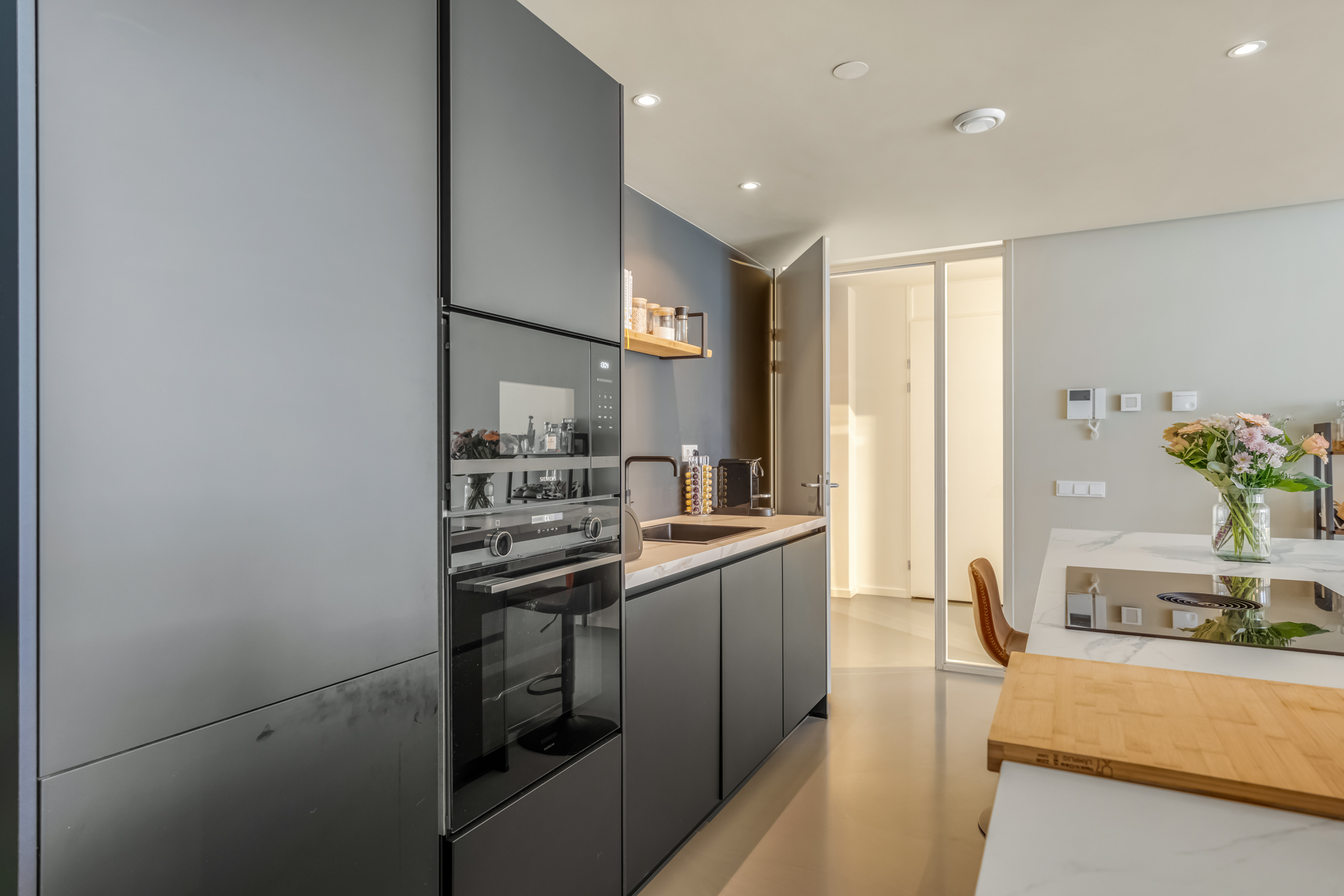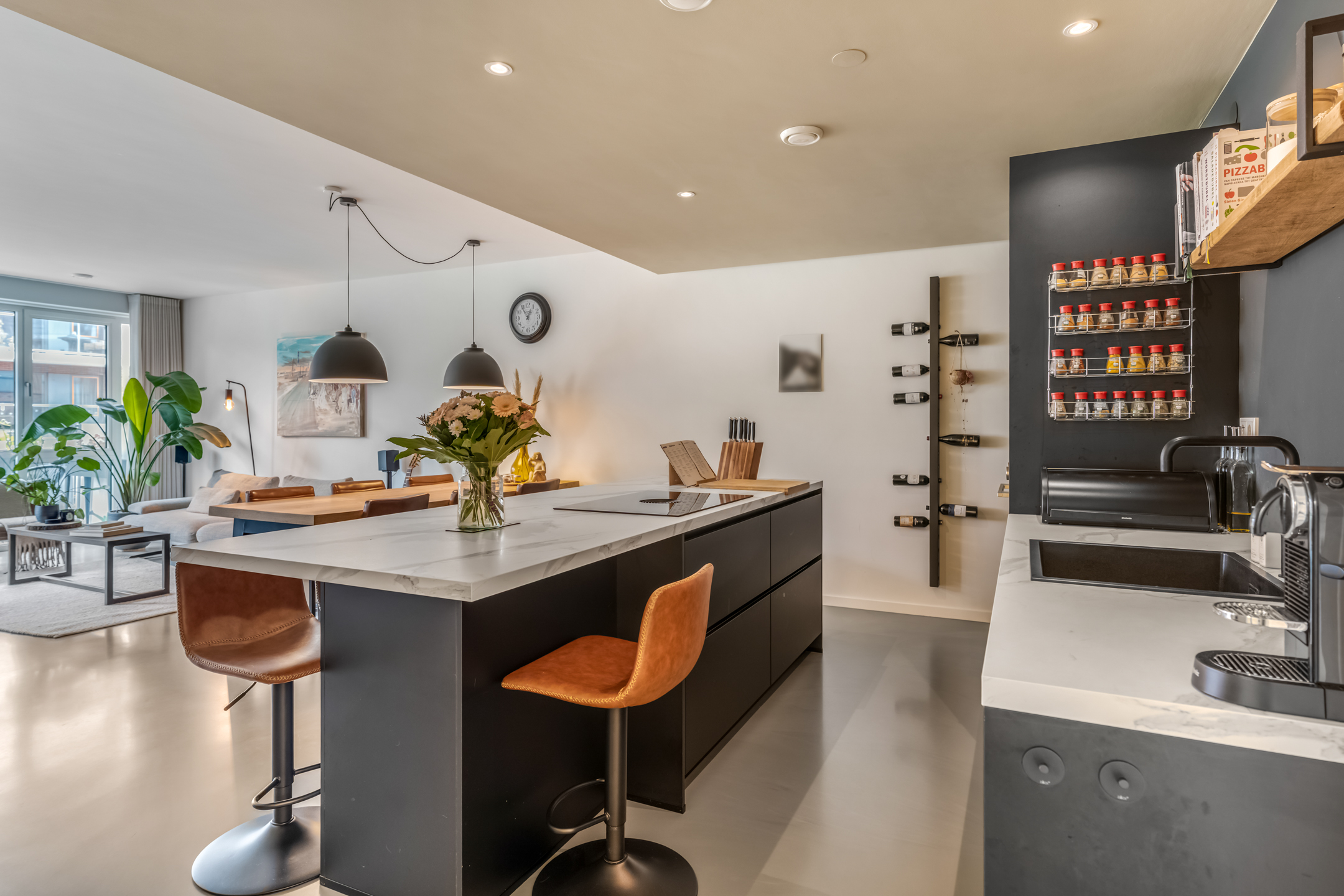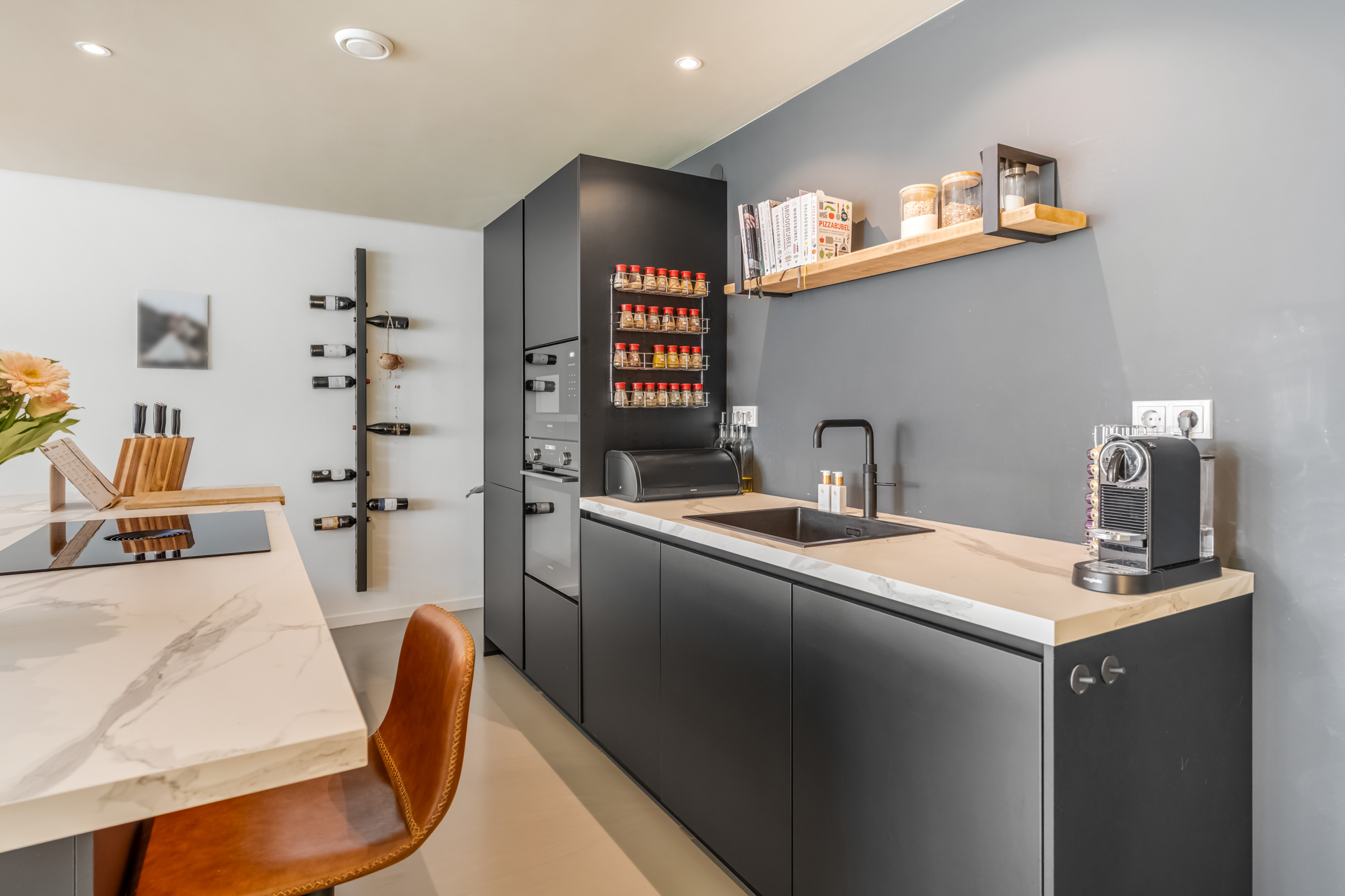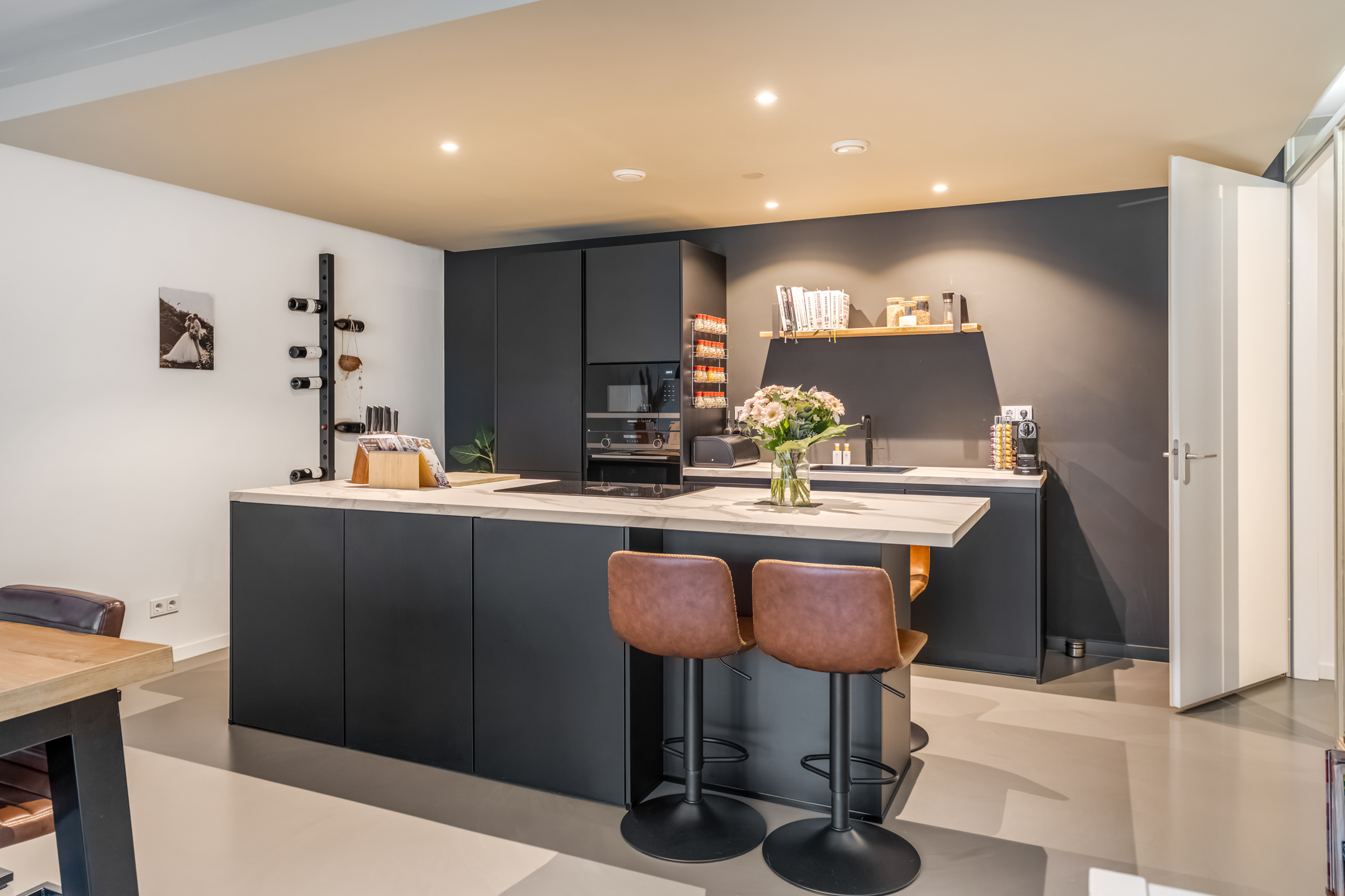 De open keuken sluit perfect aan op het leefgedeelte en is uitgevoerd met een stijlvol kookeiland. Het plafond in de keuken is verlaagd waardoor er een leuk effect ontstaat. De keuken is voorzien van diverse inbouwapparatuur zoals een kookplaat met geïntegreerde afzuigkap, combi-oven, koel-vriescombinatie en een vaatwasser. Het kookeiland is ideaal voor wie van koken houdt én graag contact houdt met gasten of het gezin. Terwijl jij aan het koken bent, schuift de rest gezellig aan.