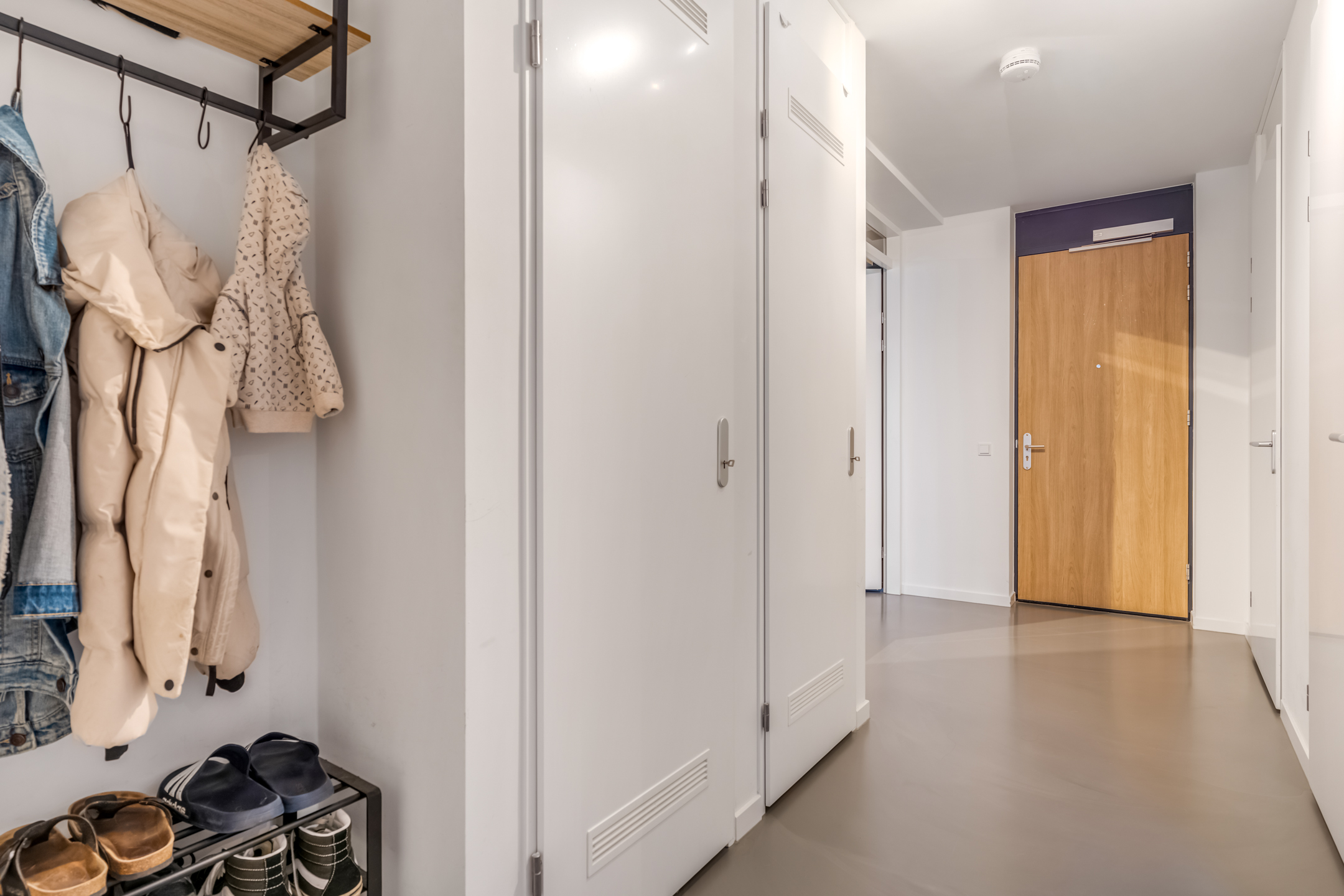 Het appartement bevindt zich op de tweede verdieping. Bij binnenkomst valt direct de verzorgde afwerking op. Vanuit de entree heb je toegang tot alle vertrekken. Via de hal komen we als eerst in de living, welke erg licht is door de grote raampartijen in de woning.