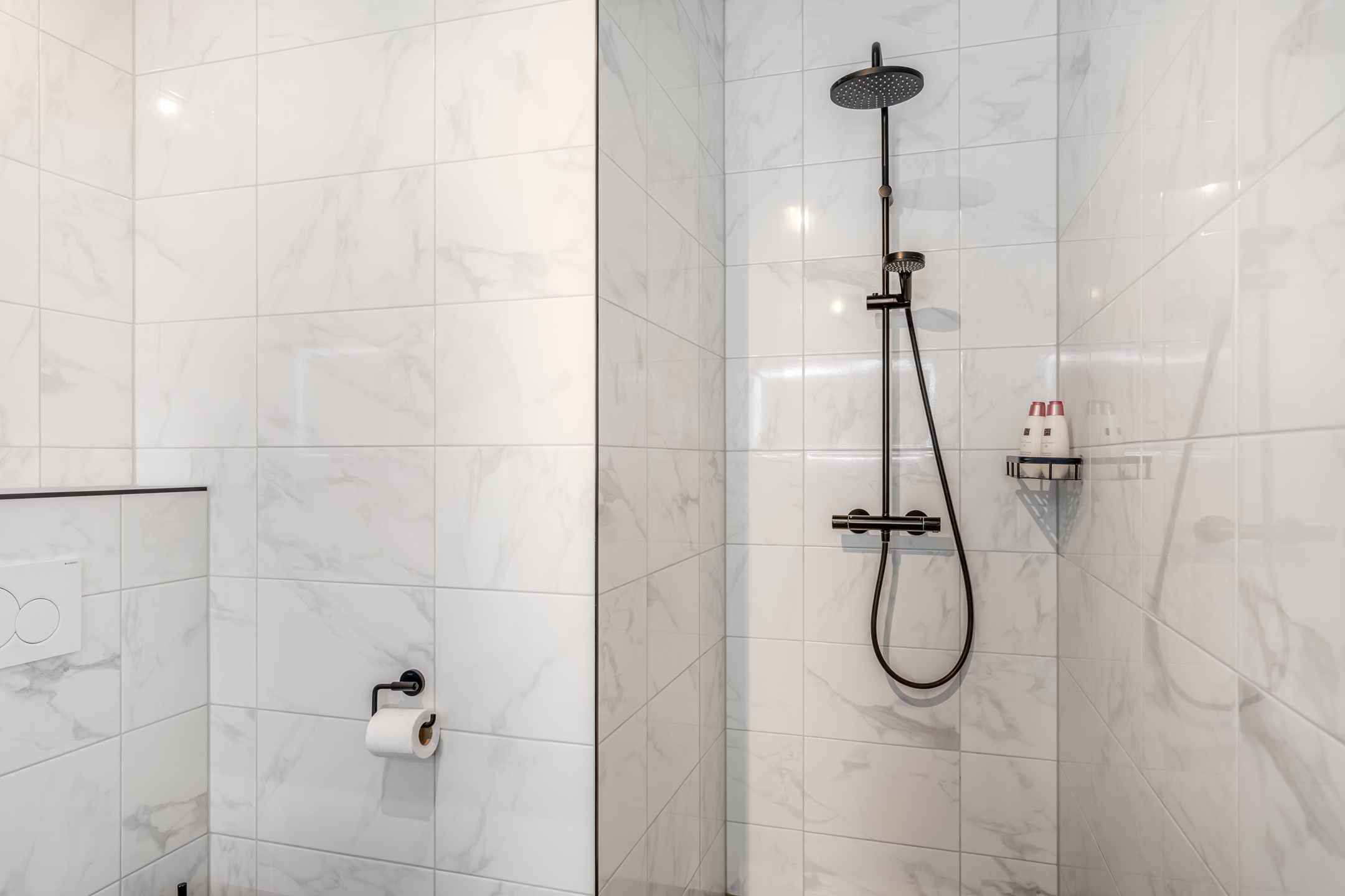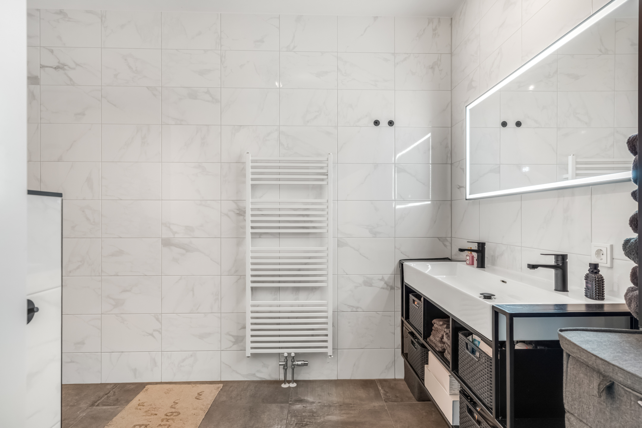 De badkamer is modern ingericht en van alle gemakken voorzien. Zo is de badkamer voorzien van een stijlvol wastafelmeubel, een ruime inloopdouche en een designradiator die zorgt voor een aangename temperatuur én een luxe uitstraling.