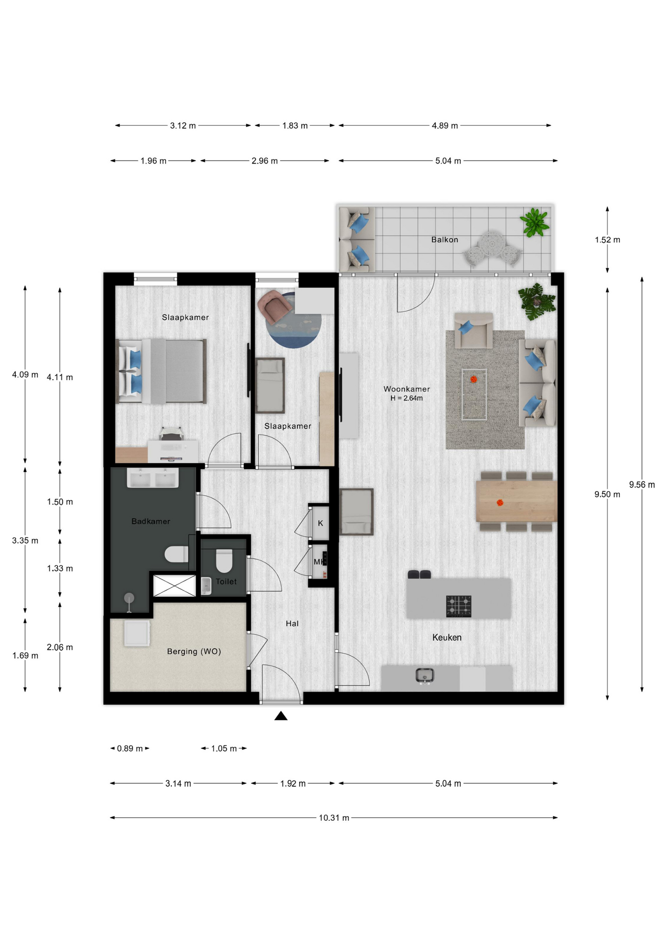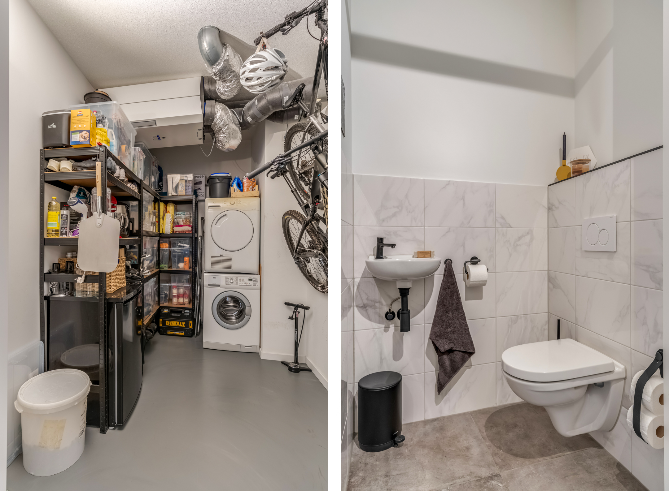 In de hal vind je ook nog een inpandige berging. In de inpandige berging kun je heel wat spullen netjes uit het zicht opbergen. Hier vind je bovendien de warmteterugwininstallatie (WTW) én de aansluitingen voor de wasmachine en droger, keurig weggewerkt in een kast. Als je doorloopt komen we bij de toiletruimte, welke beschikt over een hangend toilet en een fonteintje. Aan het einde van de hal vinden we de twee slaapkamers. De master bedroom is ruim van opzet en biedt voldoende plek voor een tweepersoonsbed en een grote kledingkast. De tweede kamer is wat compacter, maar daardoor juist perfect als kinderkamer, thuiskantoor, hobbyruimte of logeerkamer. Net waar jij behoefte aan hebt, de indeling laat zich makkelijk aanpassen aan jouw levensfase of woonwensen.