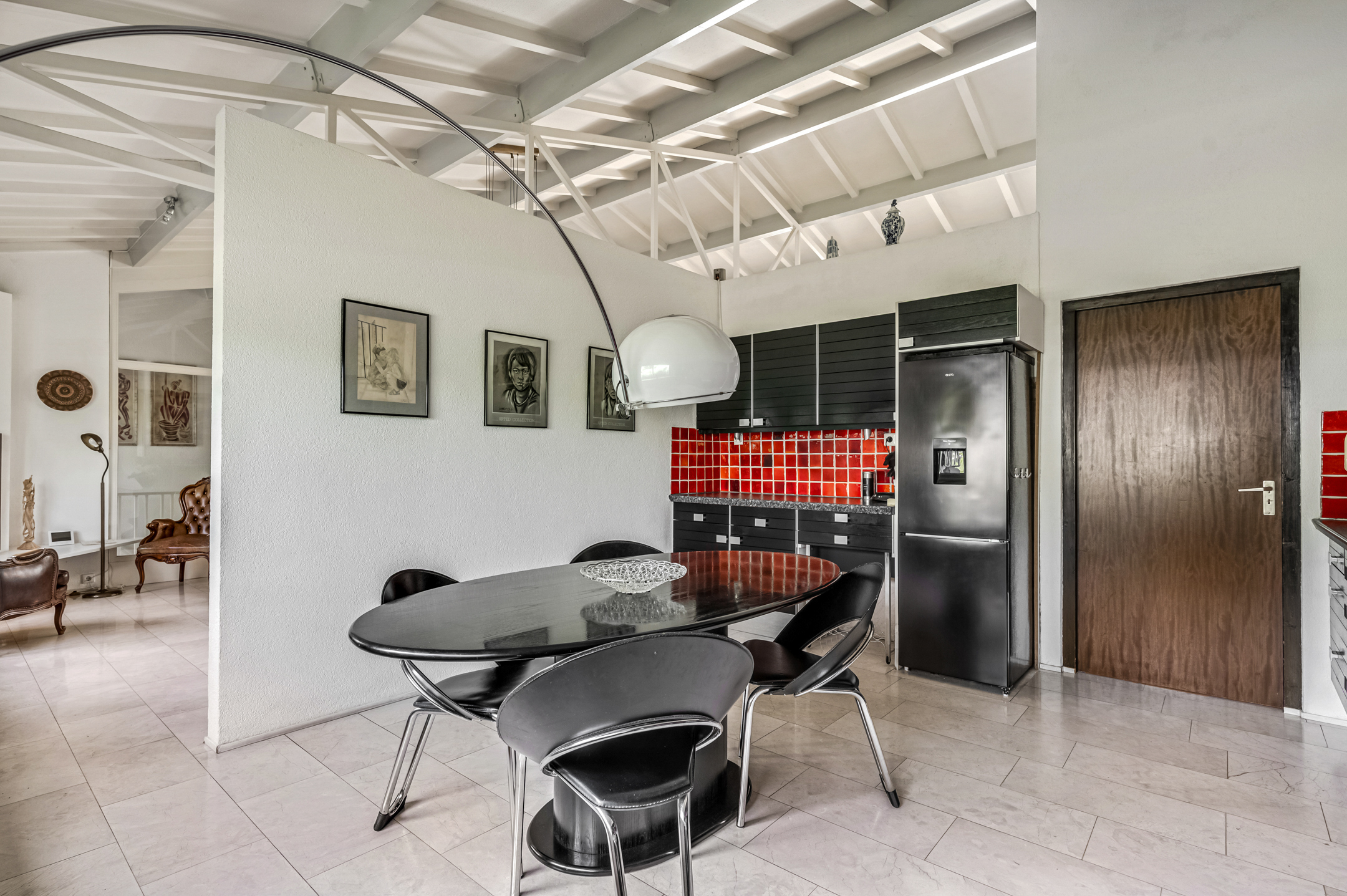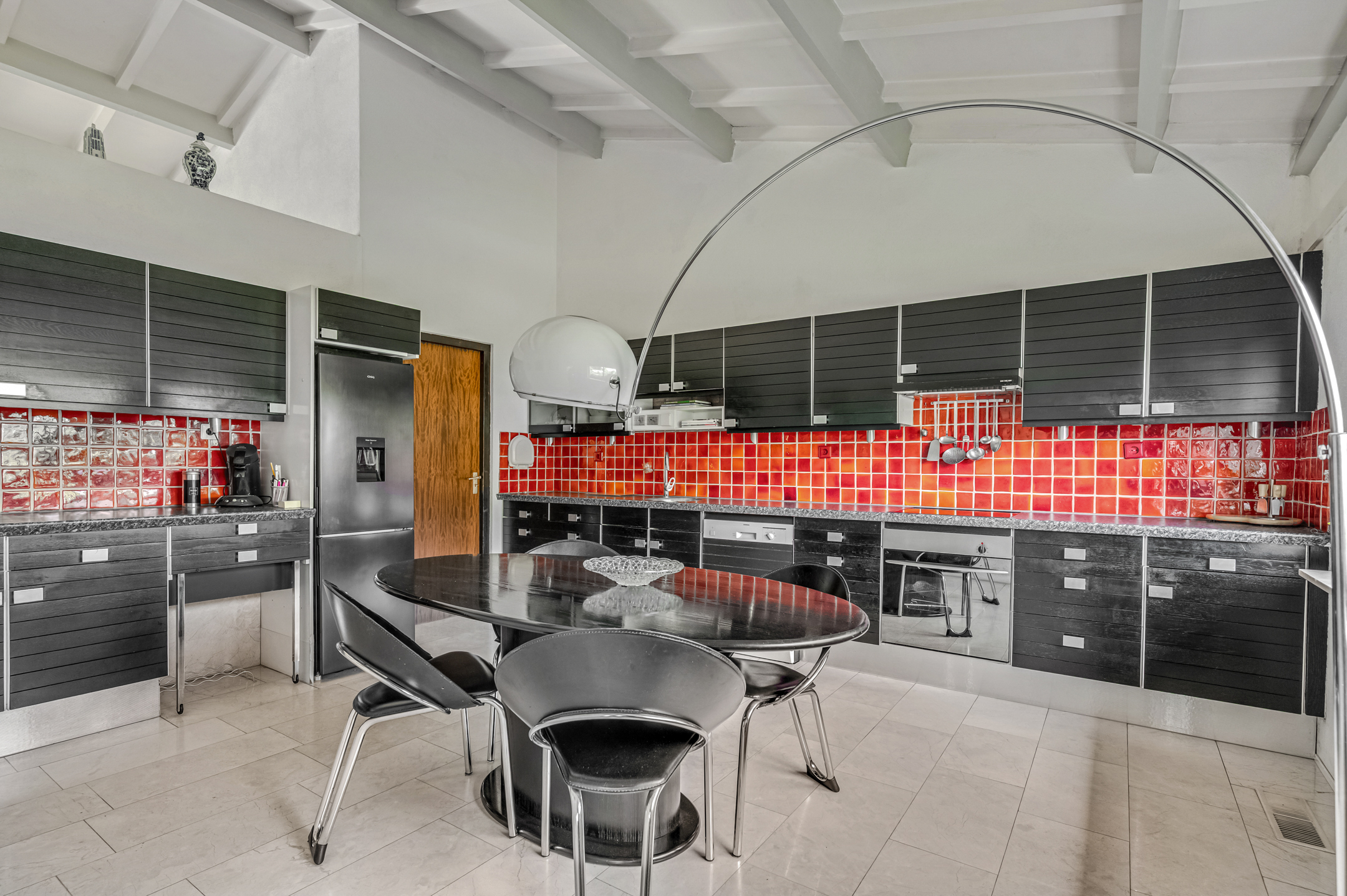 De keuken is half afgescheiden van de woonkamer. De royale keuken is voorzien van een losse koelkast, vaatwasser, oven, 4-pits inductiekookplaat en afzuigkap. Er is bovendien ruimte genoeg voor een eettafel met stoelen, waardoor dit een gezellige plek is om samen te koken en te eten. Naast de keuken bevindt zich een praktische bijkeuken met wasmachine- en drogeraansluitingen, de opstelling van de CV-ketel, de omvormer van de zonnepanelen en extra bergruimte.