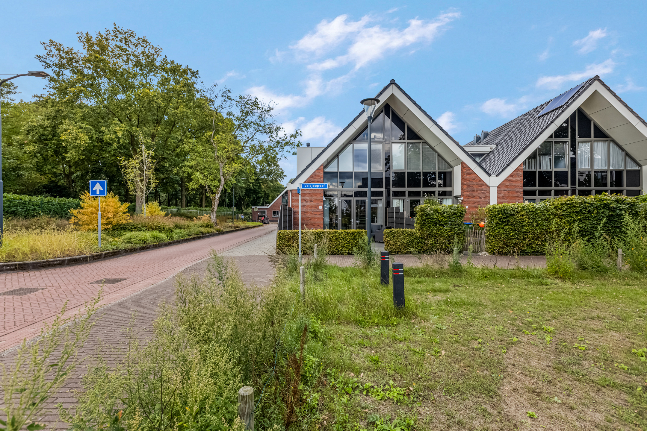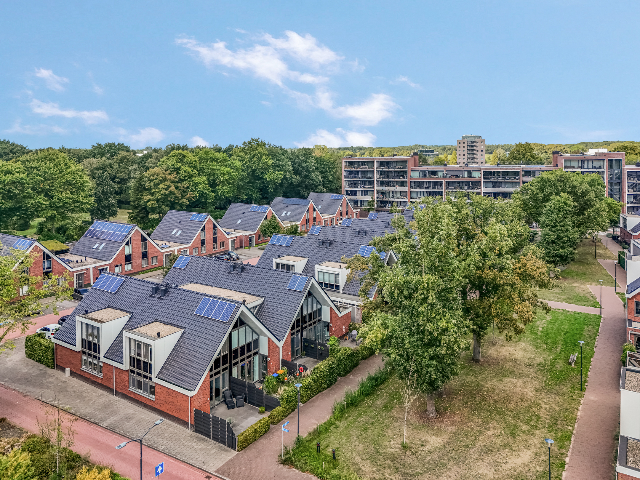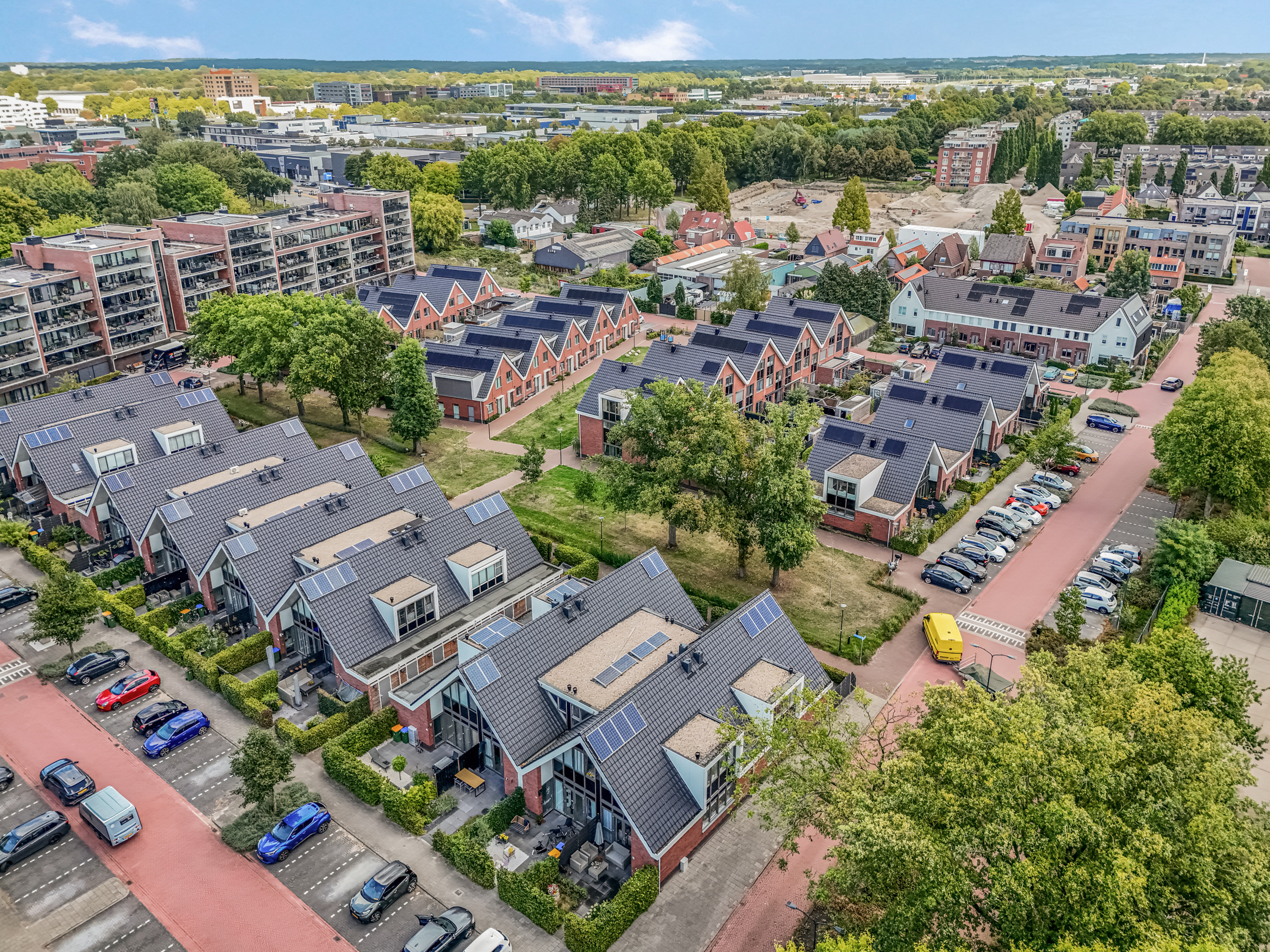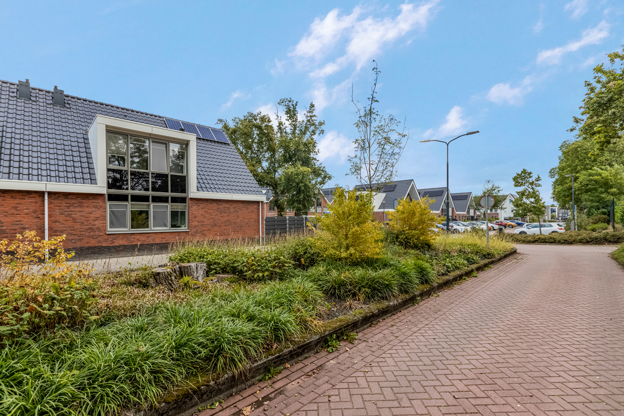 Aan het einde van deze rij-geschakelde woningen bevindt zich een eigen houten berging waar je beschikt over elektriciteit en natuurlijk genoeg opbergruimte. Een prima plek voor de fietsen en andere opslag. Aan de rechterkant van de straat is er een openbare parkeerplaats met laadpallen voor het opladen van elektrische auto’s te vinden. Hier is genoeg plek om jouw auto te parkeren.