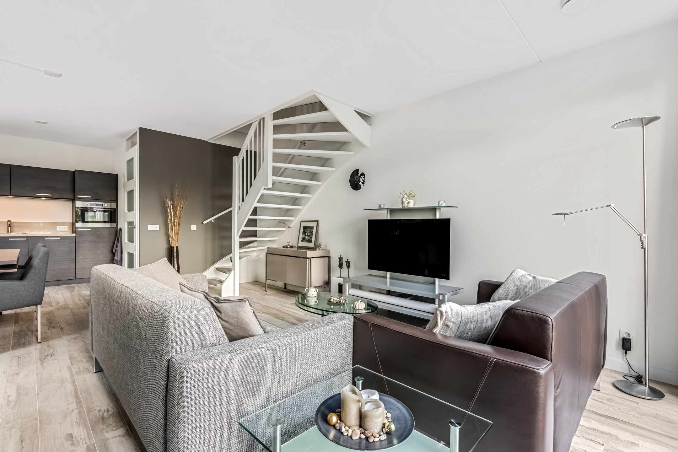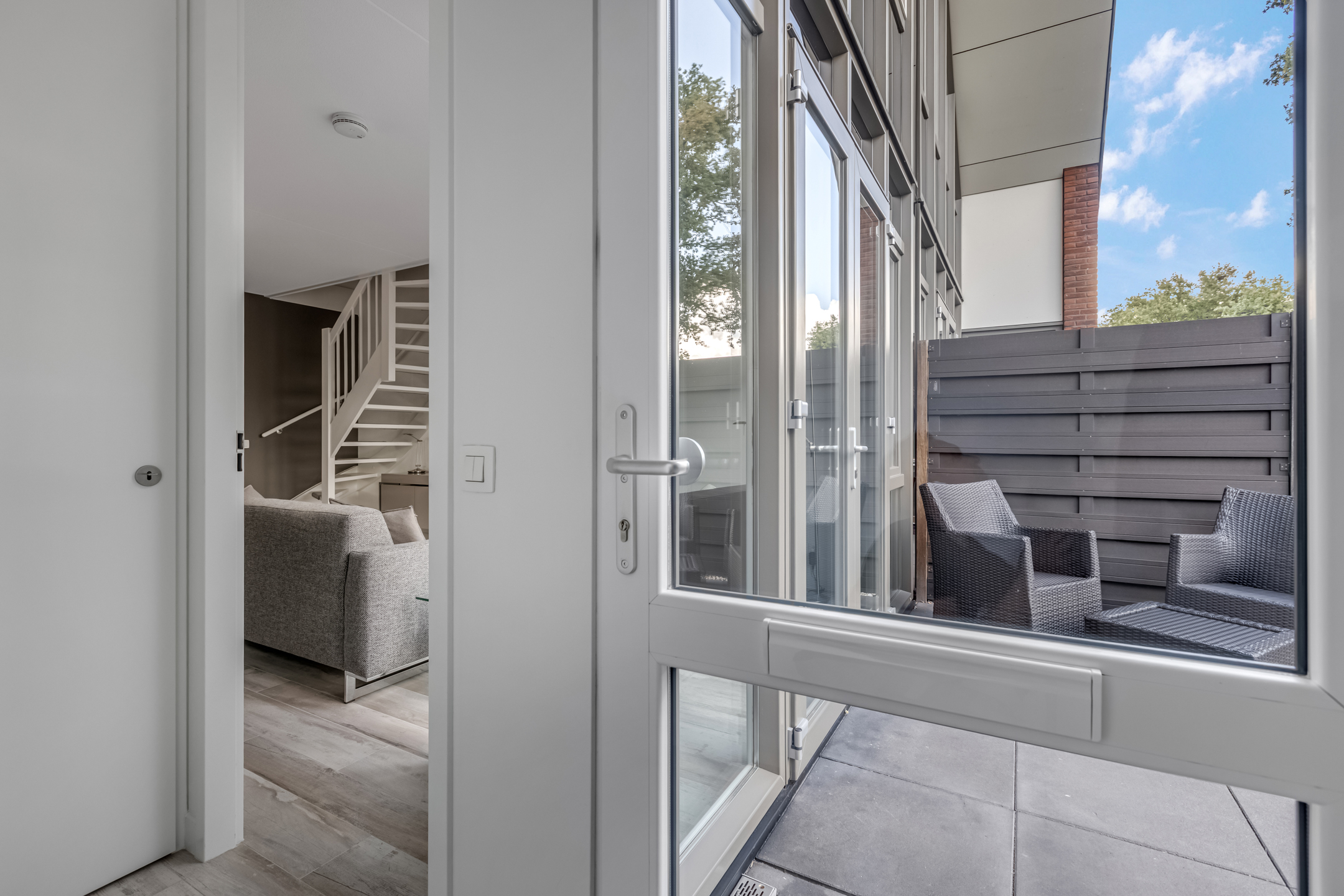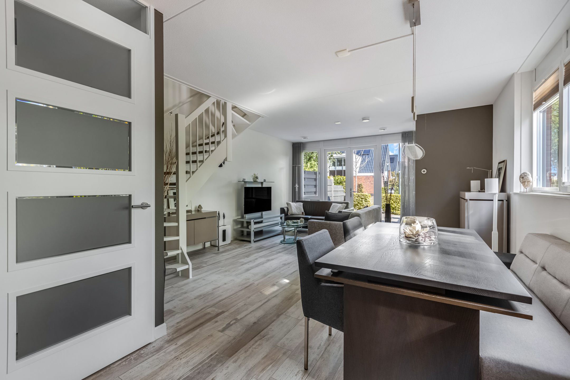 Via de tuin kom je bij de voordeur die toegang geeft tot de hal waar zich de garderobe en de meterkast zich bevinden. Vanuit de hal stap je zo de sfeervolle living binnen, waar je meteen wordt verwelkomd door een open en lichte ruimte. Aan de voorzijde van de woning bevindt zich de heerlijke zithoek met openslaande deuren naar de tuin. Zet je de dubbele openslaande deuren in de zomerperiode open, dan is de tuin een verlengstuk van je woonkamer. Aan de achterzijde van de woning is de moderne, open keuken in L-opstelling gesitueerd. In het midden van de living vind je de eetgedeelte.