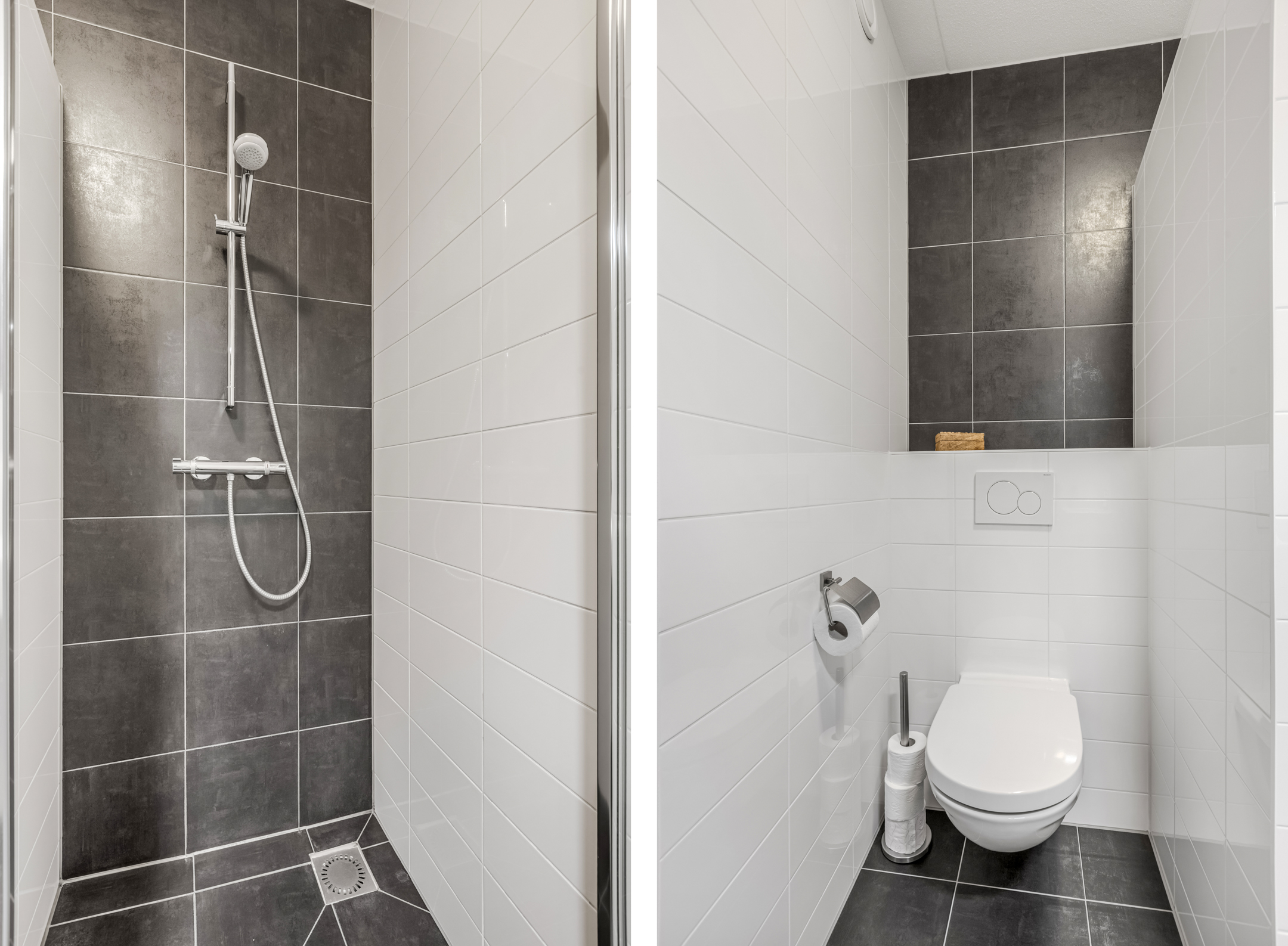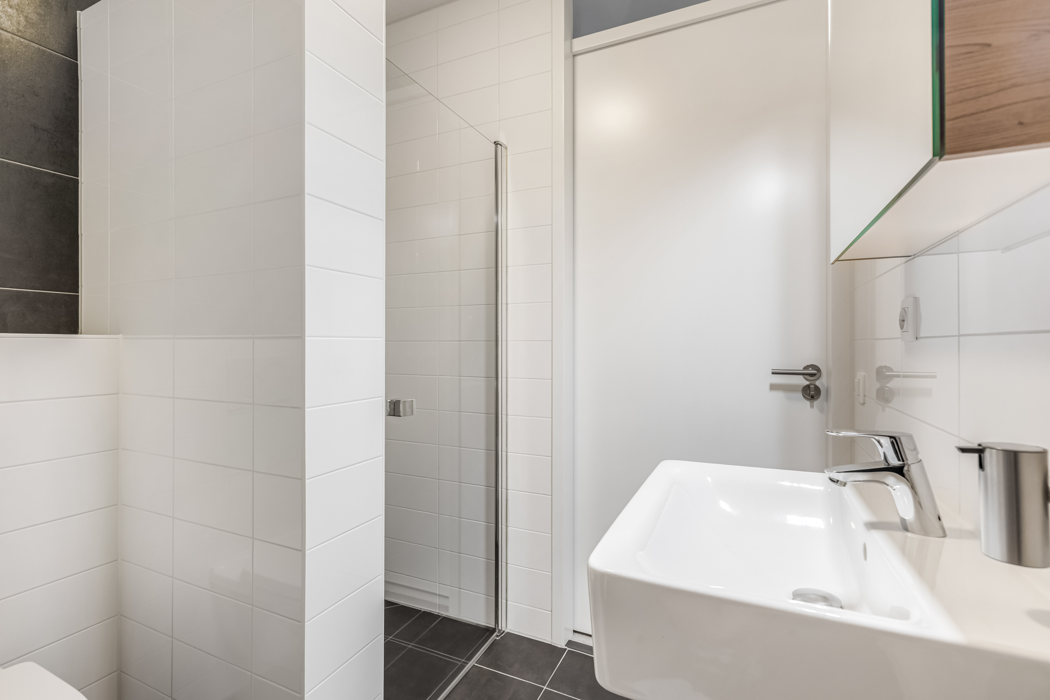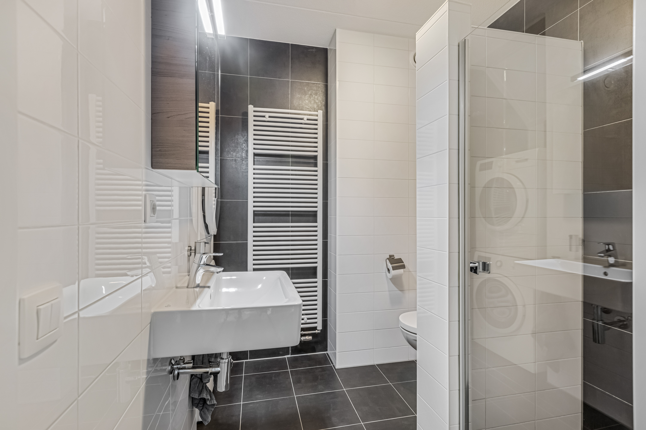 - Badkamer voorzieningen Toilet, douche, wastafelmeubel, wasmachineaansluiting