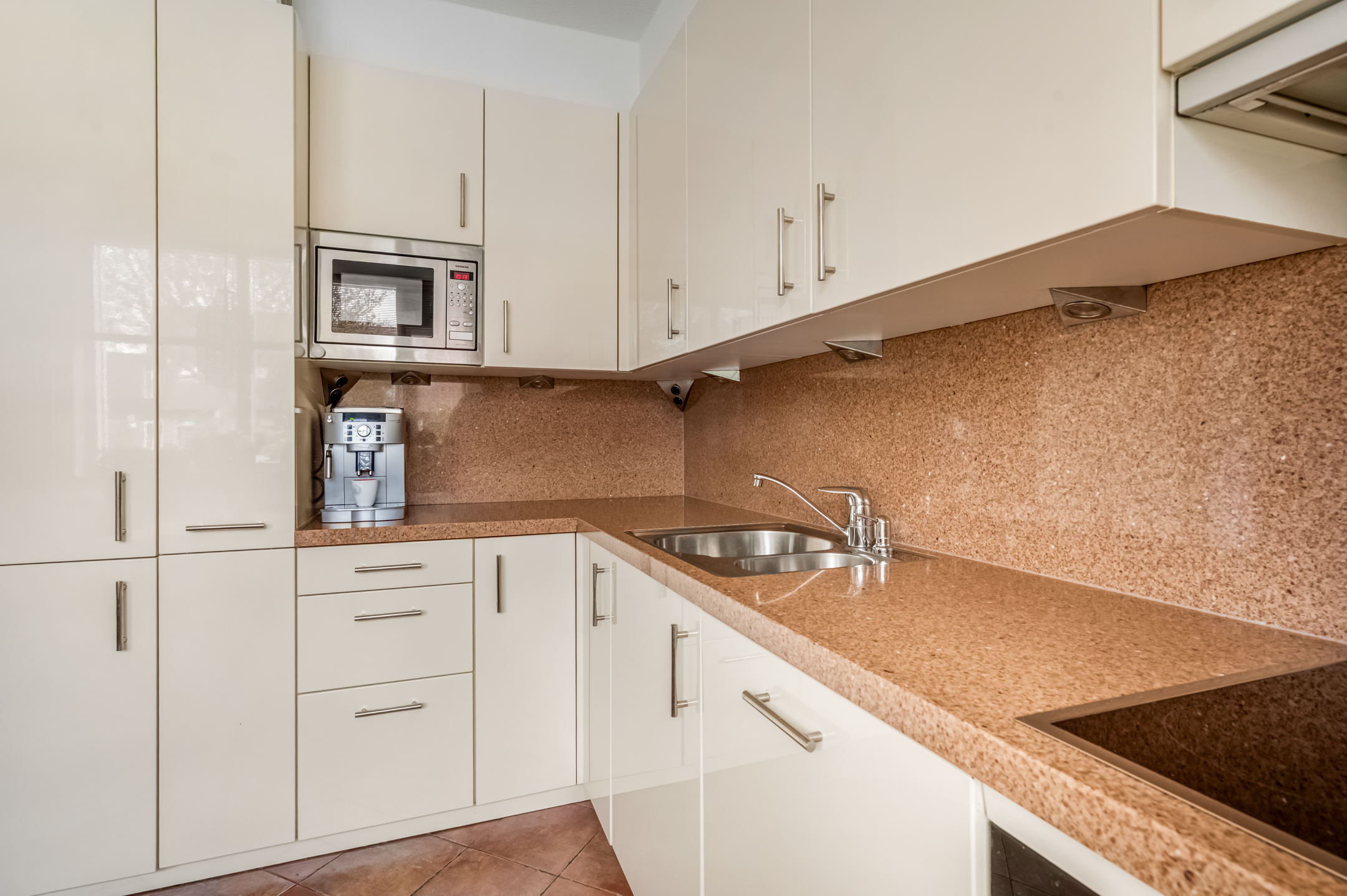 Aan de voorzijde bevindt zich de keuken, voorzien van plavuizen, waar ruimte is voor een gezellige eethoek om heerlijk te kunnen ontbijten of om een drankje te doen aan het einde van de dag. Via het tussenportaal bereik je de moderne toiletruimte en de vaste trap naar de eerste verdieping. De toiletruimte is voorzien van een hangend toilet en een fontein.