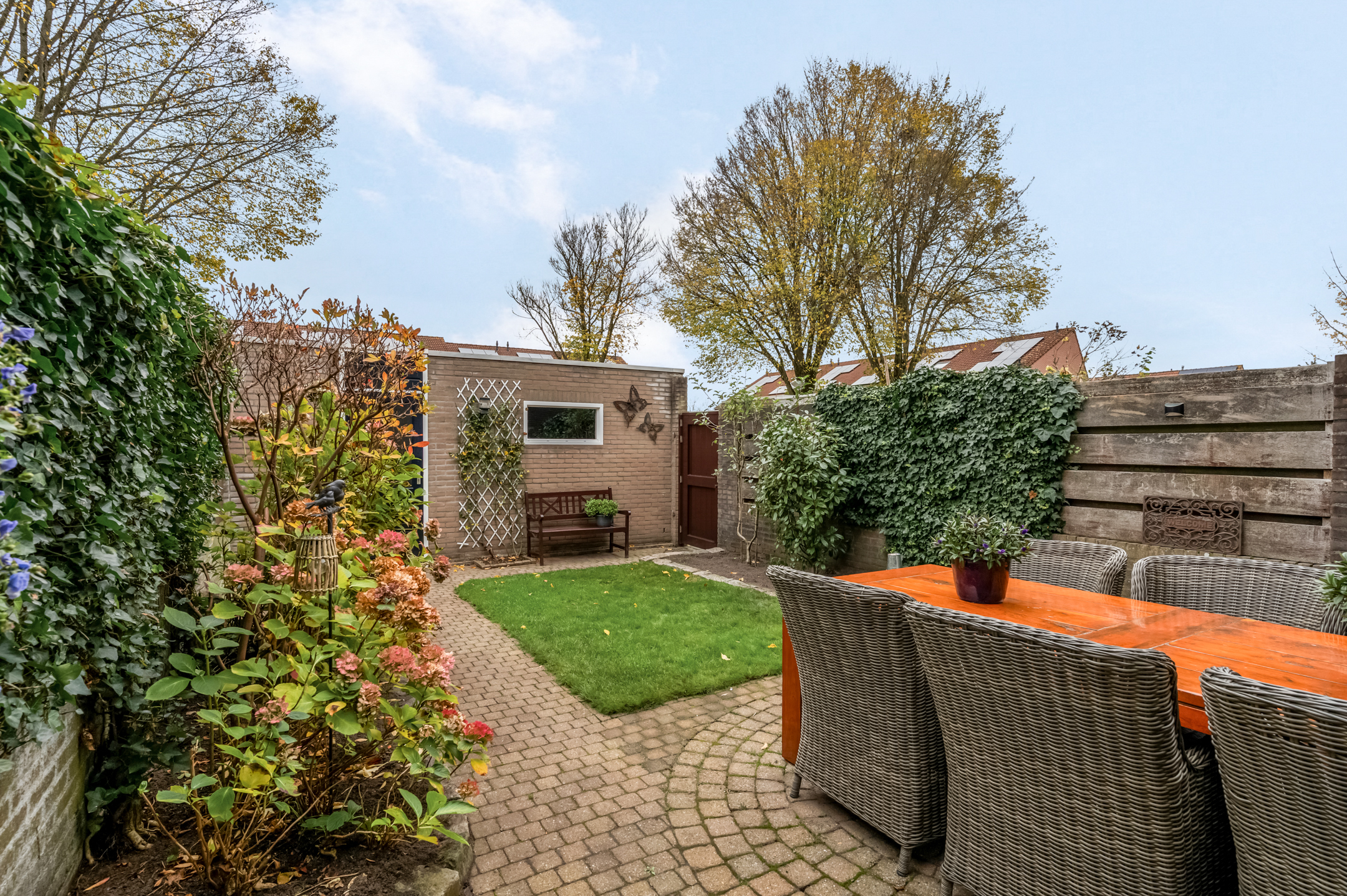 De verzorgde achtertuin ligt op het noordwesten en biedt volop zon in de middag en avond. De tuin heeft een achterom via de zijkant. Op zonnige dagen zorgt het handmatig bedienbare zonnescherm aan de achterzijde voor aangename verkoeling.