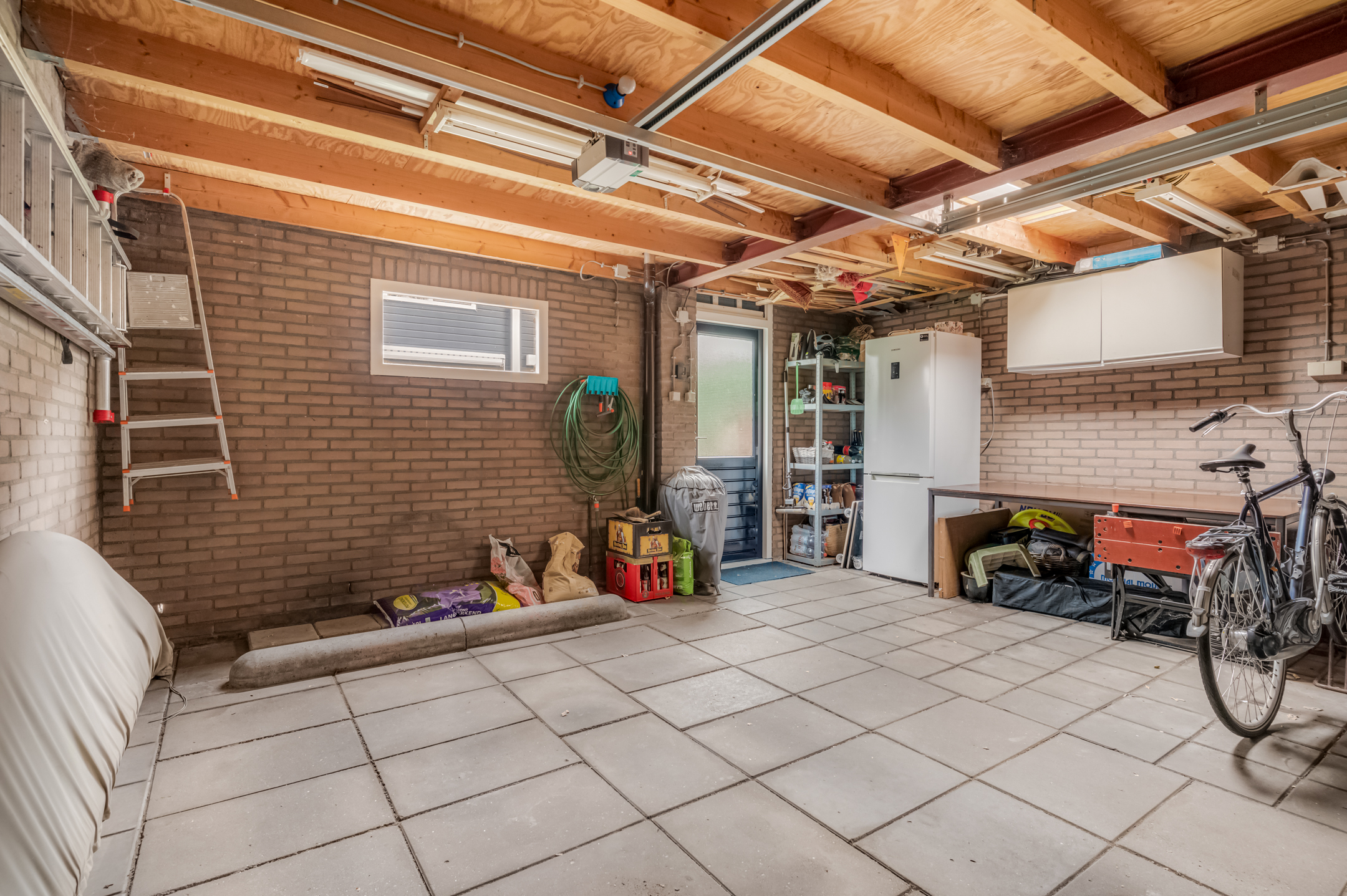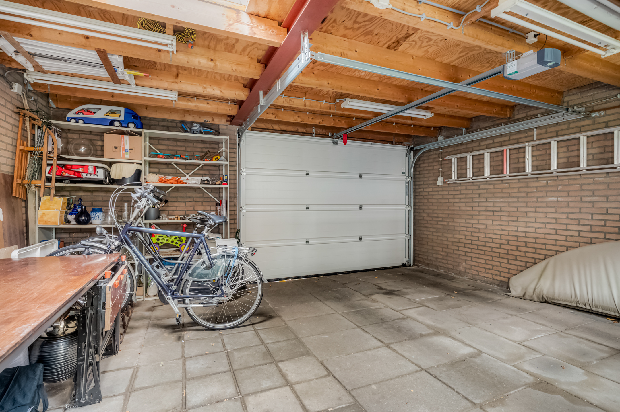 De garage is een absoluut pluspunt: royaal van formaat, over de gehele breedte van het perceel en voorzien van een elektrische overheaddeur. Perfect voor het plaatsen van fietsen, het opbergen van tuingereedschap en om de auto droog en veilig te parkeren.