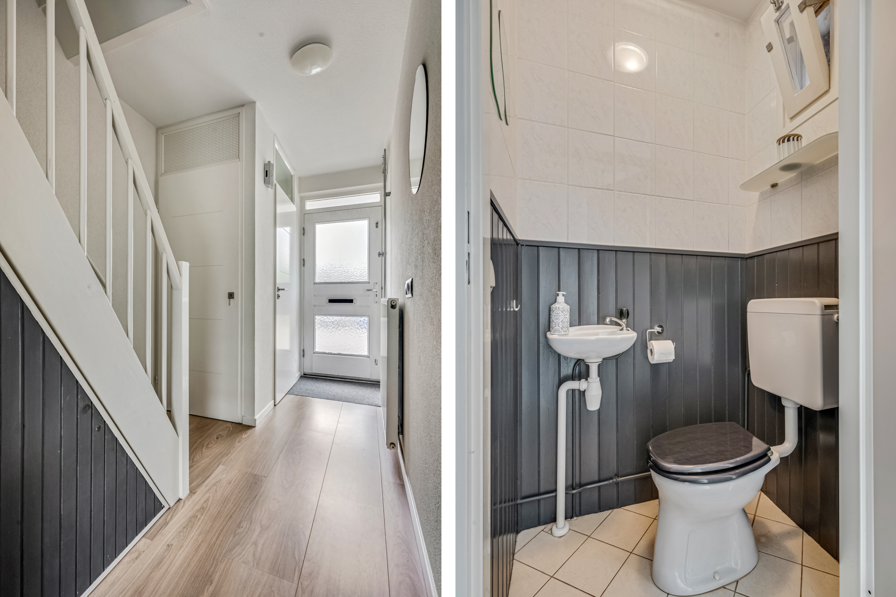Via de ruime, strak aangelegde voortuin bereik je de entree van de woning. Via de voordeur kom je binnen in de hal voorzien van een toiletruimte met fonteintje, trapopgang naar de eerste verdieping en toegang tot de living.