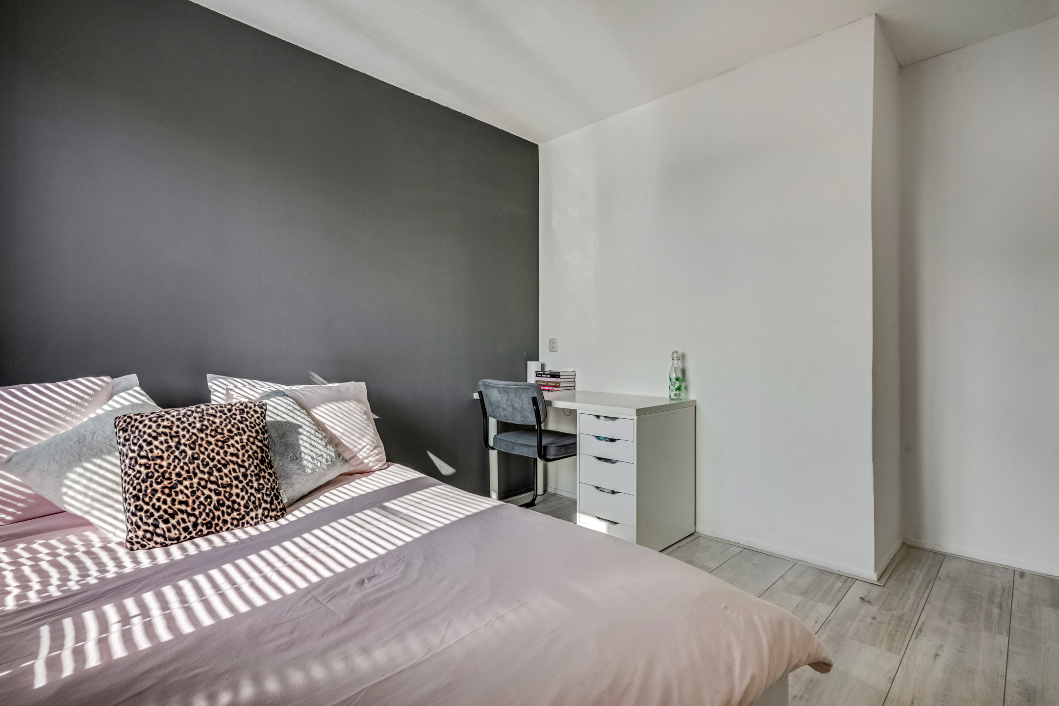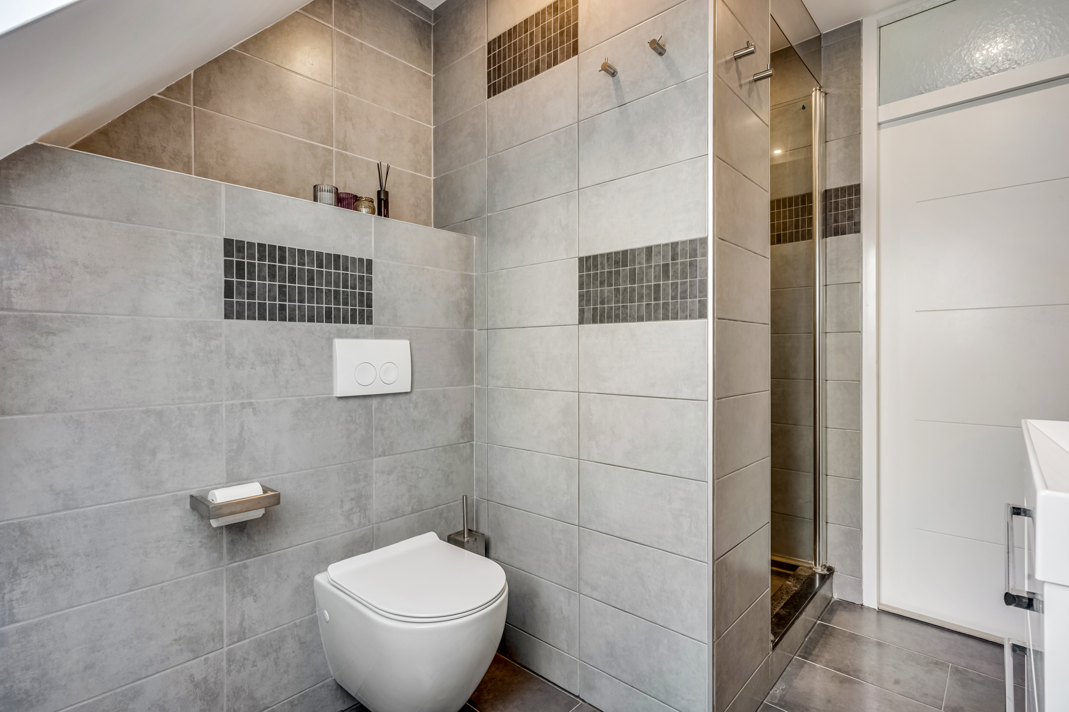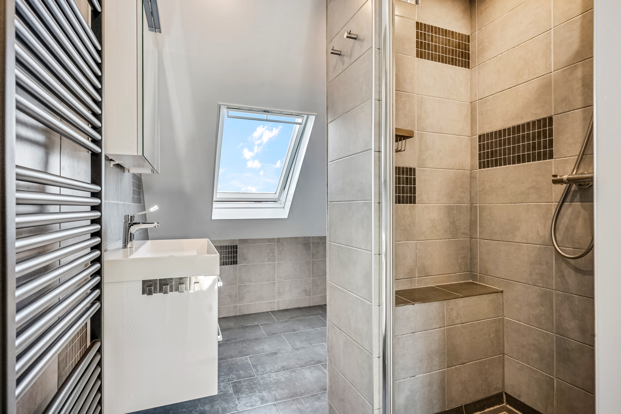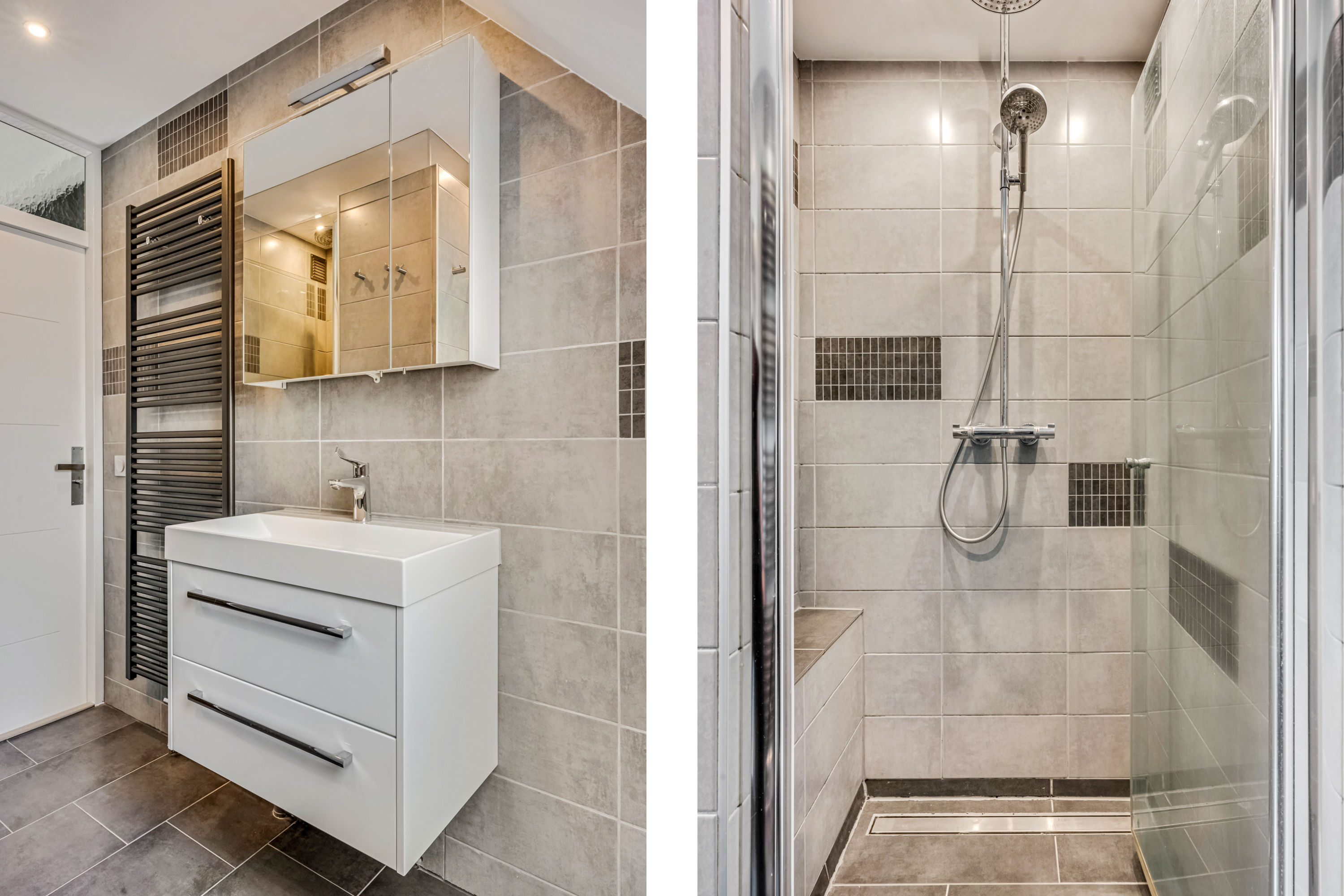 De volledig betegelde badkamer ligt aan de achterzijde van de woning en is modern afgewerkt met lichtgrijze wandtegels en een donkere vloertegel en is voorzien van een ruime douche, een stijlvol wastafelmeubel met spiegelkast, een hangend designradiator én een tweede toilet. Een verzorgde en comfortabele ruimte waar je de dag fris begint en ontspannen afsluit.