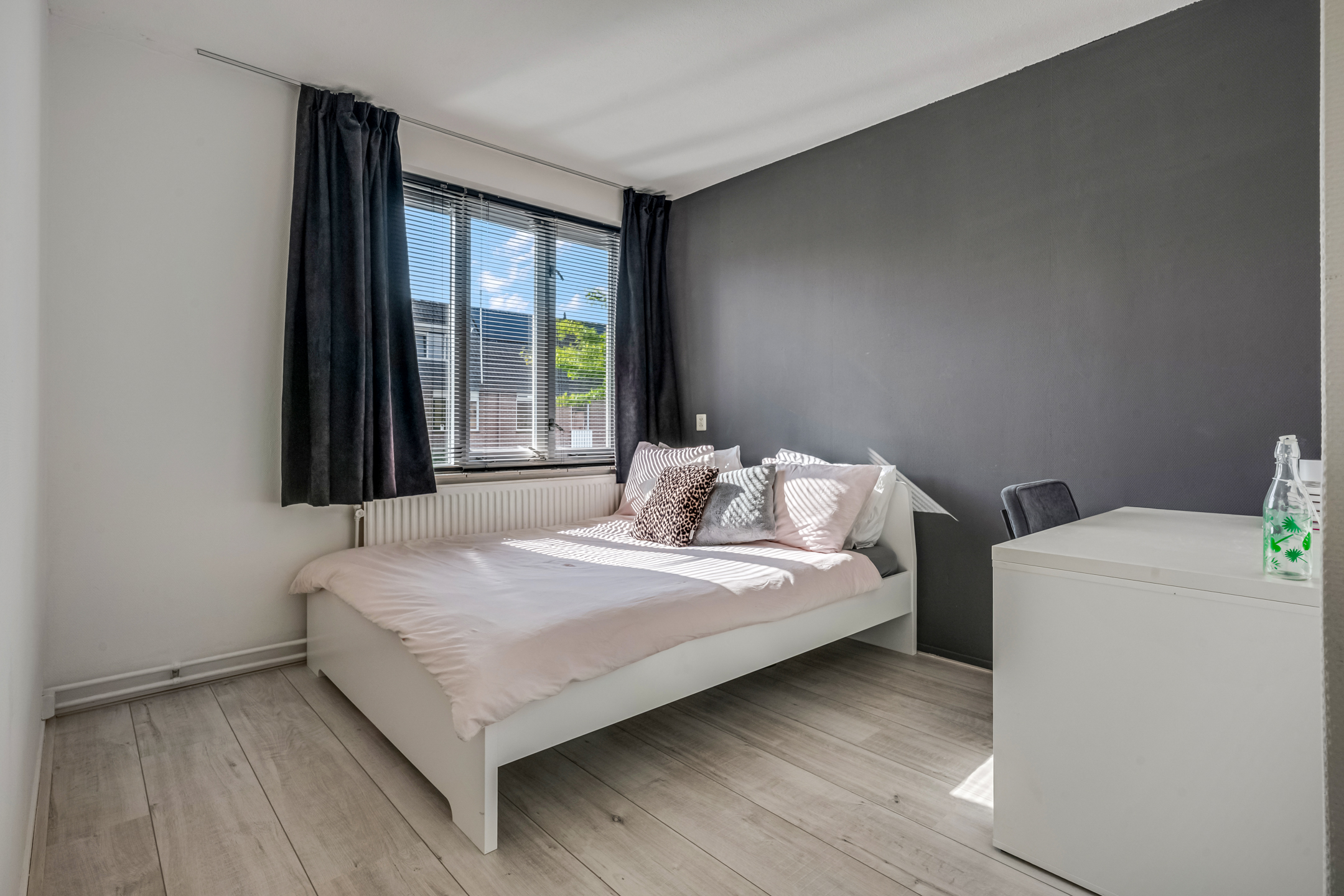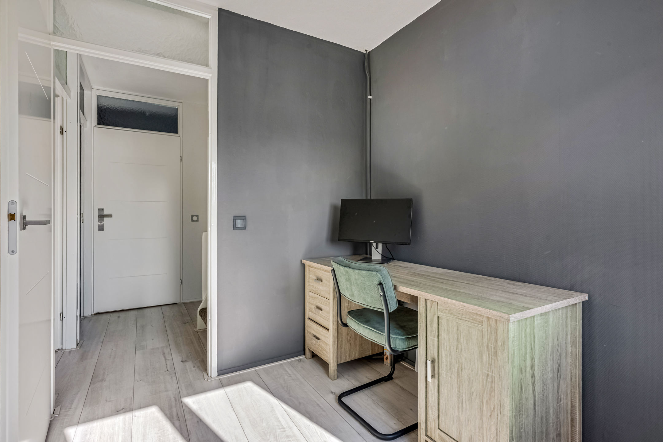 Via de vaste trap vanaf de begane grond kom je op de overloop van de eerste verdieping. Vanuit hier heb je toegang tot drie slaapkamers en de badkamer. Aan de achterzijde bevindt zich de ruime ouderslaapkamer, waar met gemak een tweepersoonsbed en een grote kledingkast geplaatst kan worden. De andere twee slaapkamers zijn voorzien van een lichte laminaatvloer en bieden voldoende ruimte voor een kinderkamer, werkkamer of logeerkamer.