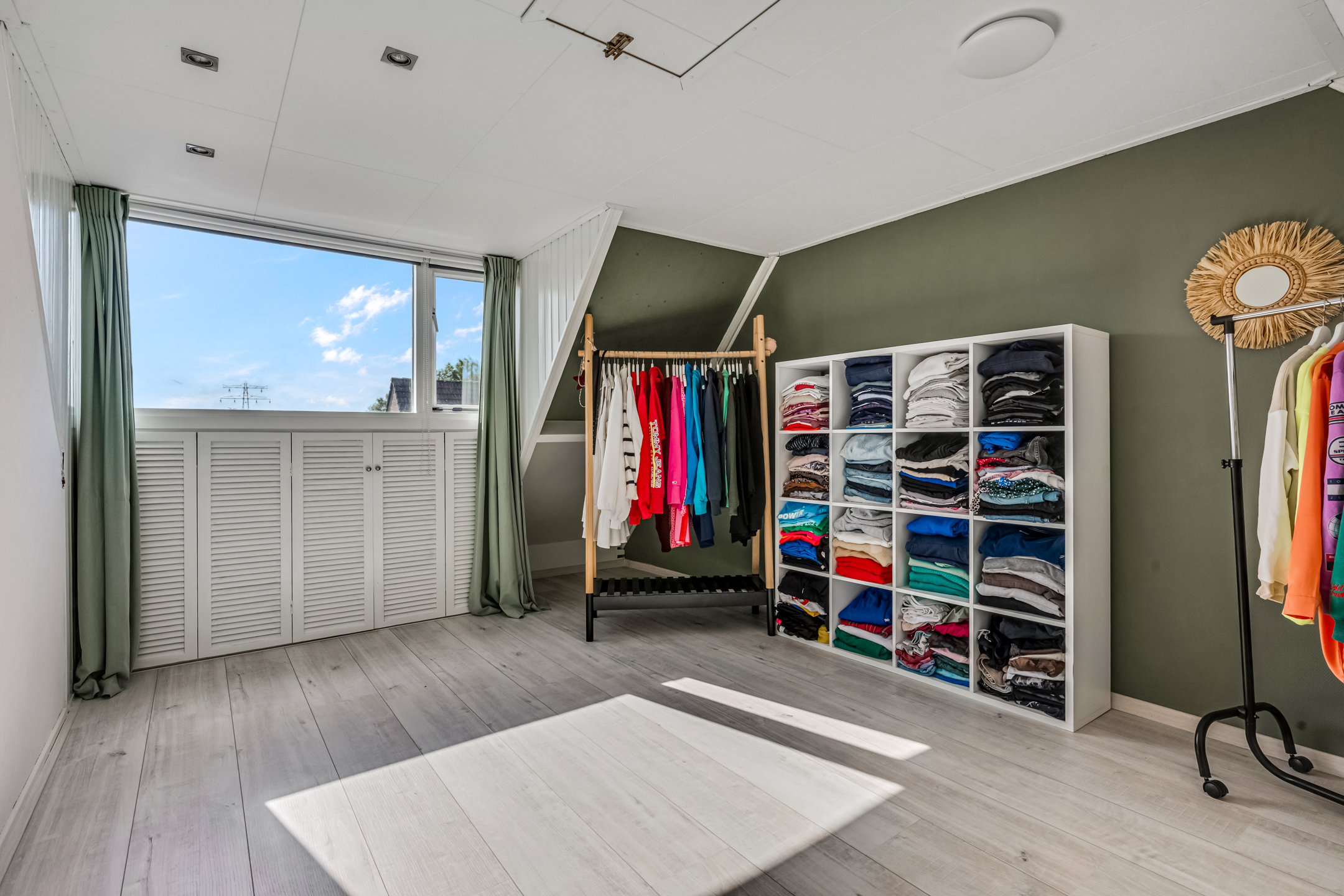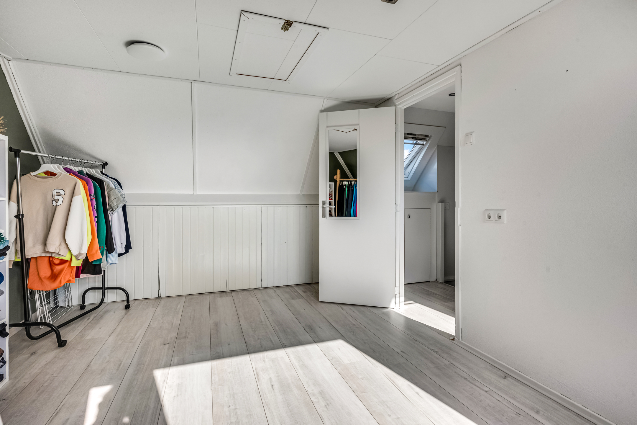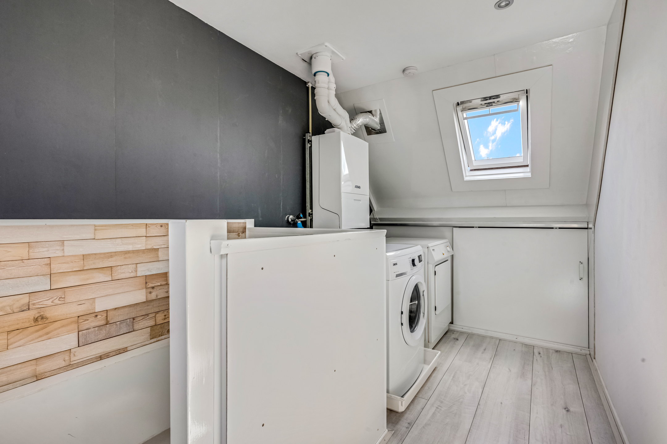 Via de vaste trap bereiken we de voorzolder van de tweede verdieping. Hier bevindt zich een berging met de CV-ketel en de aansluitingen voor de wasmachine en droger. Daarnaast vind je hier slaapkamer nummer vier welke is voorzien van twee grote dakramen en opbergruimte achter de knieschotten.