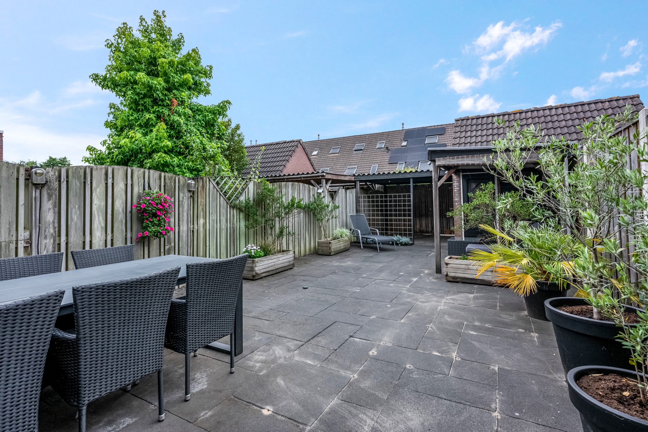 Zowel vanuit de woning als via de achterom is de onderhoudsvriendelijke achtertuin te bereiken. De tuin is volledig betegeld, wat zorgt voor een strakke en verzorgde uitstraling én weinig onderhoud. Dankzij de ligging op het westen geniet je hier volop van de middag- en avondzon – ideaal voor een gezellige barbecue met vrienden of om lekker te ontspannen met een goed boek en een glas wijn.