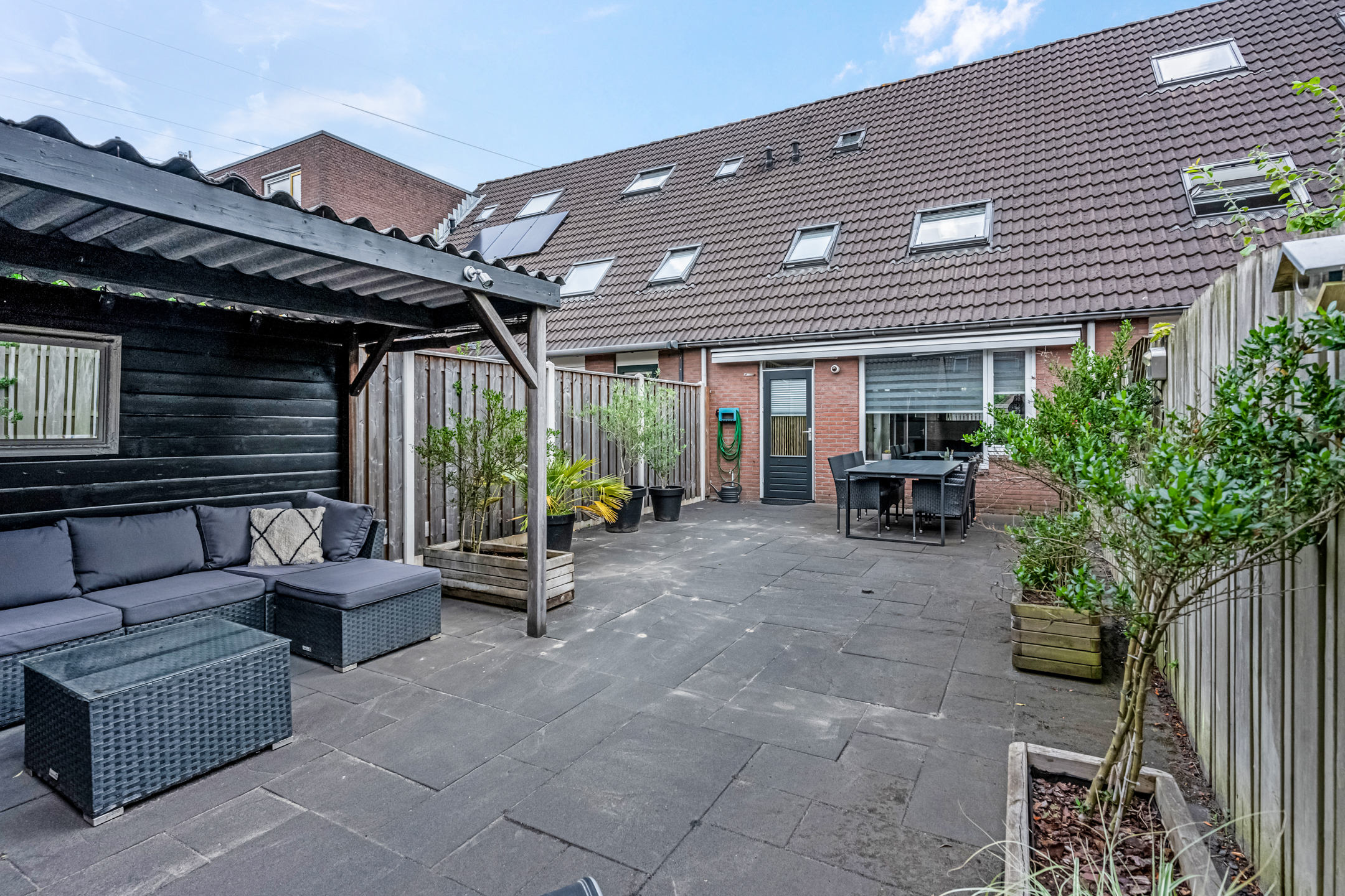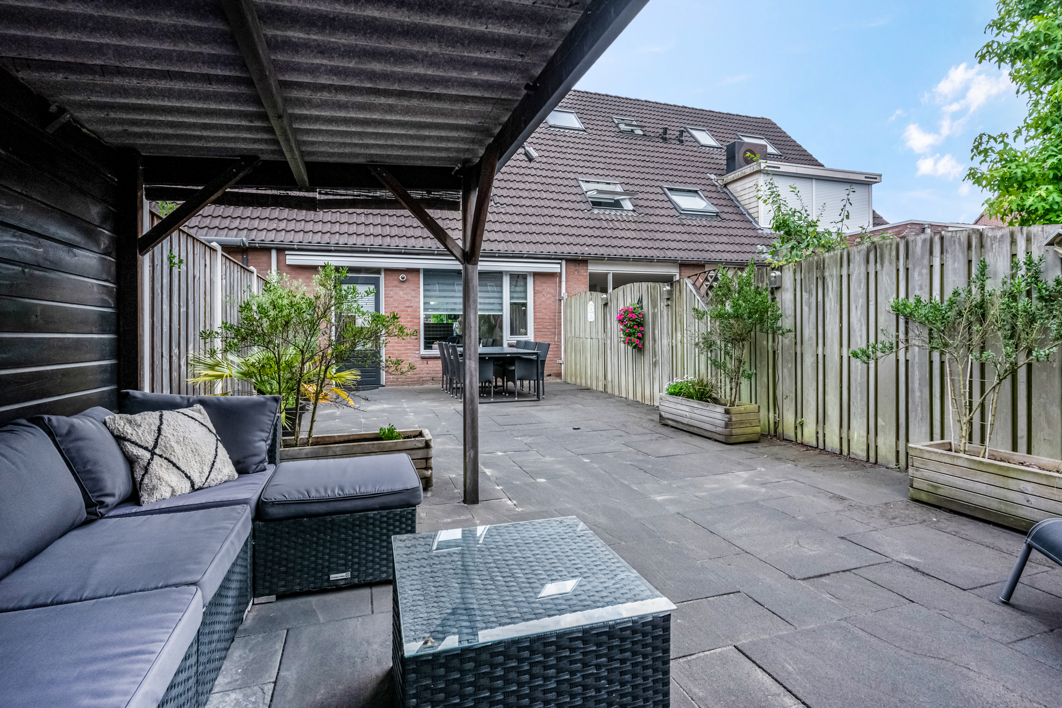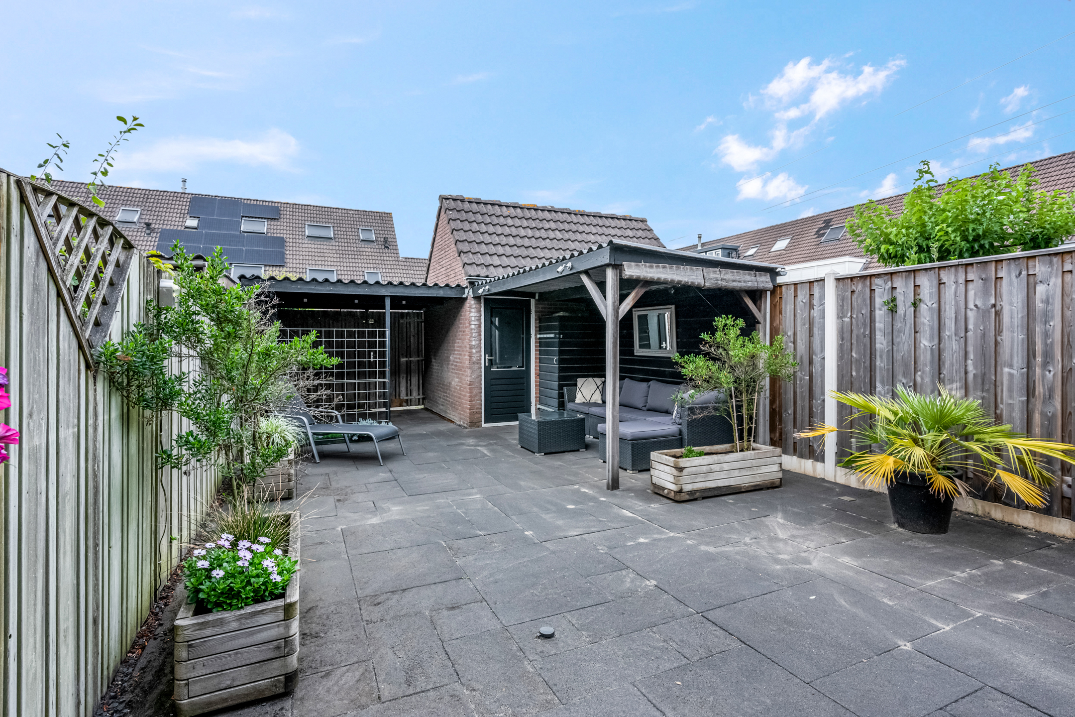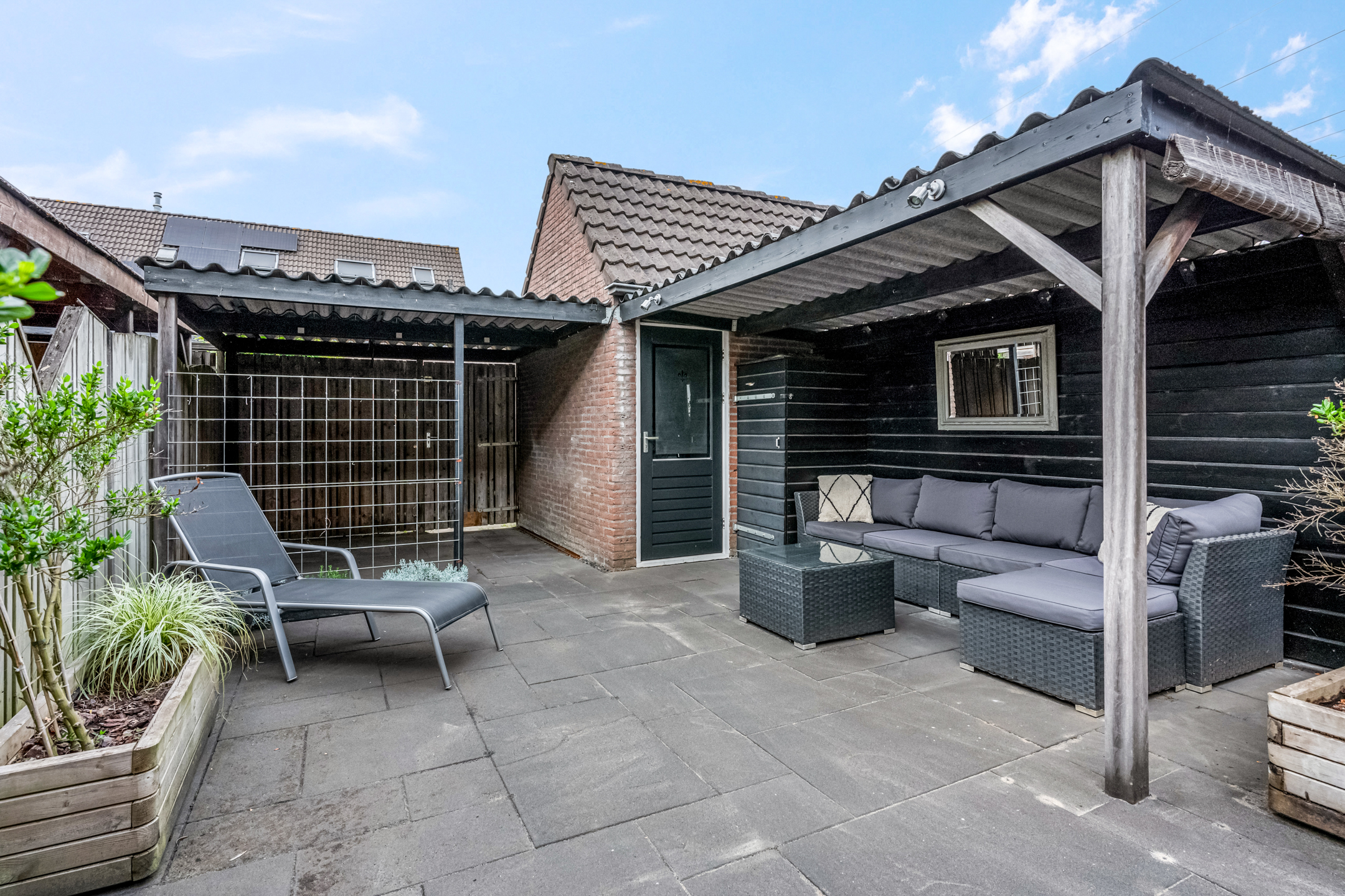 Achterin de tuin staat een stenen berging waar je al je (tuin)gereedschap in kwijt kunt, maar ook gemakkelijk je fietsen in kunt opbergen. Aan deze berging is een sfeervolle overkapping geplaatst, waar momenteel een comfortabele lounge set staat. Een heerlijke plek om tot in de late uurtjes buiten te zitten en te genieten van je eigen buitenruimte.