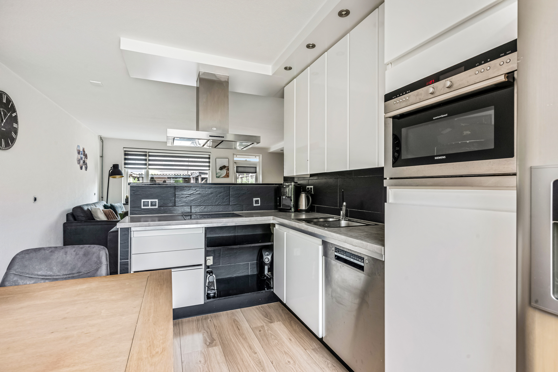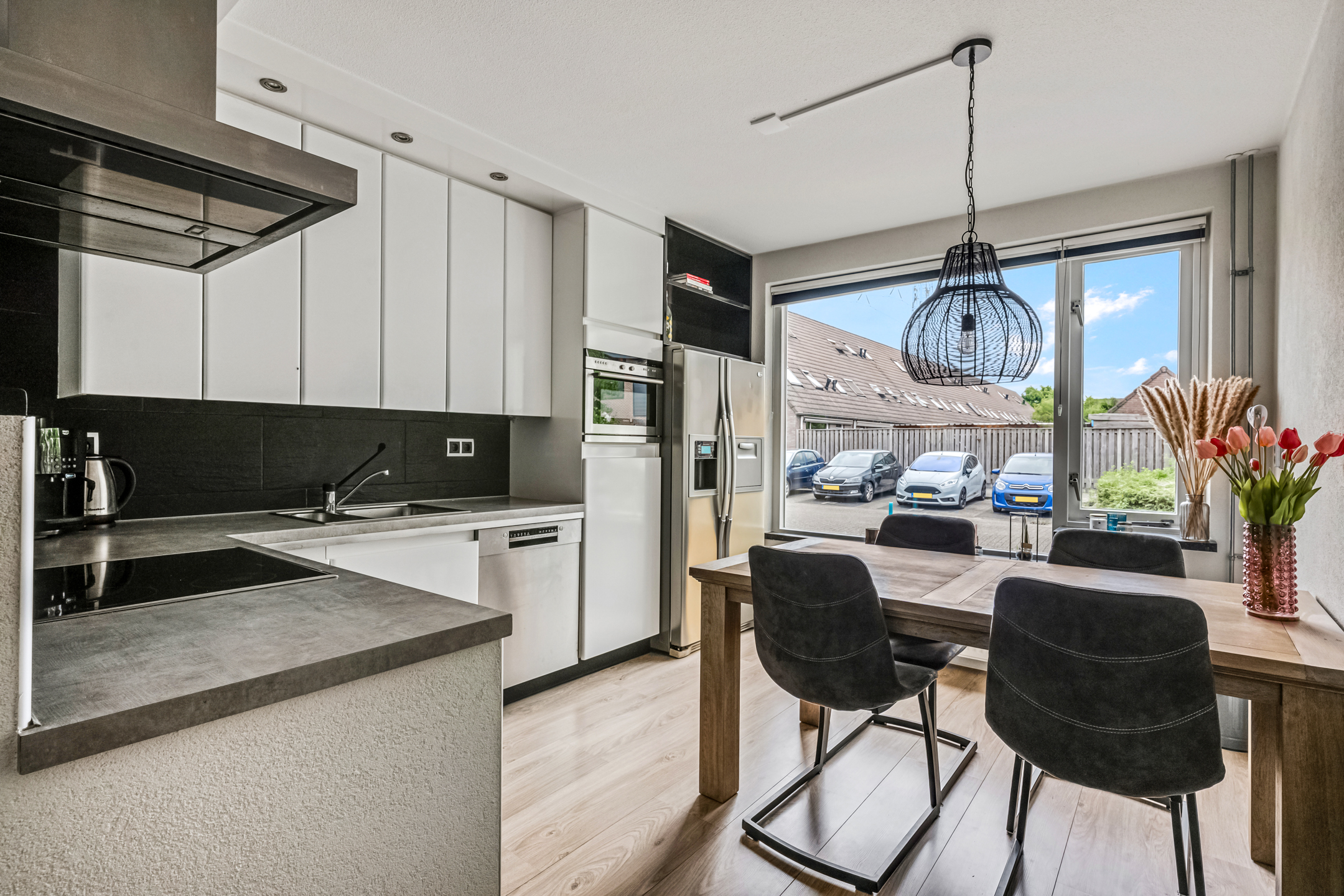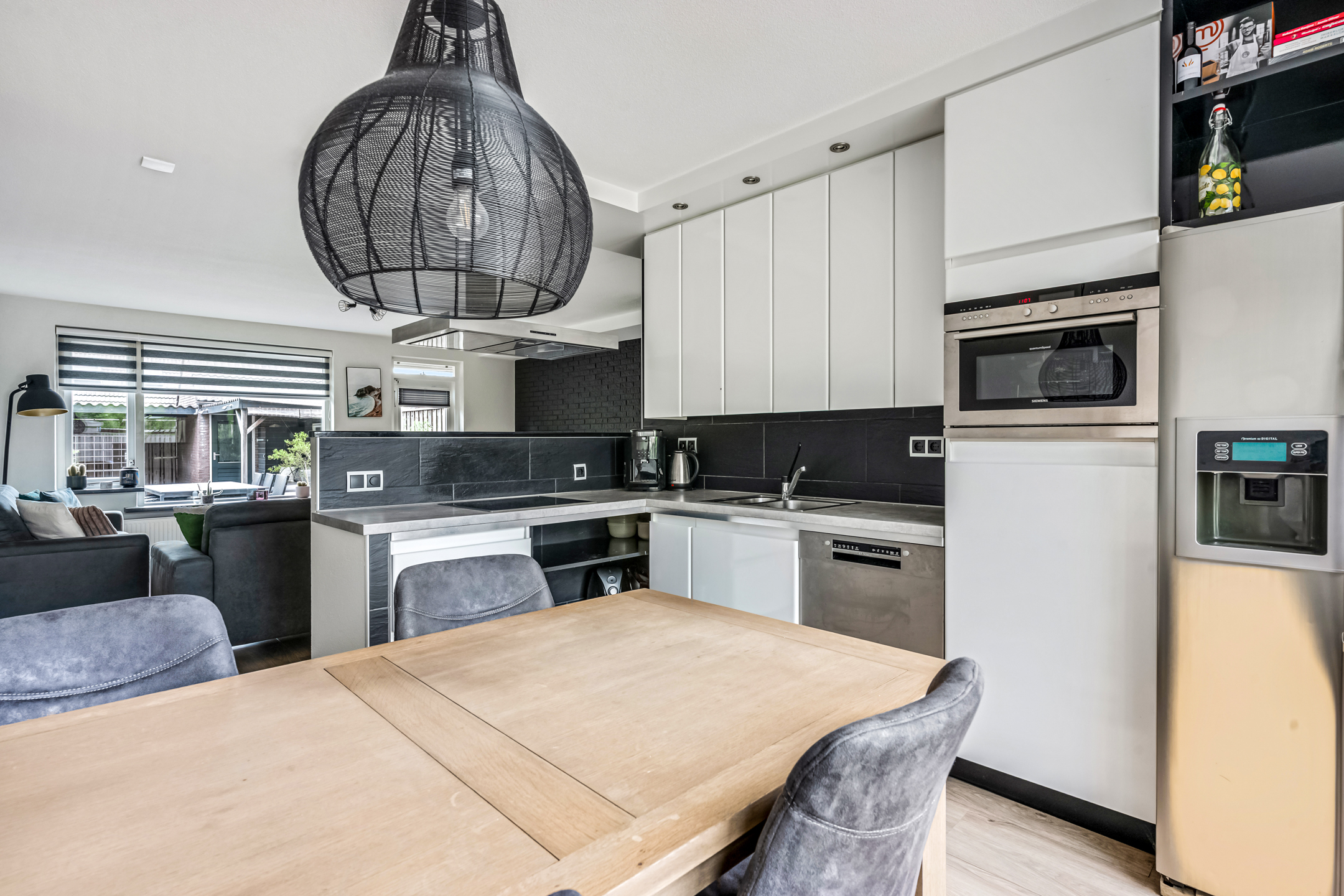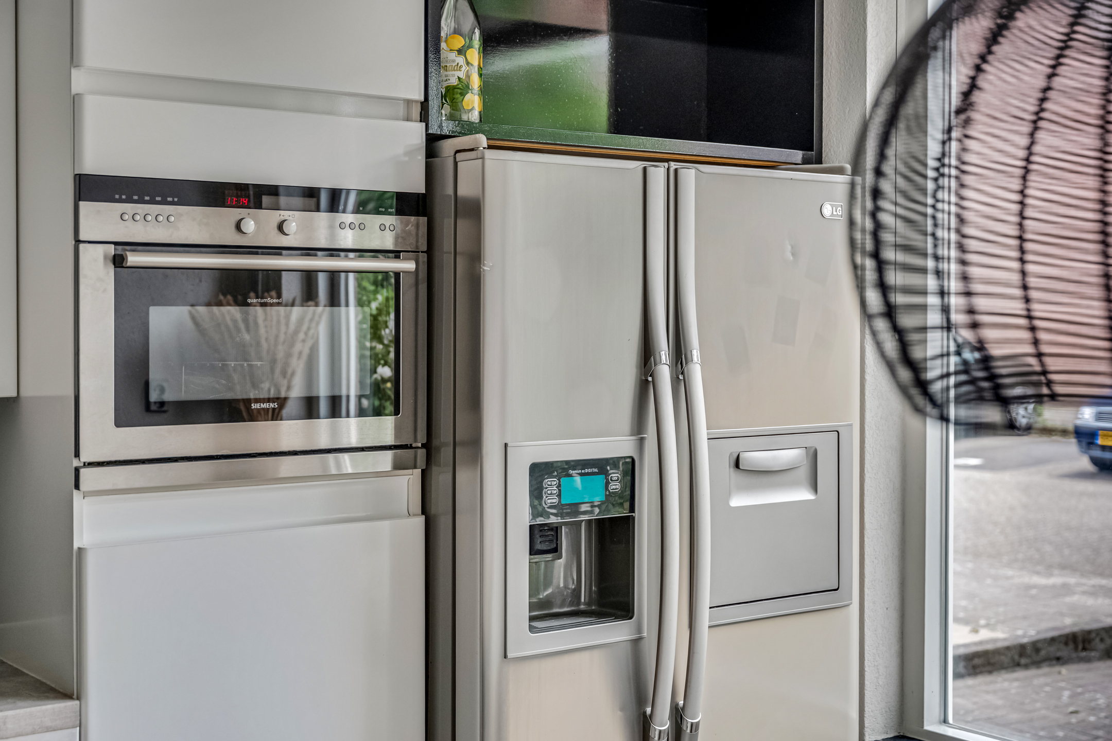 Door middel van een lage muur is de woonkamer gescheiden van de keuken, heb je wel een leuke doorkijk van voor naar achteren. De eigentijdse keuken is uitgevoerd in een praktische hoekopstelling en voorzien van diverse inbouwapparatuur. Denk aan een 4-pits inductiekookplaat met afzuigkap, een 1,5 spoelbak, een combi-oven, een vaatwasser en een royale Amerikaanse koelkast met koel- én vriesgedeelte. Dankzij de vele opbergkasten heb je meer dan genoeg ruimte voor al je keukengerei en bakspullen. In de keuken bevindt zich tevens de eetruimte, waar je gemakkelijk een grote eettafel kwijt kunt. Een fijne plek om samen te ontbijten, uitgebreid te dineren of gezellig na te tafelen.